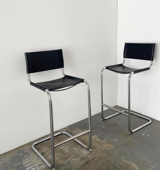 - Pair of Black Leather and Chrome Cantilever Bar Stools