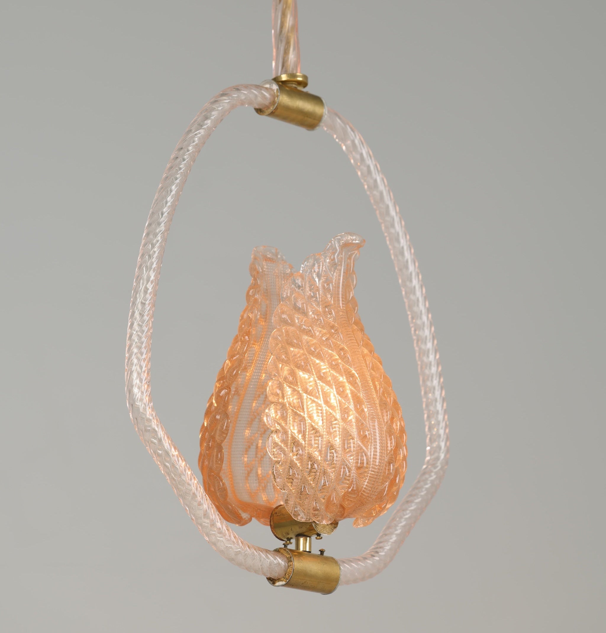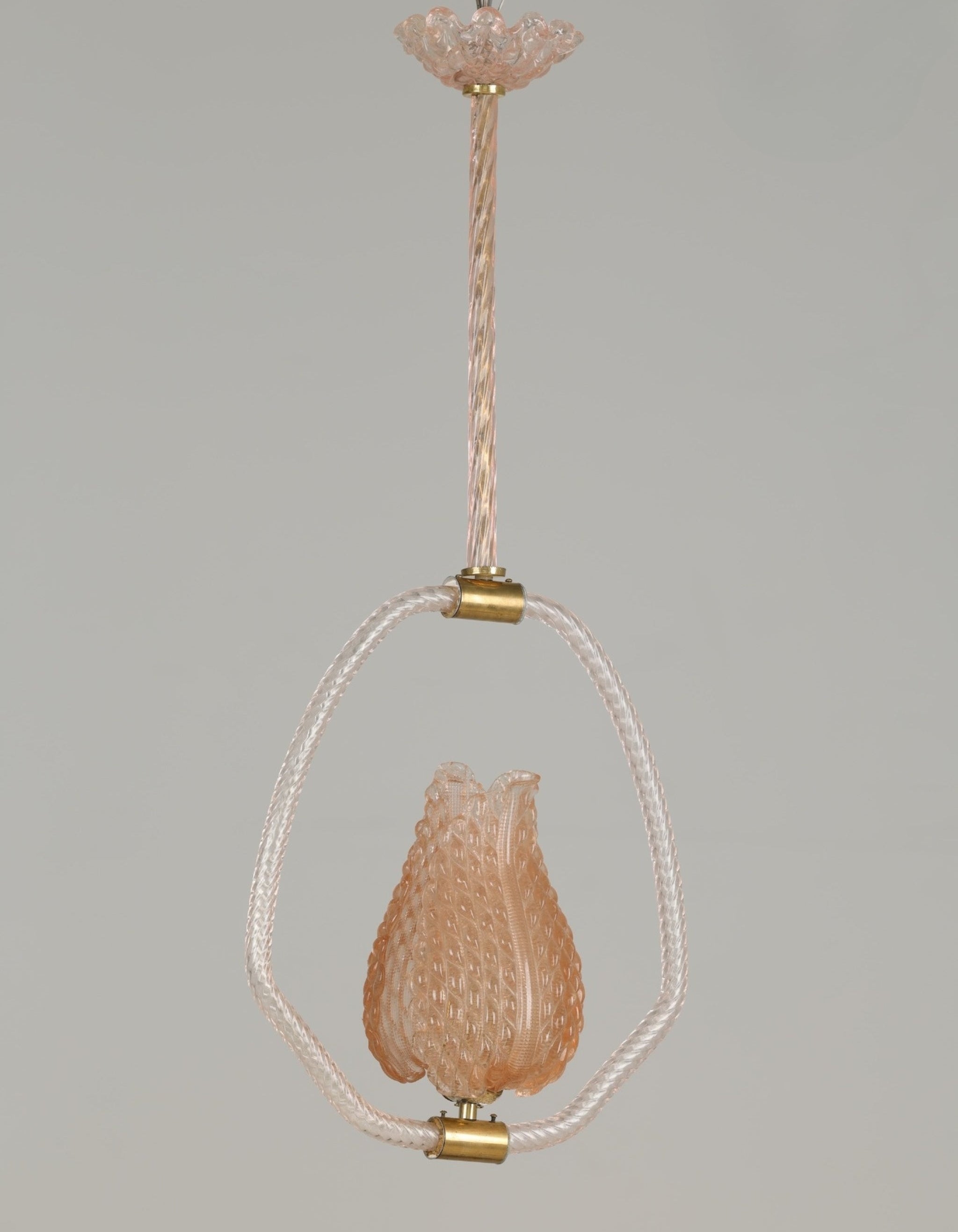 Pink Murano ceiling pendant by Barovier, c. 1940s. A sculpted leaf form gently cups the glass globe, its latticed surface casting a soft, diffused glow. The piece is finished with Barovier’s signature twisted ribbon frame and stem, warm brass fittings and matching ceiling cup.