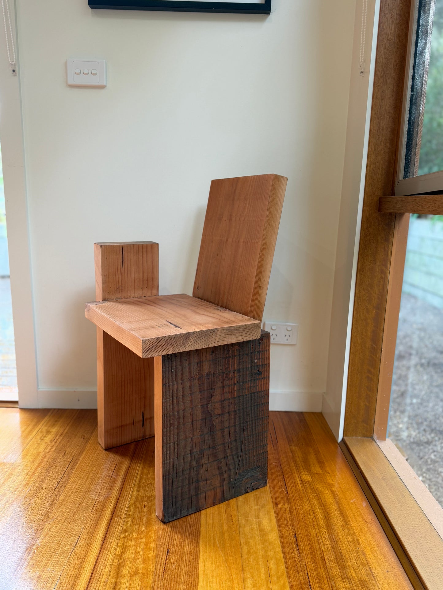 Decorative chair/side table made out of Oregon, suited as a side table or object as they aren’t a very comfortable seat and might not feel that stable.