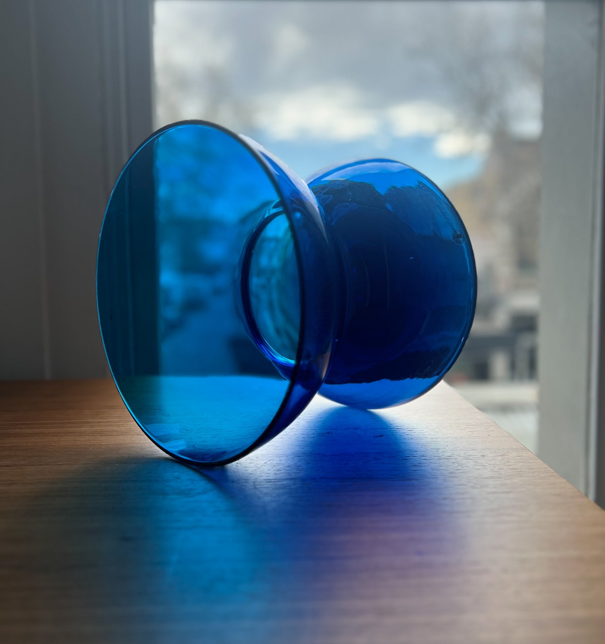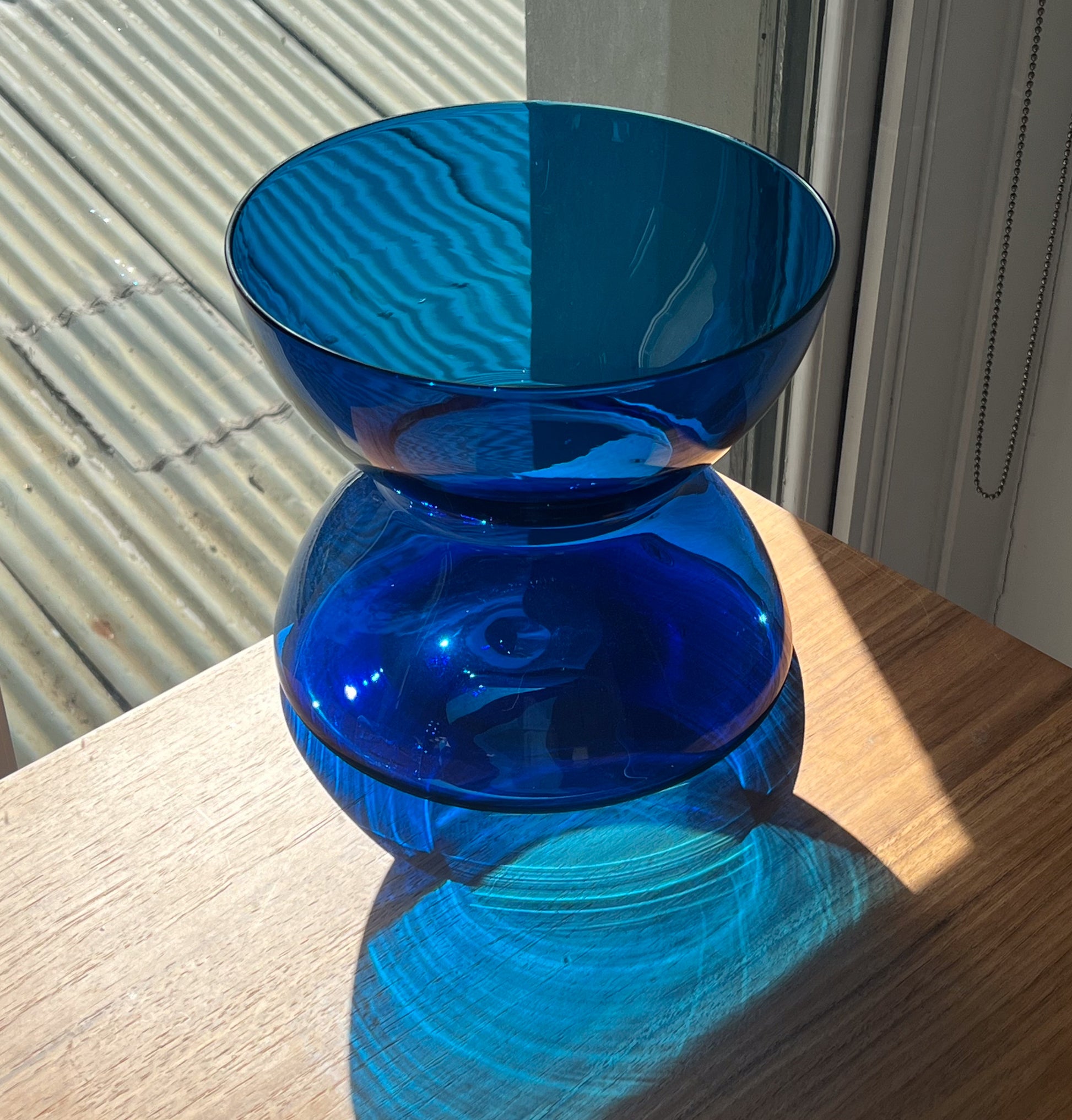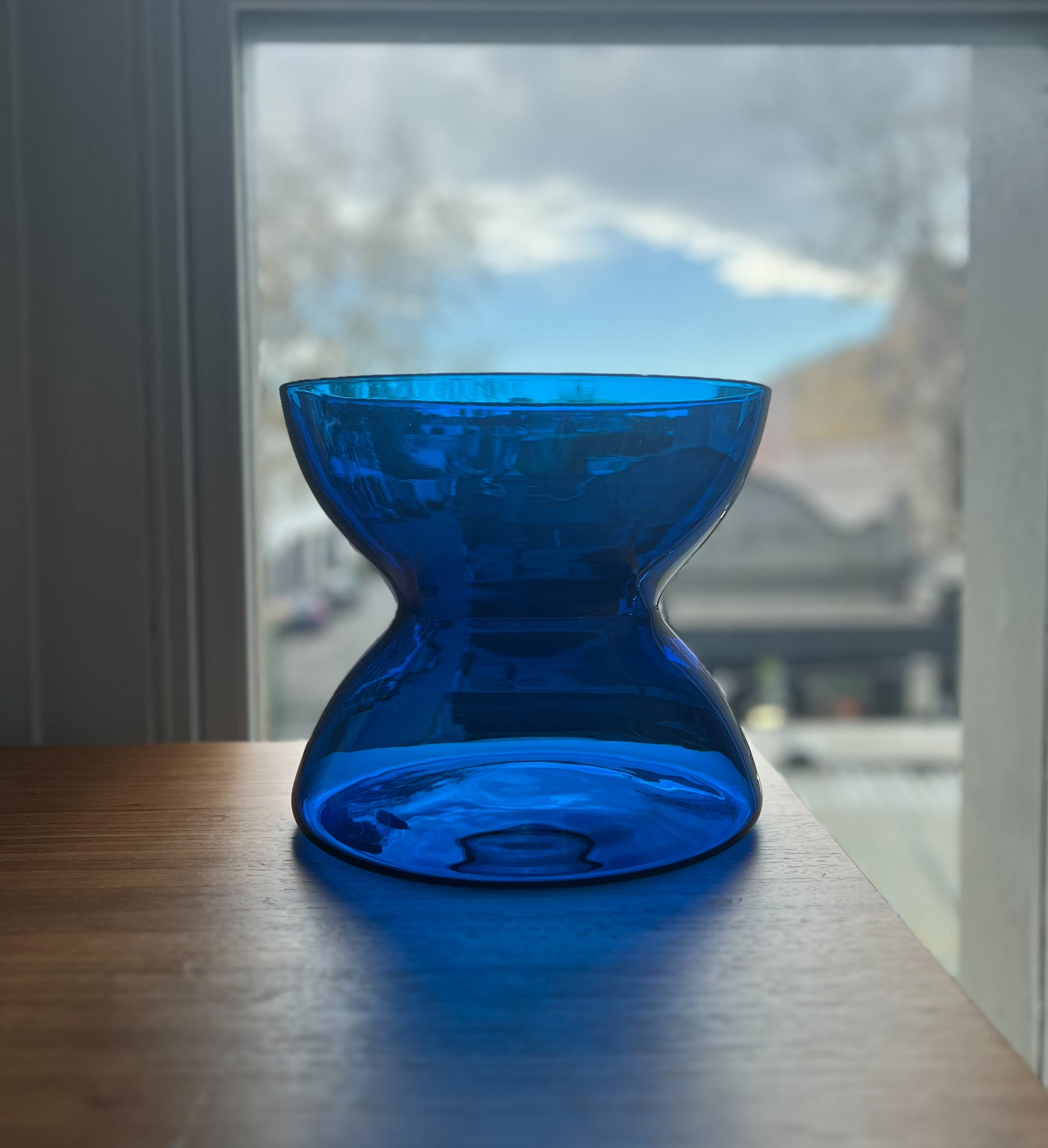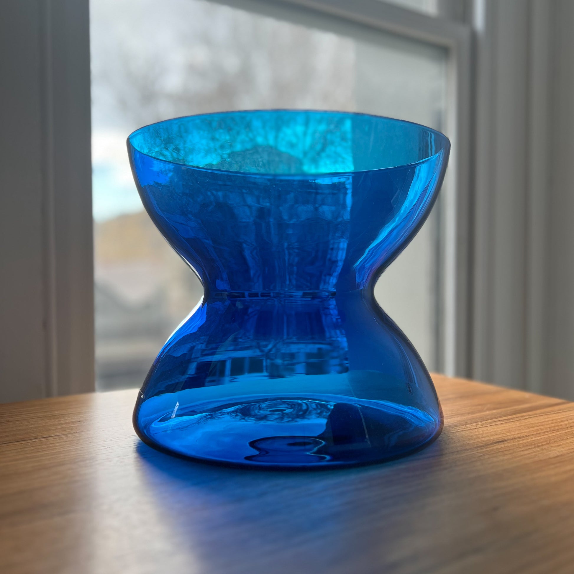 Part of the 1990's Stockholm Series for IKEA, the Diablo Vase by Swedish designer Anne Nilsson, is a sculptural, poised piece. The XL hourglass vase is hand-made in heavy cobalt blue, holding flowers effortlessly