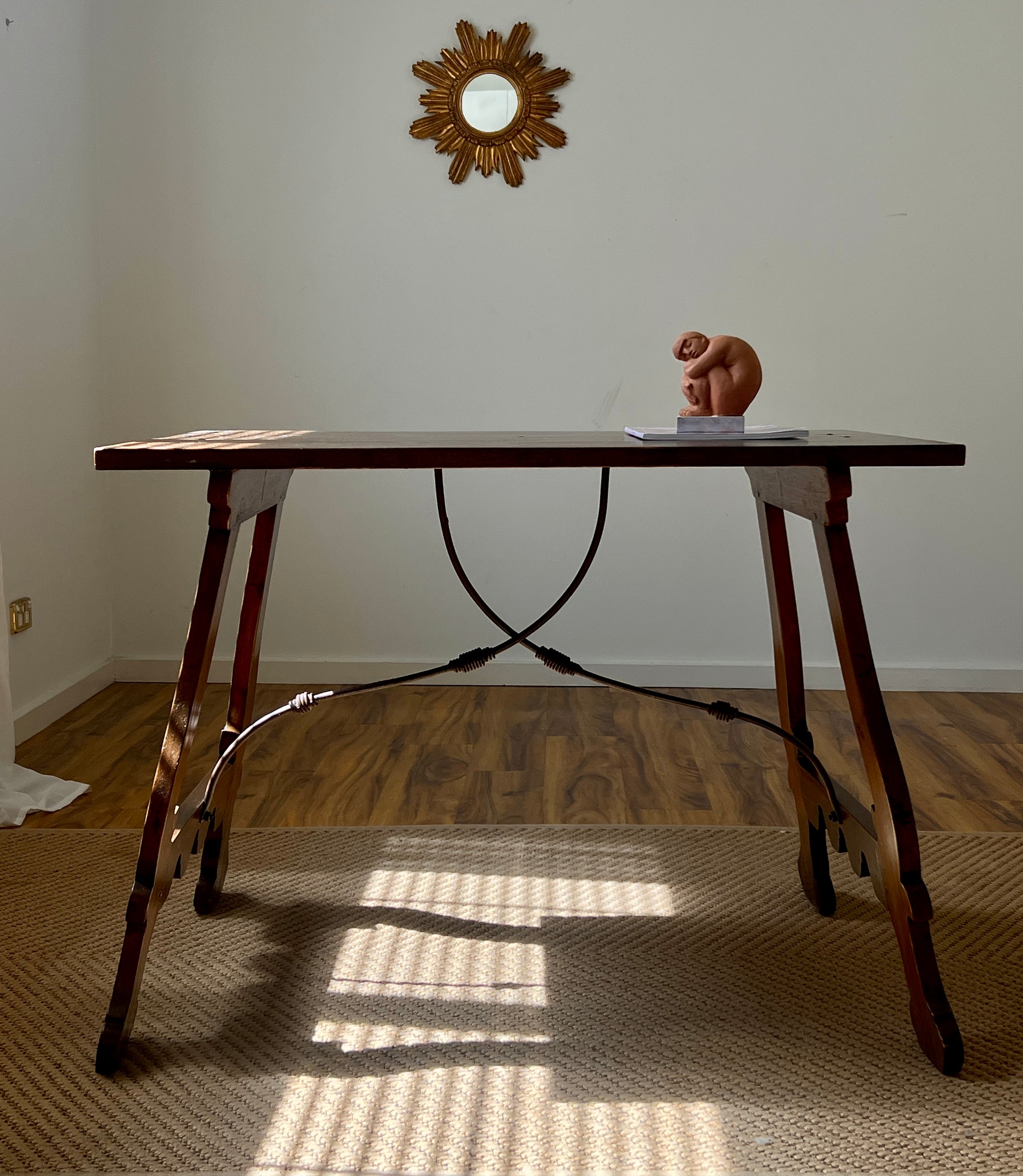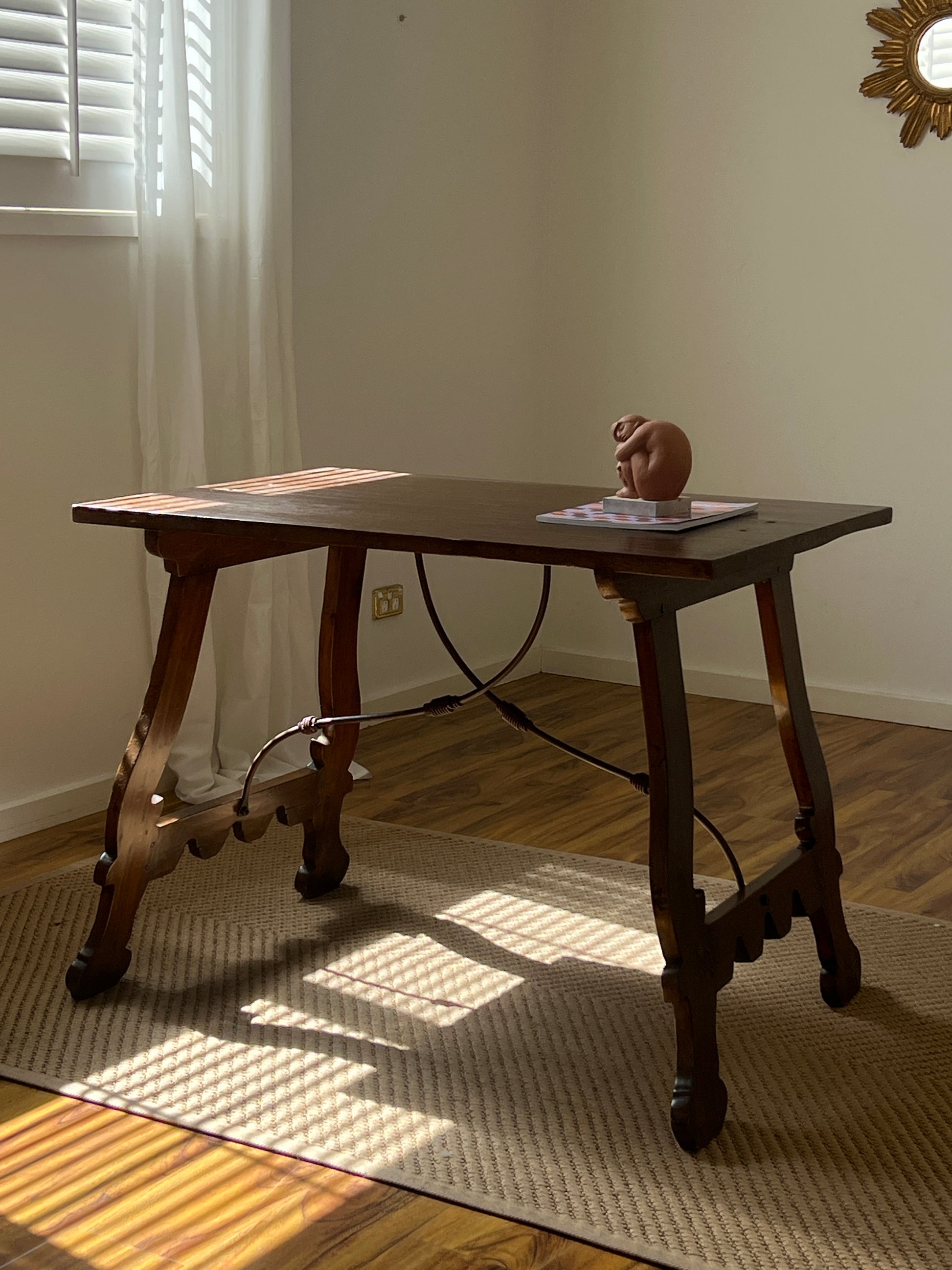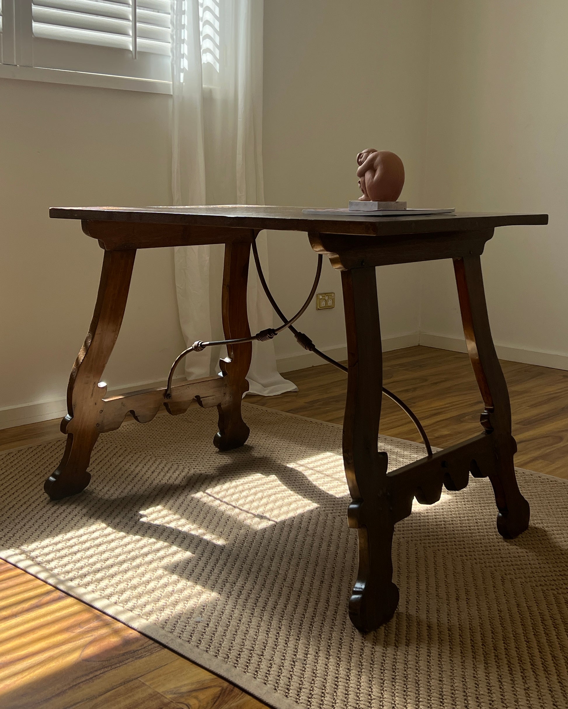 Antique Spanish refectory table in the baroque manner. A versatile size, perfect as a console table or compact desk. The rectangular plank top above sits on shaped legs joined by iron stretchers.