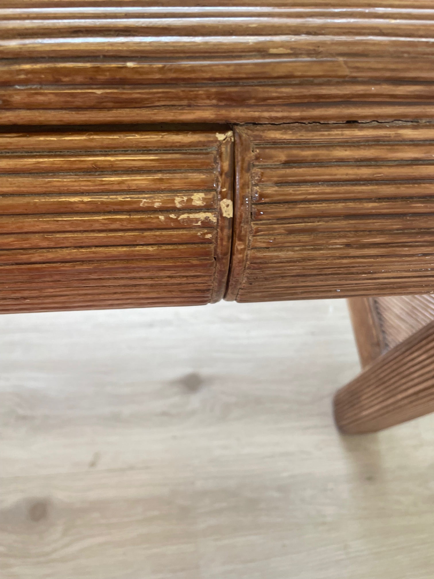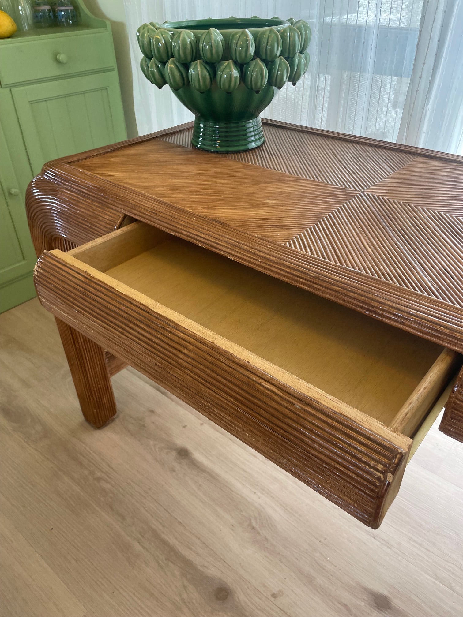 A beautifully crafted vintage reed bamboo desk featuring a striking geometric top with finely ribbed detailing. Rich in texture and warmth, this piece brings an effortless coastal–modernist feel, balancing natural materials with strong, architectural lines.