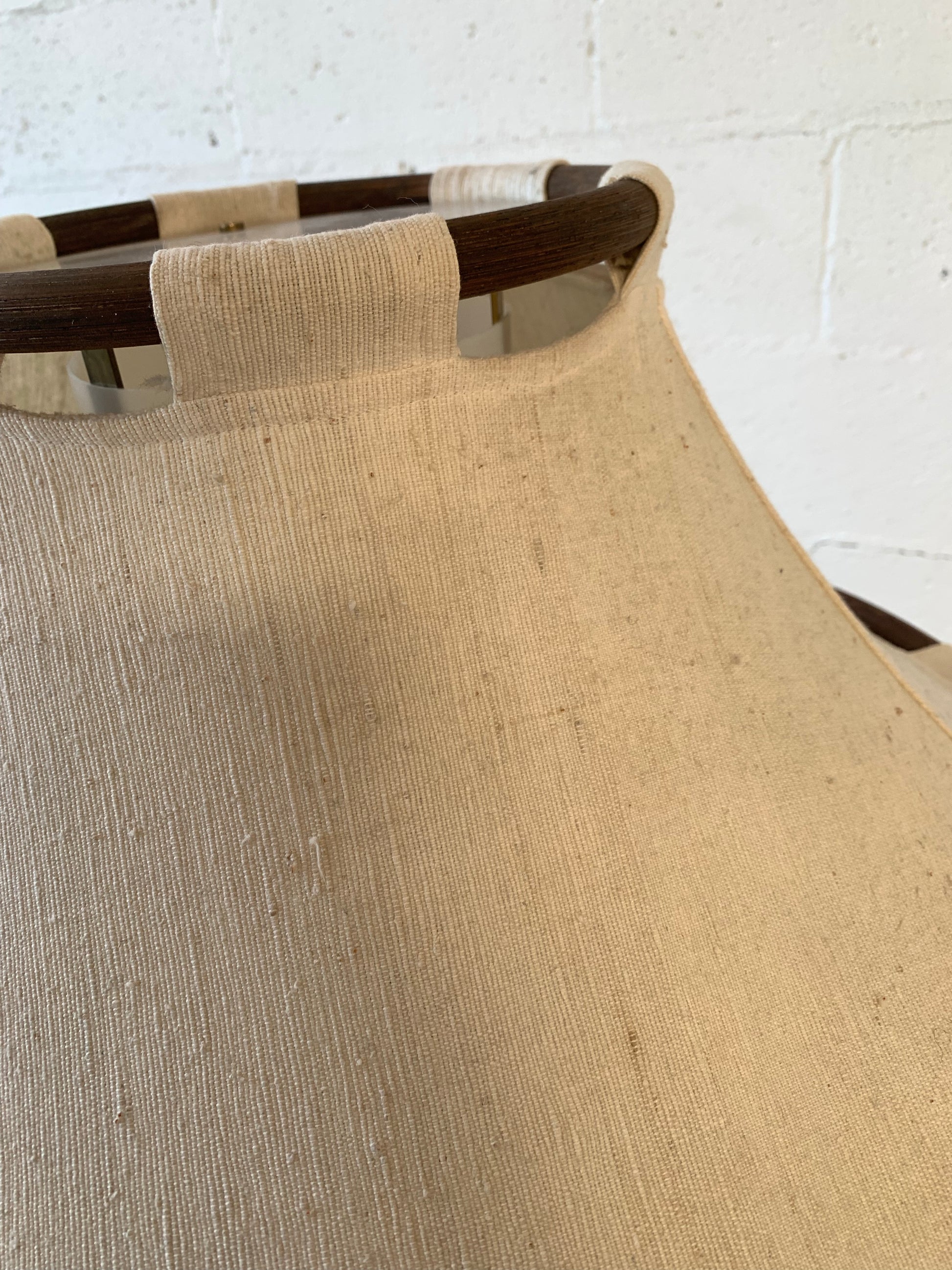 Good vintage condition; the lamp is gorgeous and presents beautifully. There are some imperfections that have informed its price: The fabric of the shade has some light marks. The frame of the shade is not a perfect circle and has some undulation. The screws at each foot need to be adjusted to the level of the floor, and on one foot there are some small foam pads, presumably for this same purpose (these can be removed if desired). Without these adjustments the lamp has a slight lean. Please refer to photos.