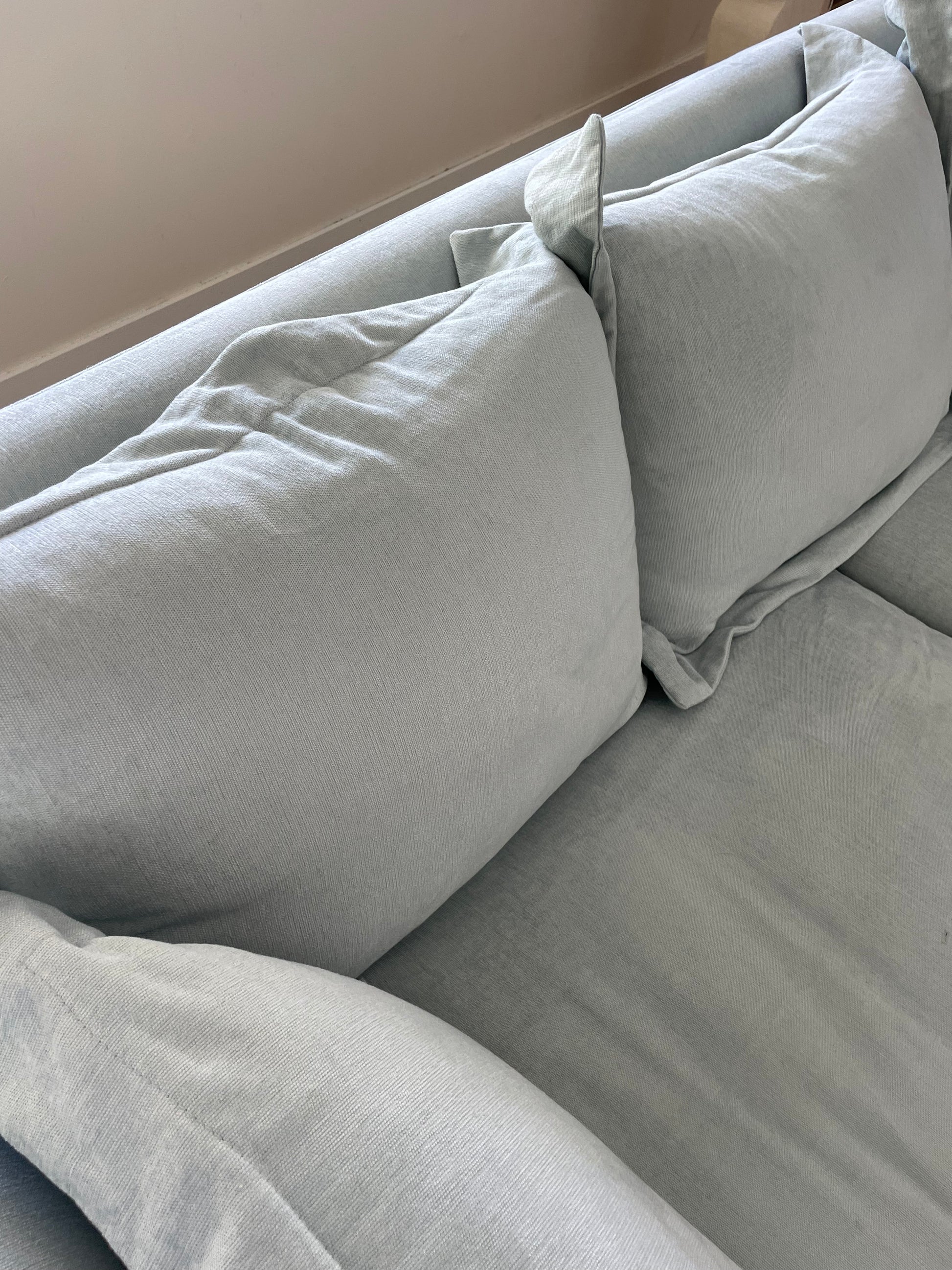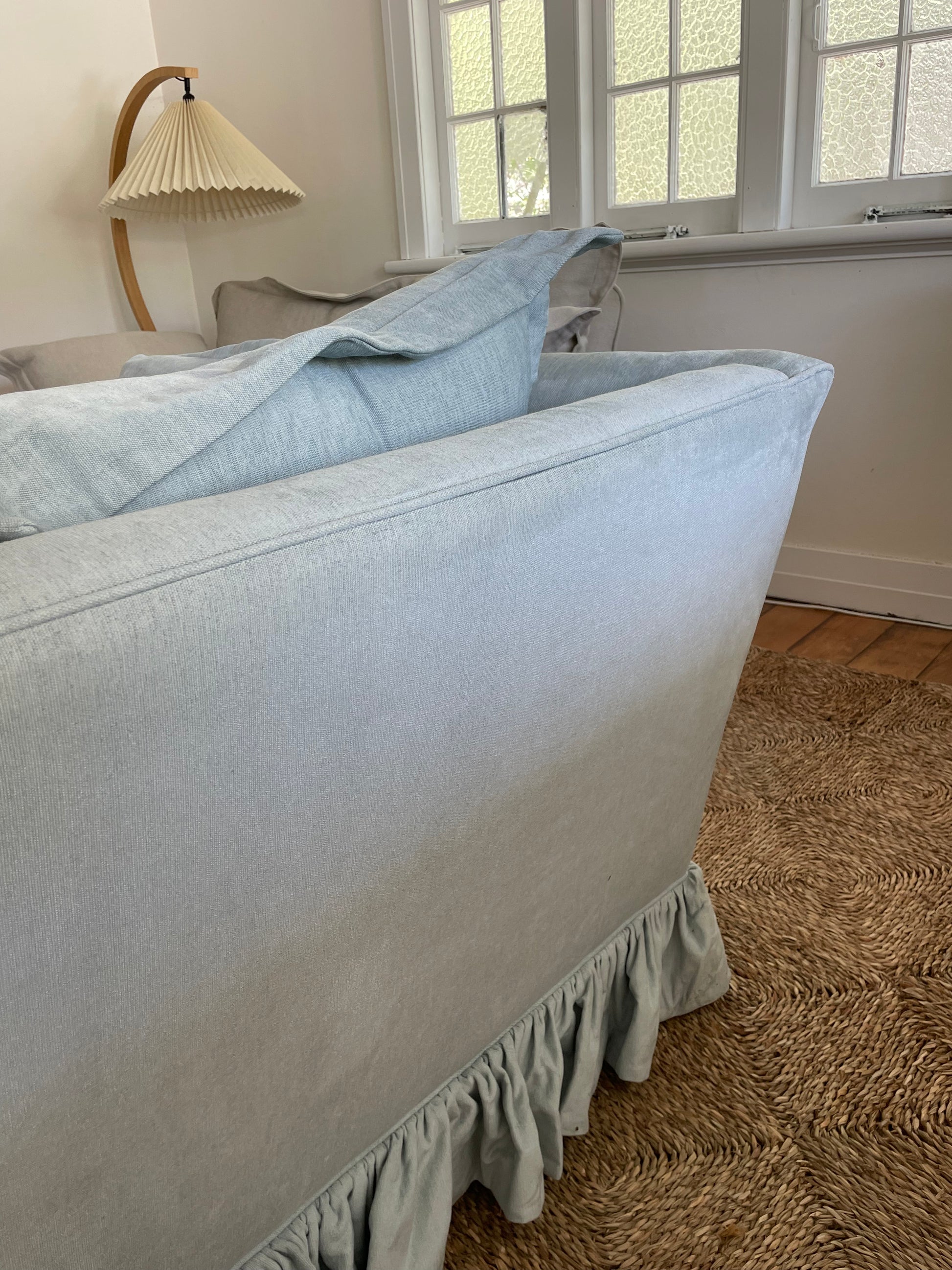 Recovered in a light blue Tesoro high quality linen fabric from Warwick.