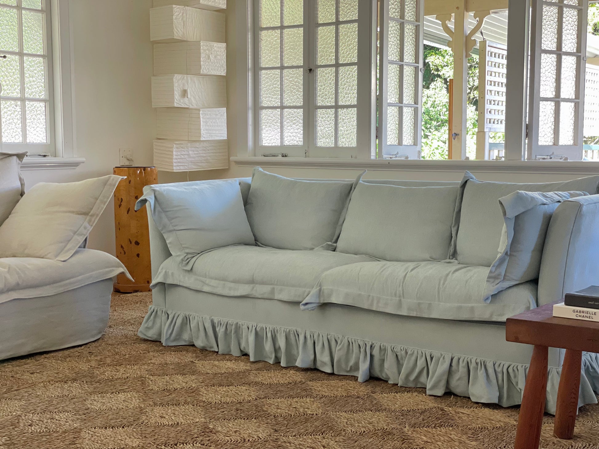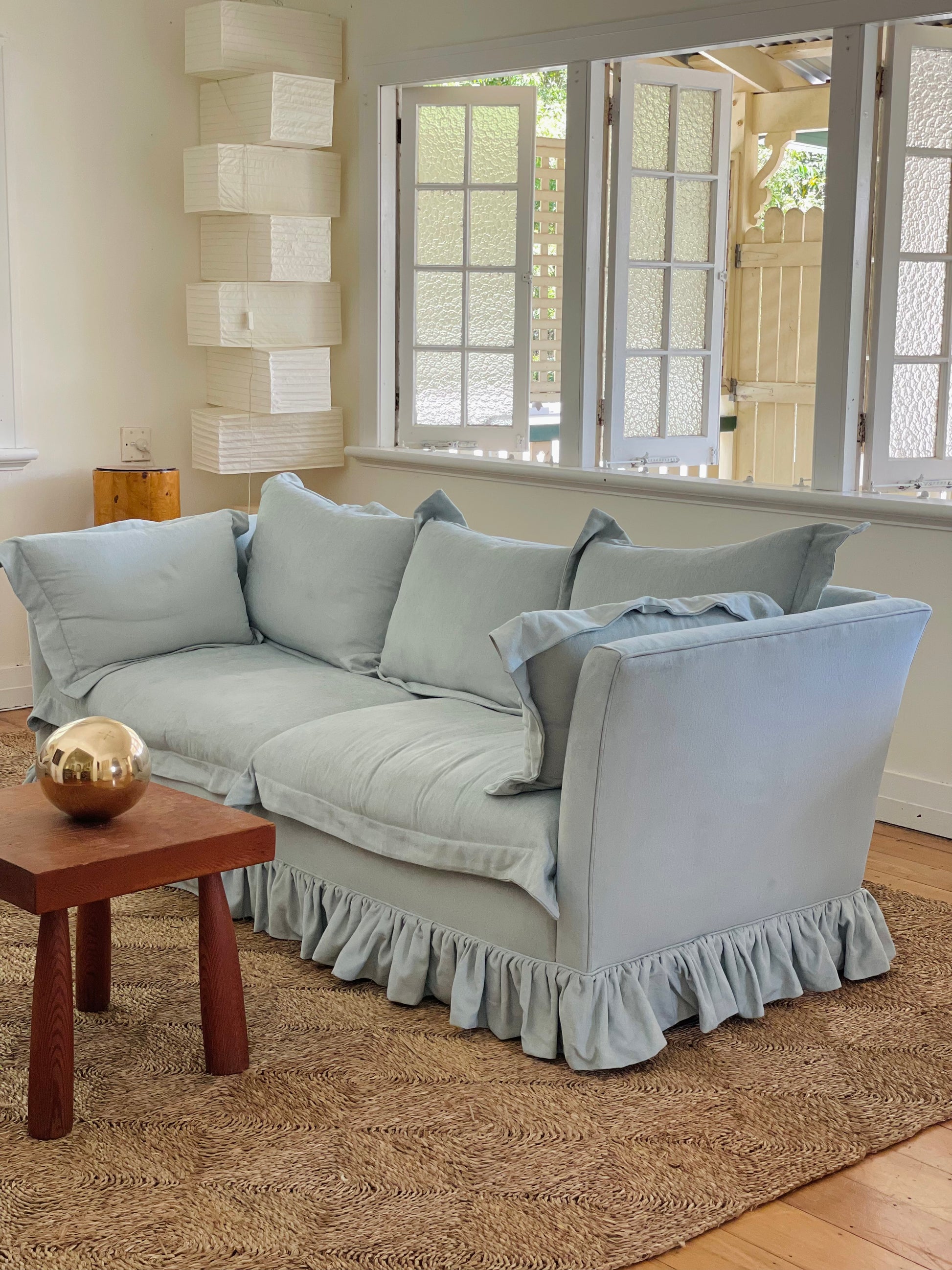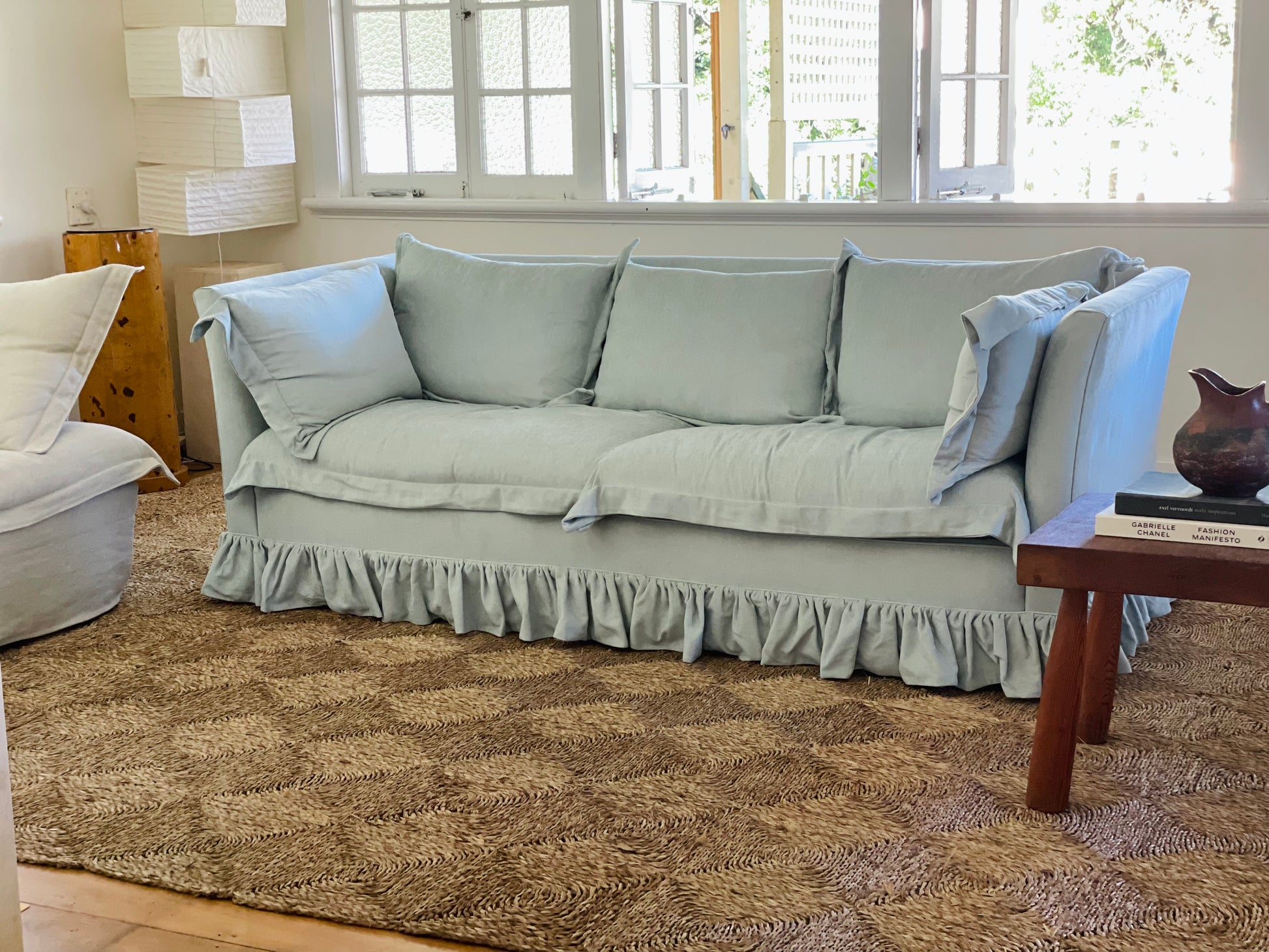 This beautifully made sofa is very comfortable. Down filled cushions with the pillow edge detail. A ruffle edge trimming on the base. This sofa doesn’t sit too low to the ground and has a great back support.