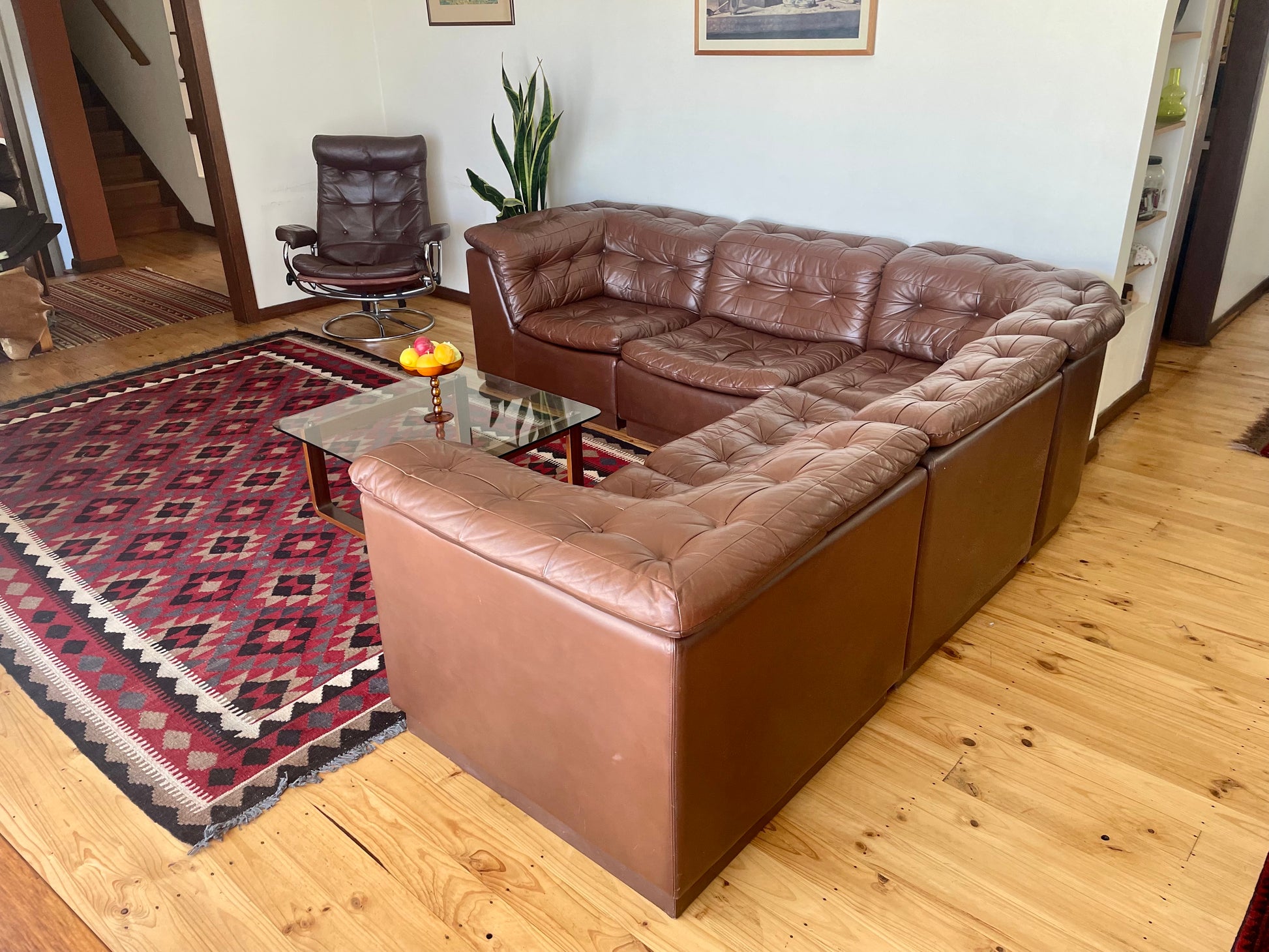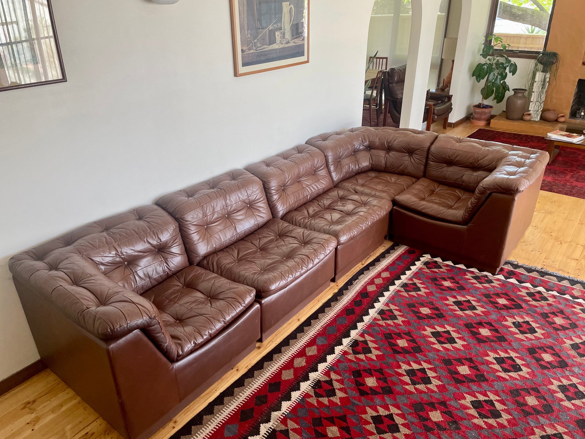 Corner sofa consisting of five modules upholstered in buttoned brown leather.