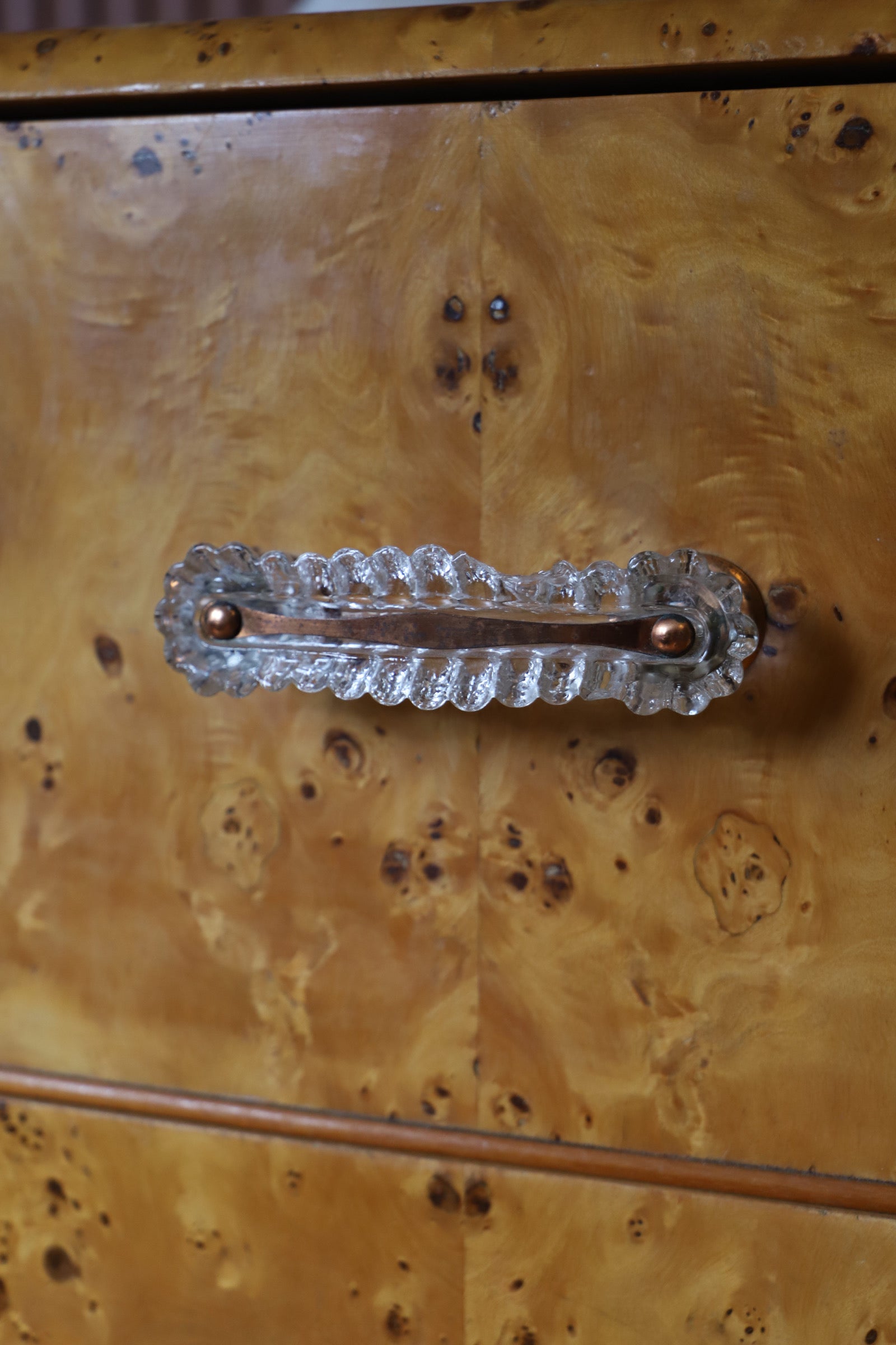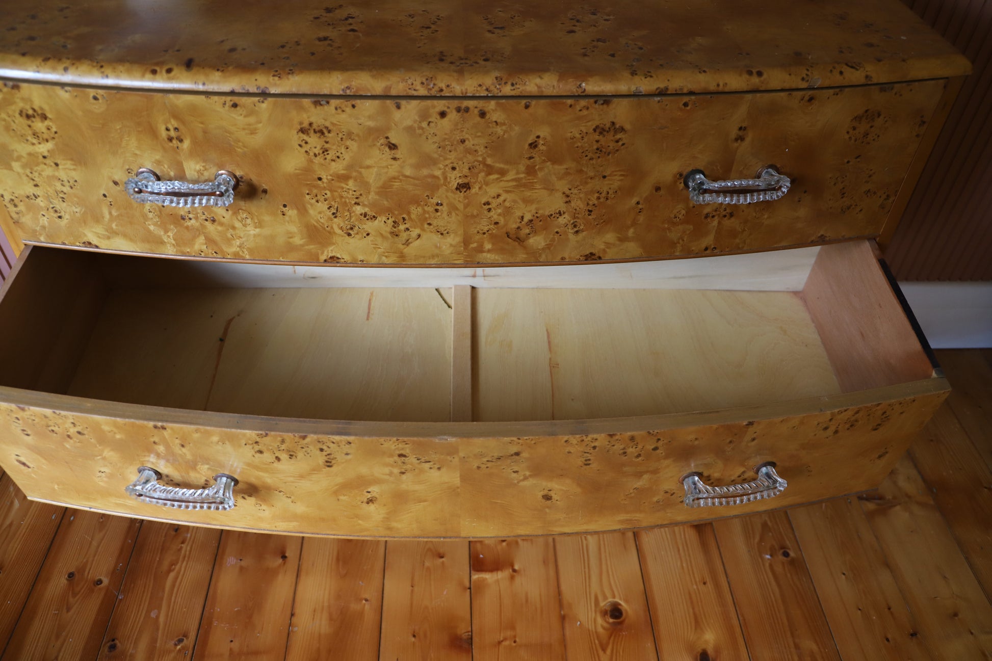 A beautiful tallboy deco burl veneer dresser with decorative handles and curvy shape. Also available, a matching low line dresser