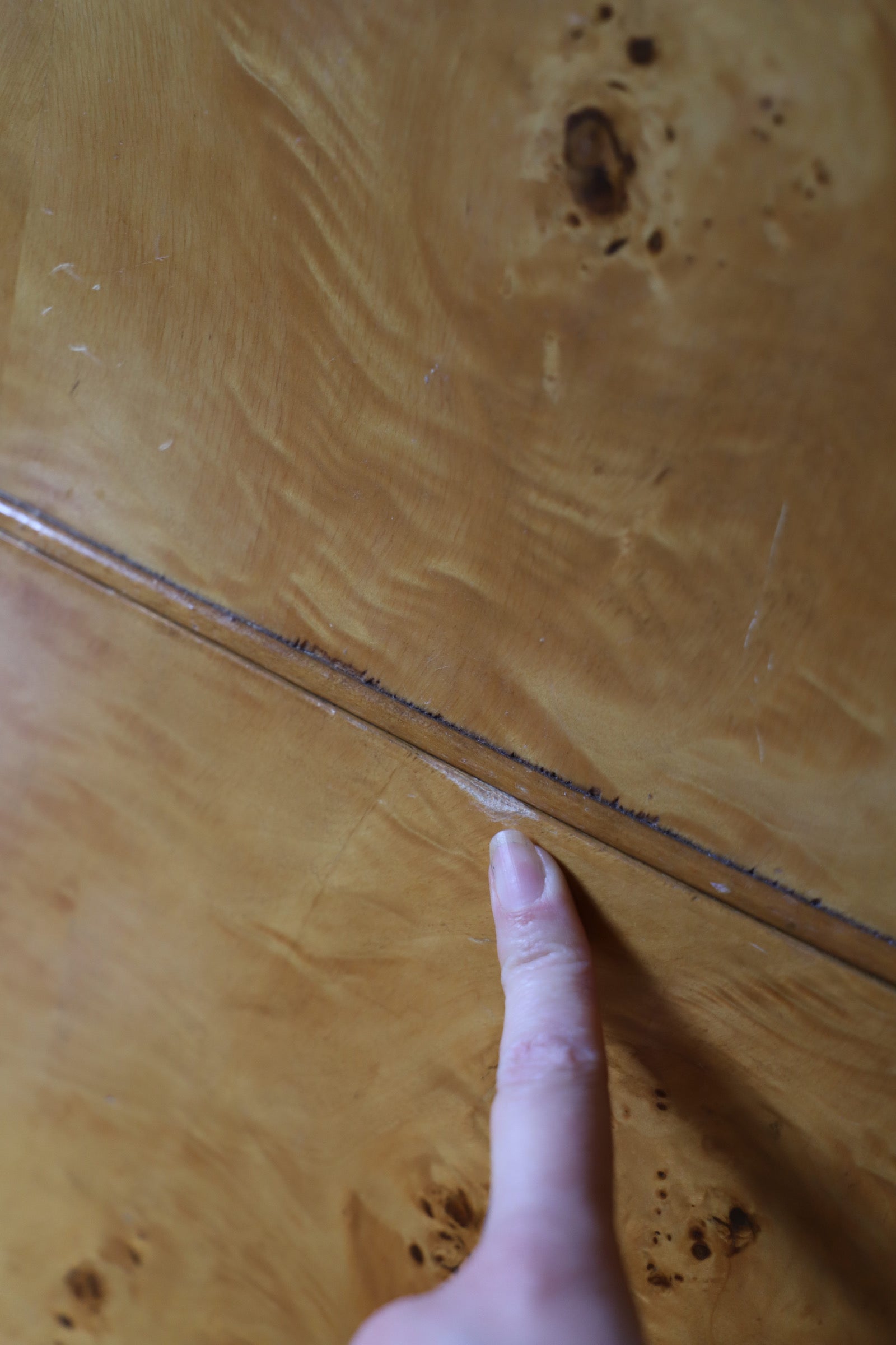 As a full unit, it looks great and due to the burl finish, a lot of the blemishes blend in and are not too noticeable. There are a few marks on the top and some small chips, the varnish has also dulled but it still looks lovely. The back feet don't have metal tips but you can only see that if you're down on the ground.