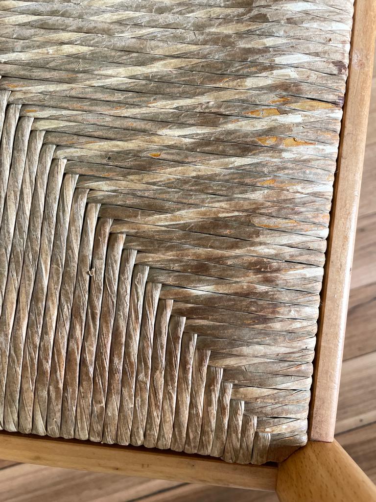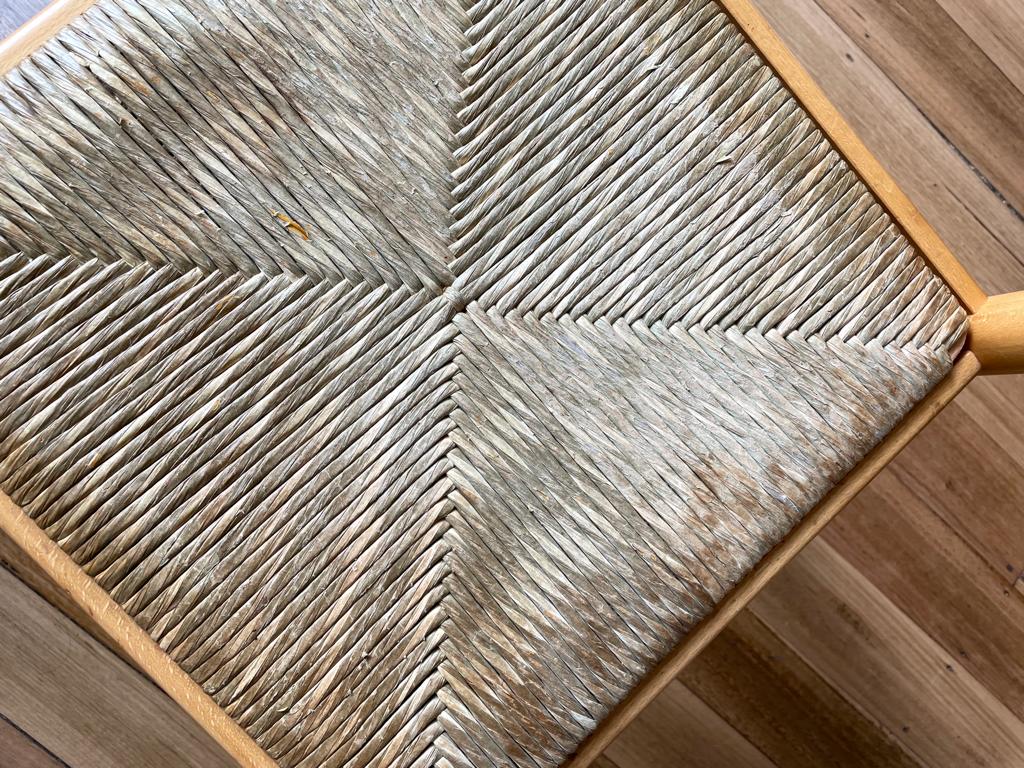 Seats and frames are strong but there are marks and tarnish to the wood and the lacquer has worn in places. The rush seats have some wear and staining but the latter is mostly to the underside so can’t be seen unless the chair is upside down. The screws from the front leg of one of the chairs are missing, but it is still sturdy.