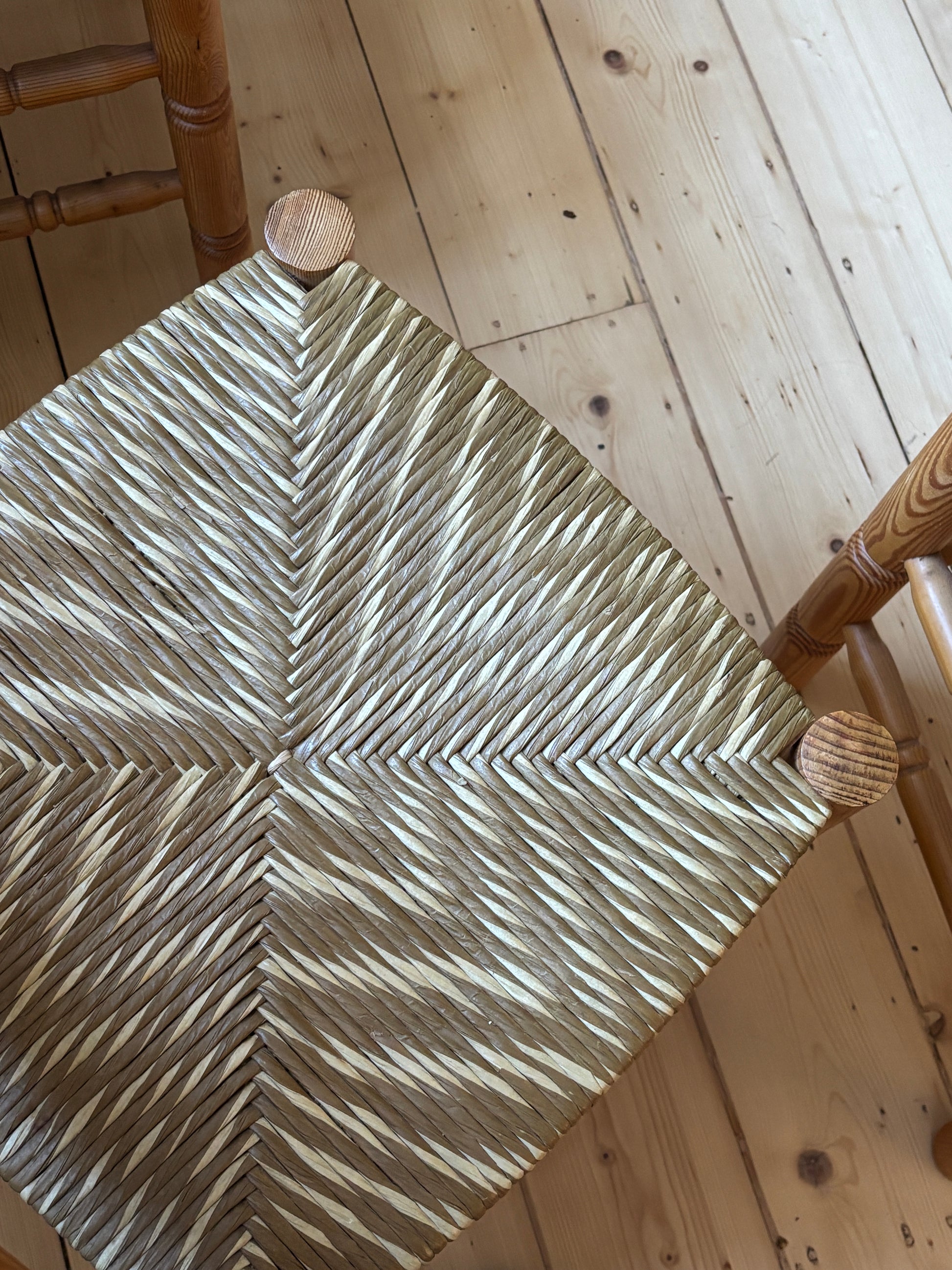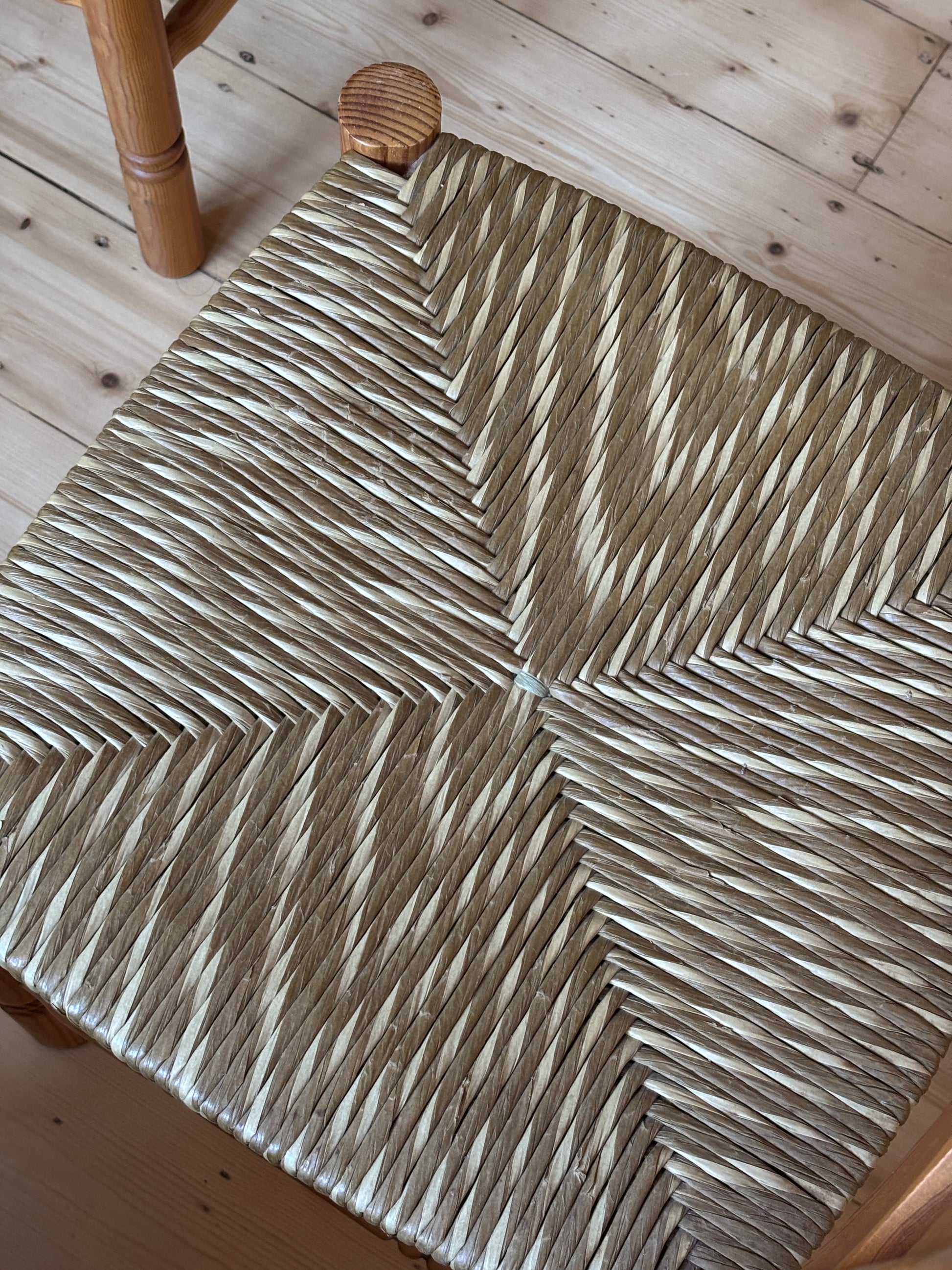 Set of Six Vintage Pine Dining Chairs. Beautiful set with lovely two-toned woven rush seats. Unique wavy back detail and legs.