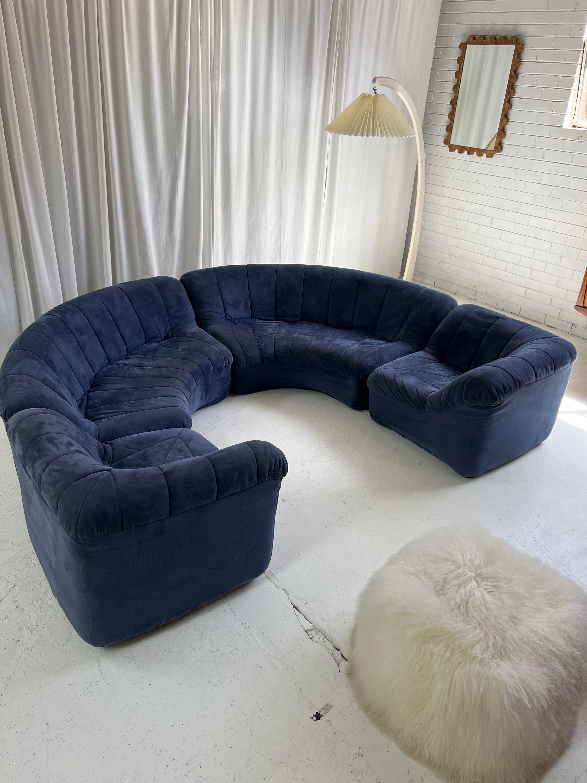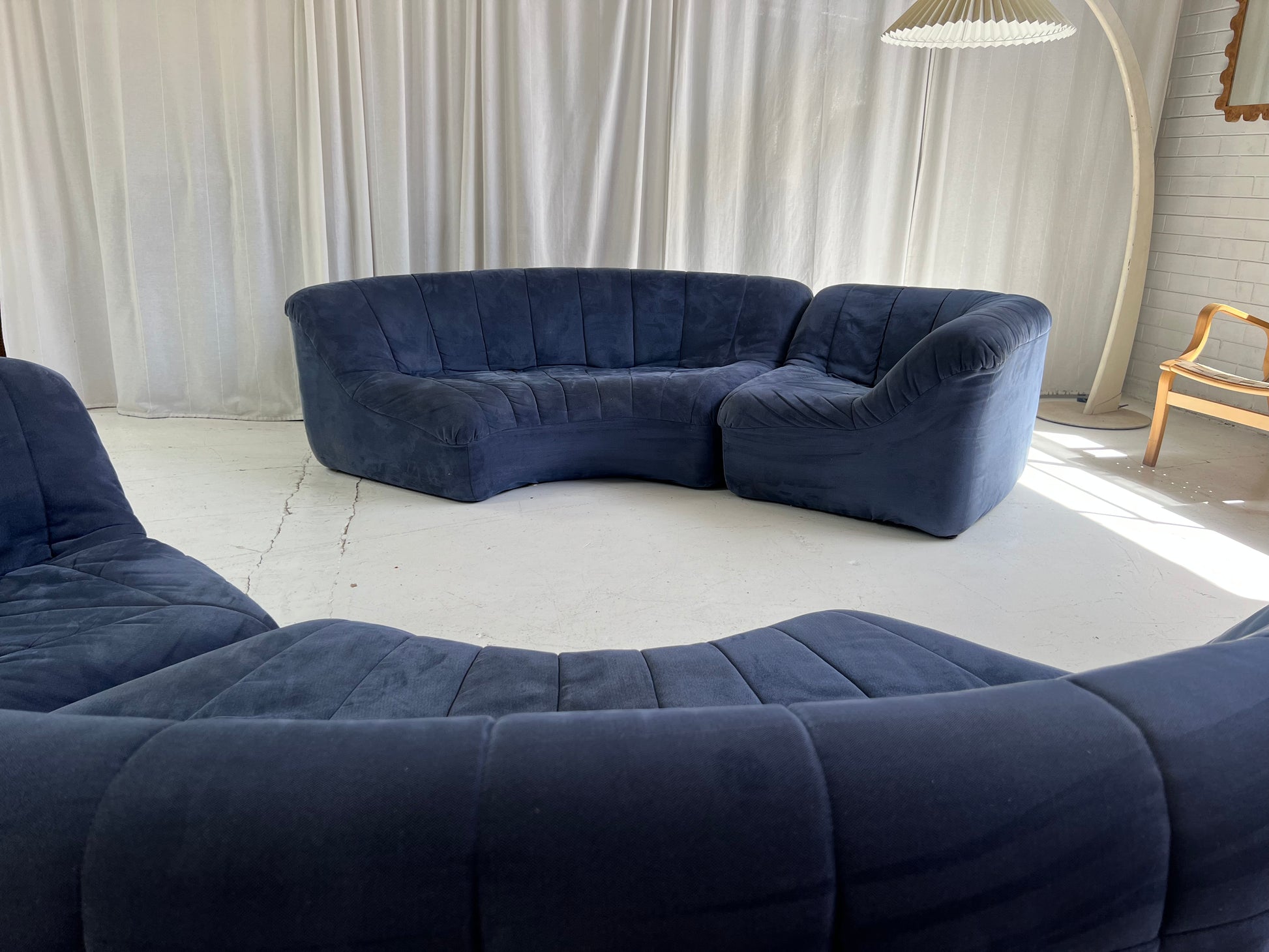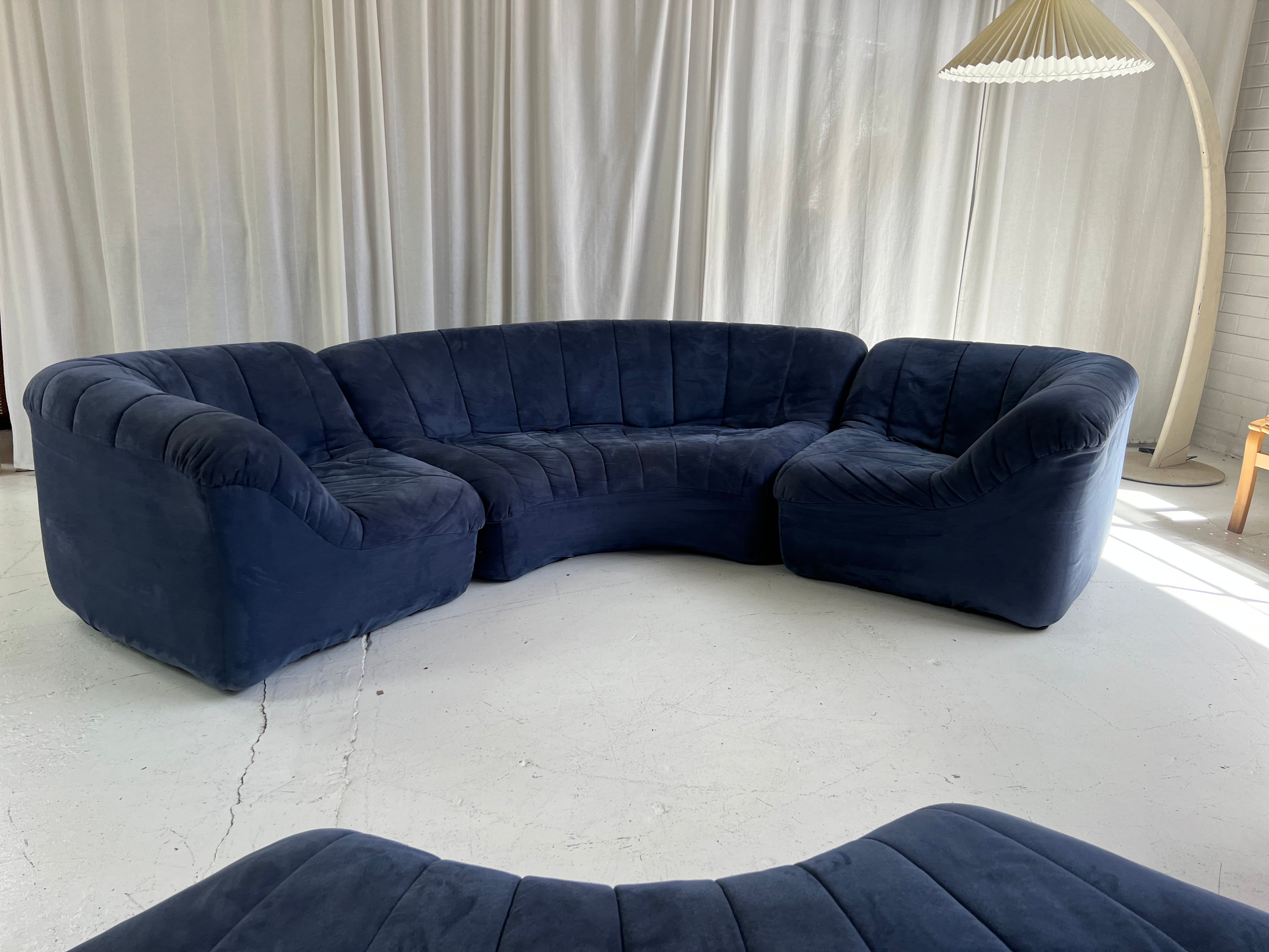 Highly collectable Featherston numero VII modular sofa, in original deep blue soft brushed cotton fabric with scalloping padded detail.