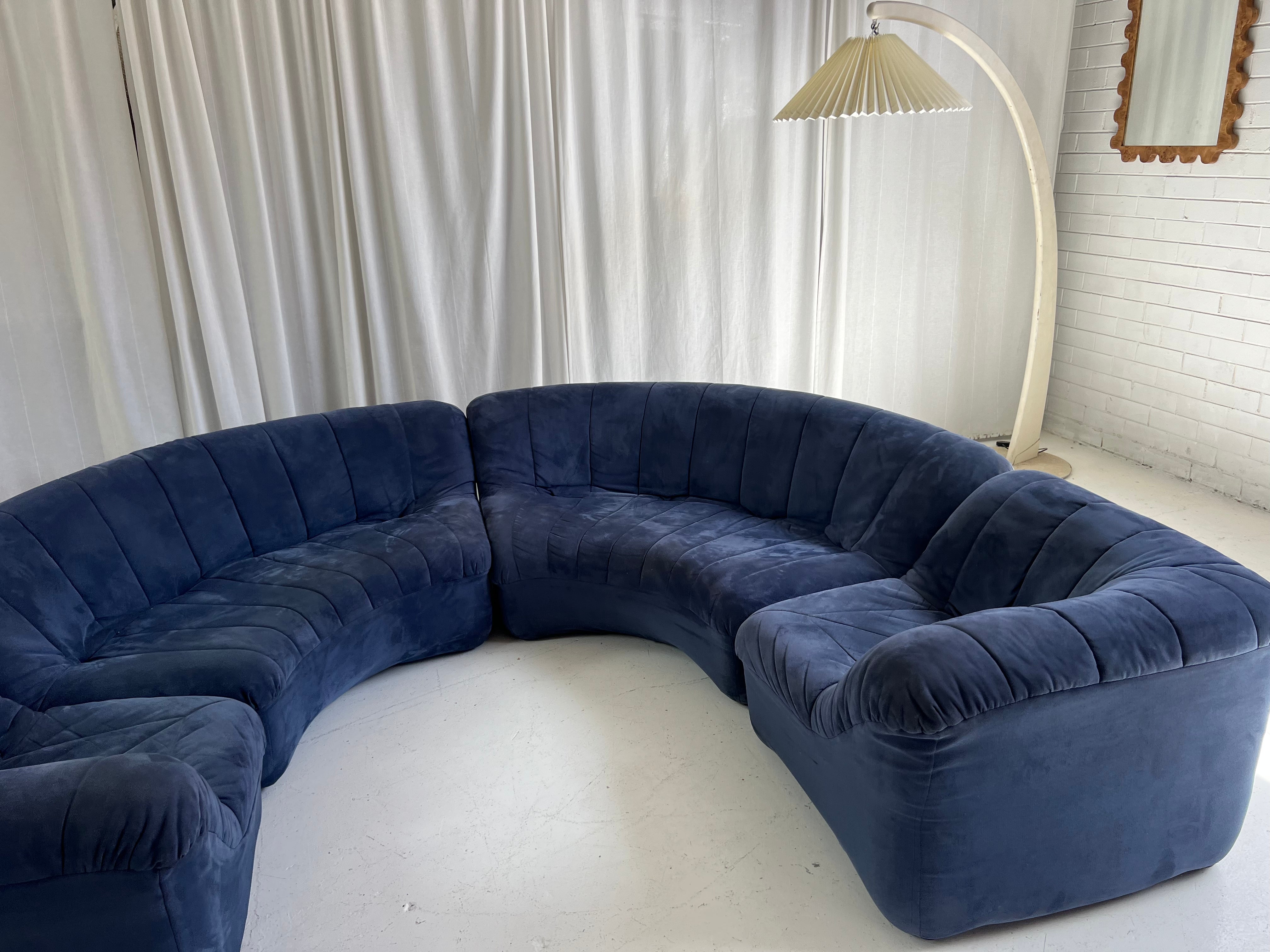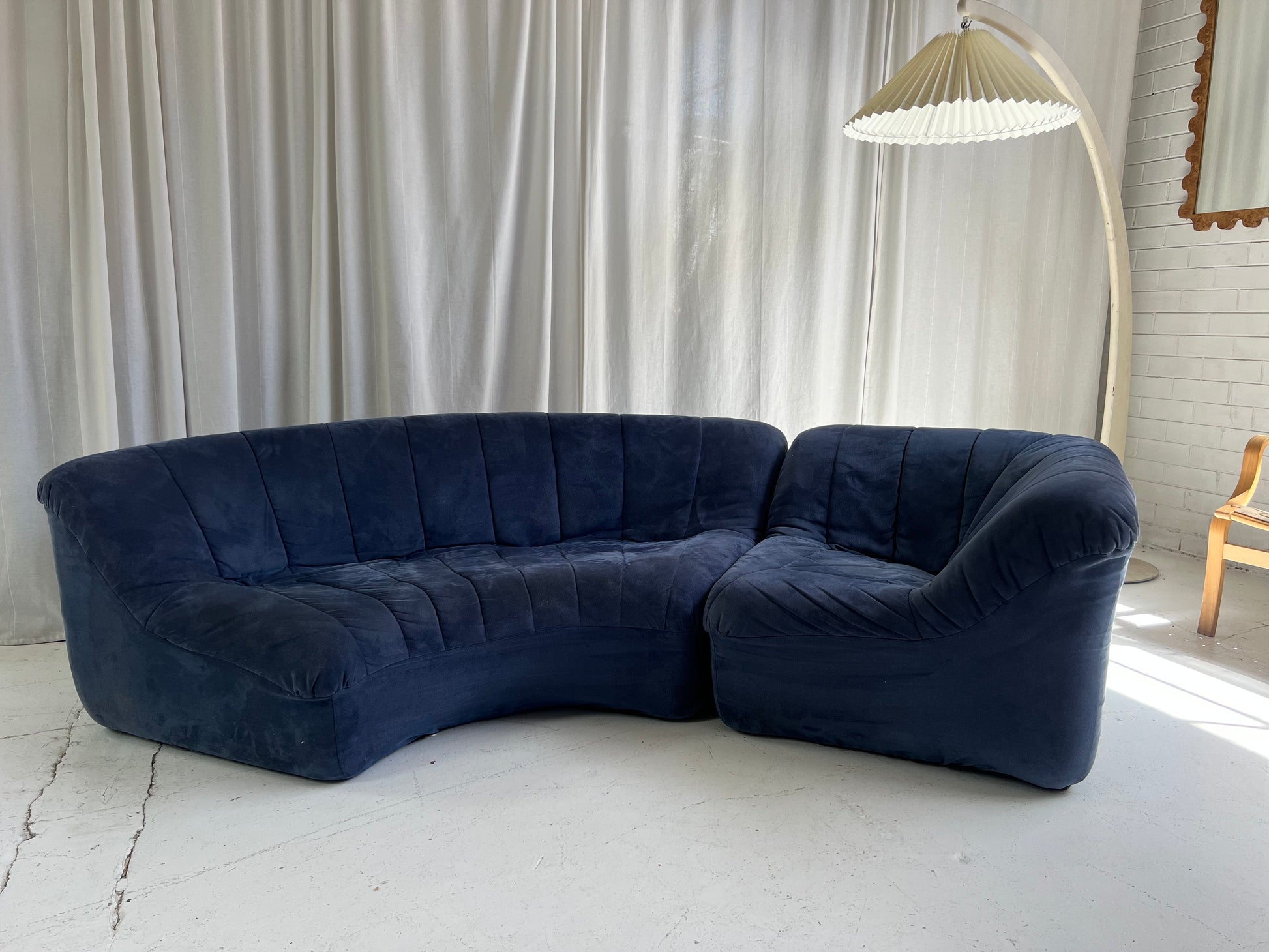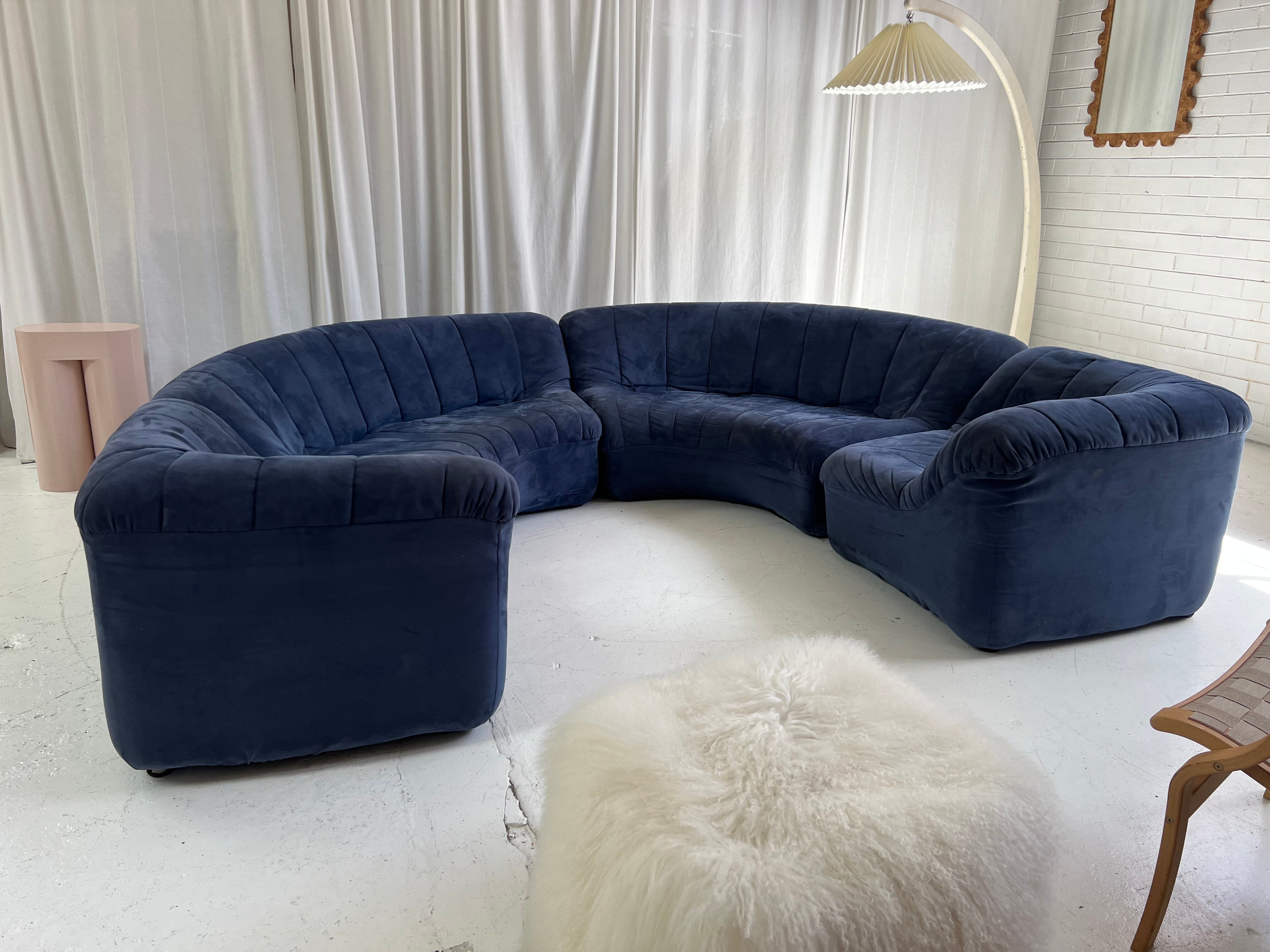 Highly collectable Featherston numero VII modular sofa, in original deep blue soft brushed cotton fabric with scalloping padded detail.