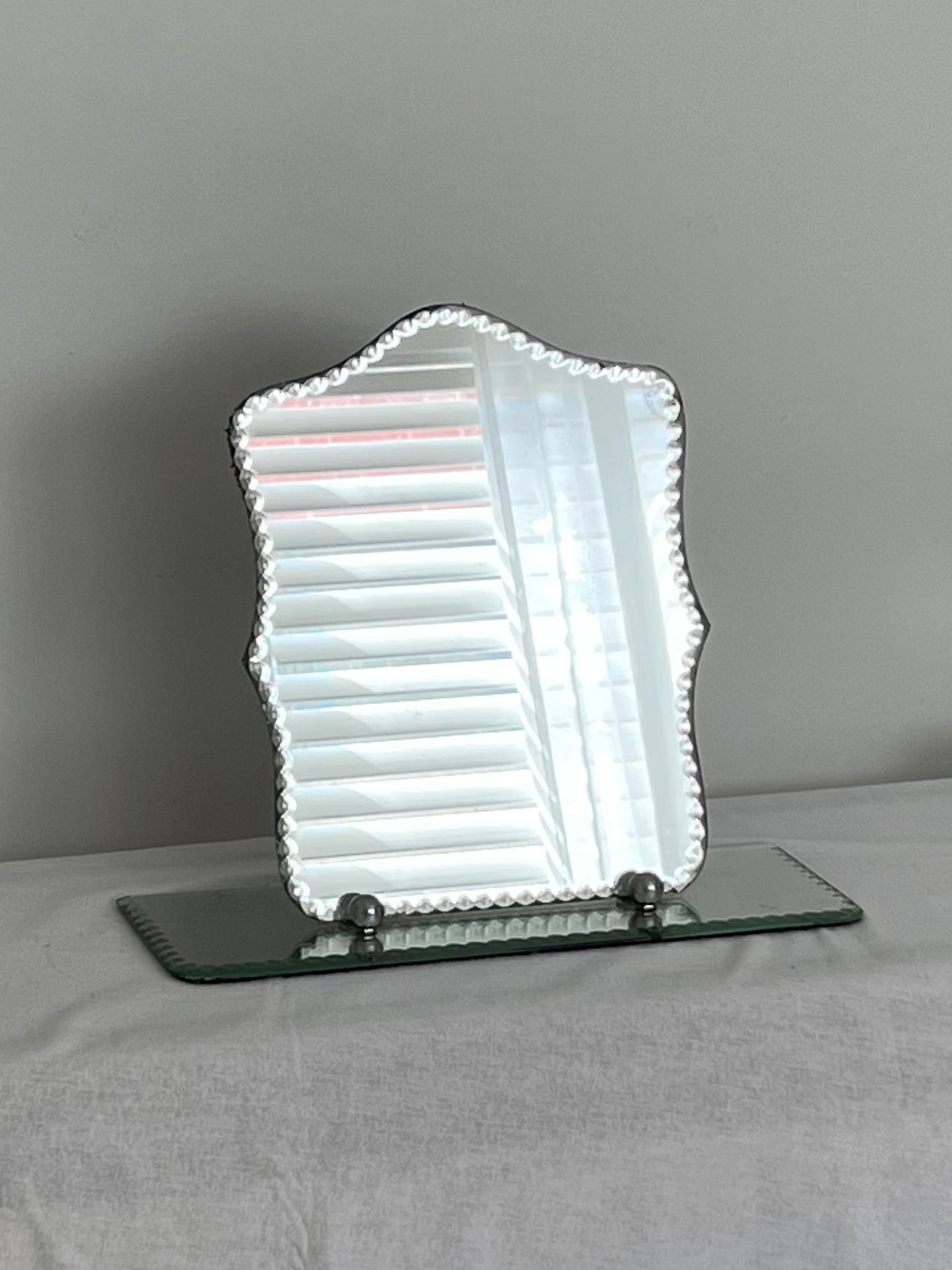Striking 1930s art deco Venetian table mirror, sourced in Italy. Composed of a central chiseled-mirror base and separate chiseled square mirror that rests on two chrome spheres.