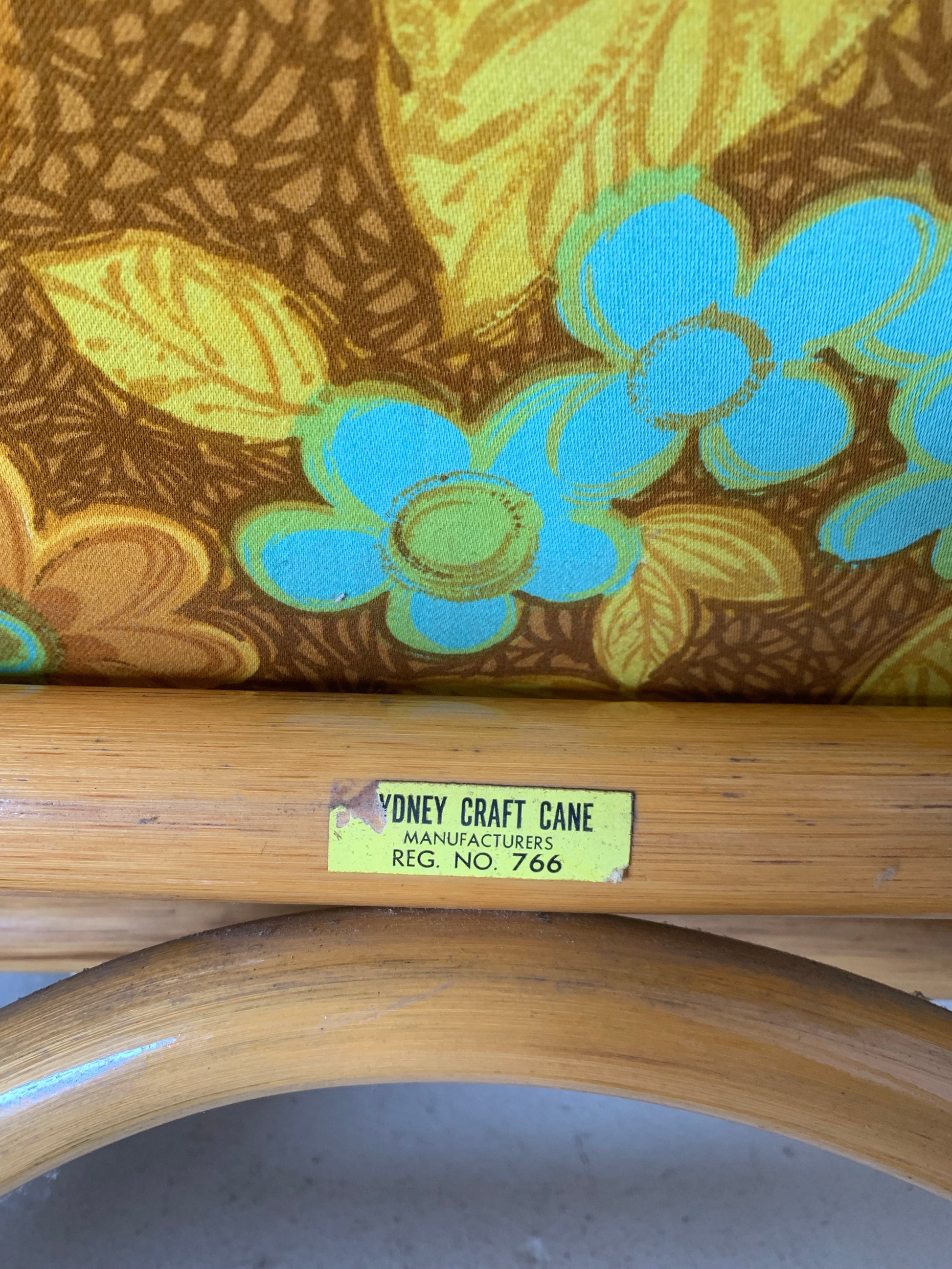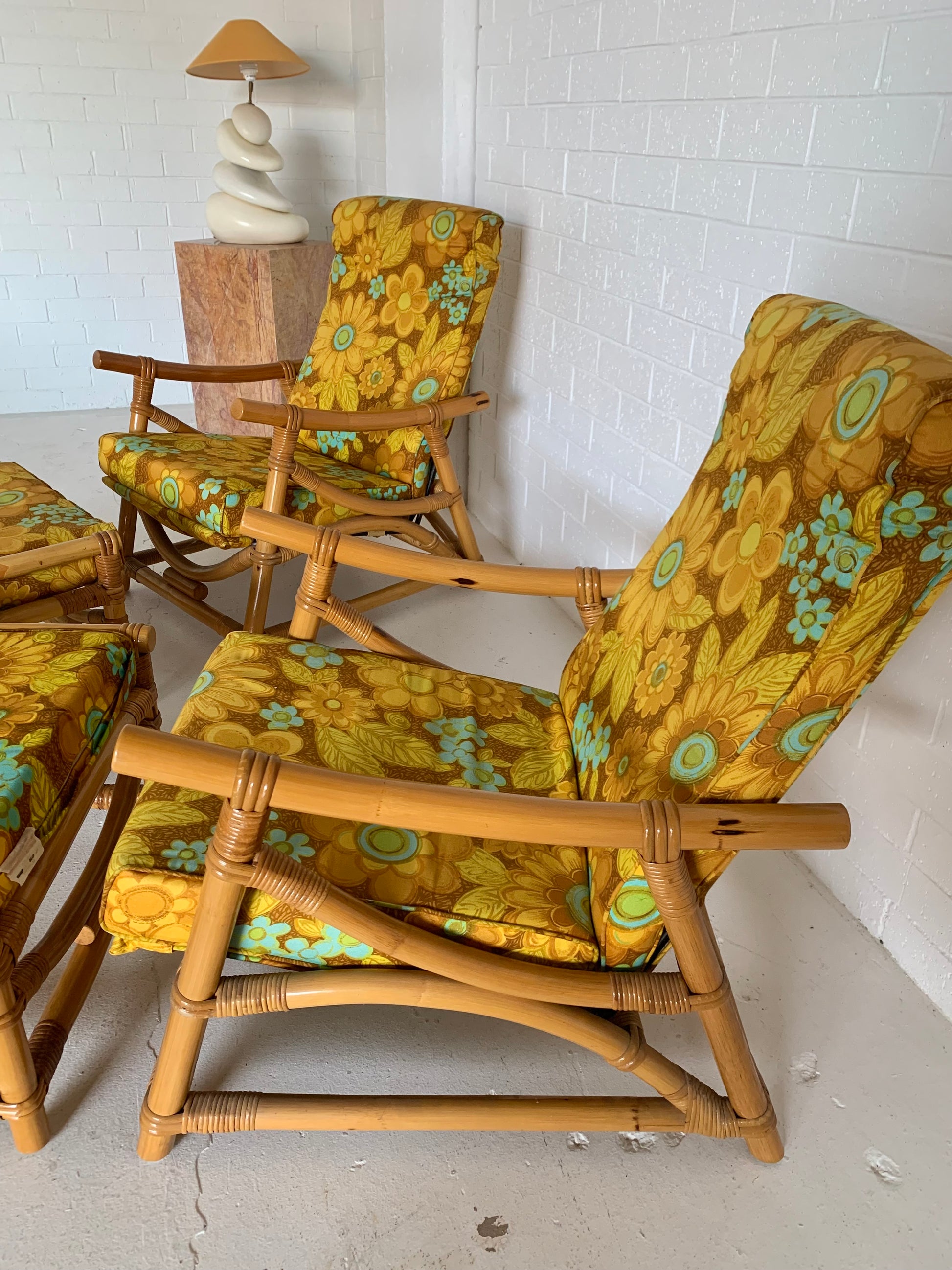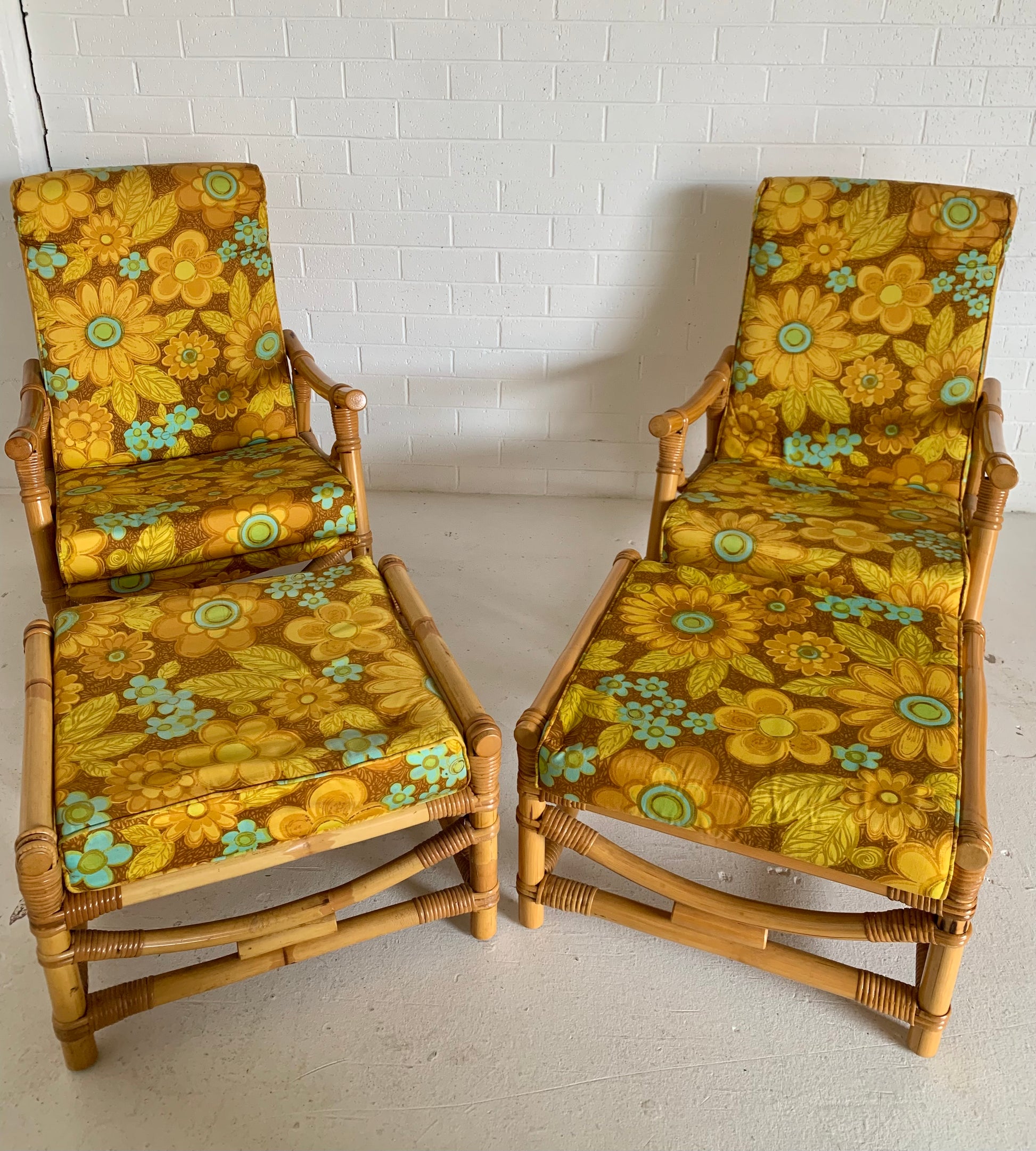 Bamboo Reclining Armchair and matching foot stool. Original floral fabric. Extremely well built and Australian made. Beautiful bamboo detail on every side of the chair. Chair reclines for maximum comfort.
