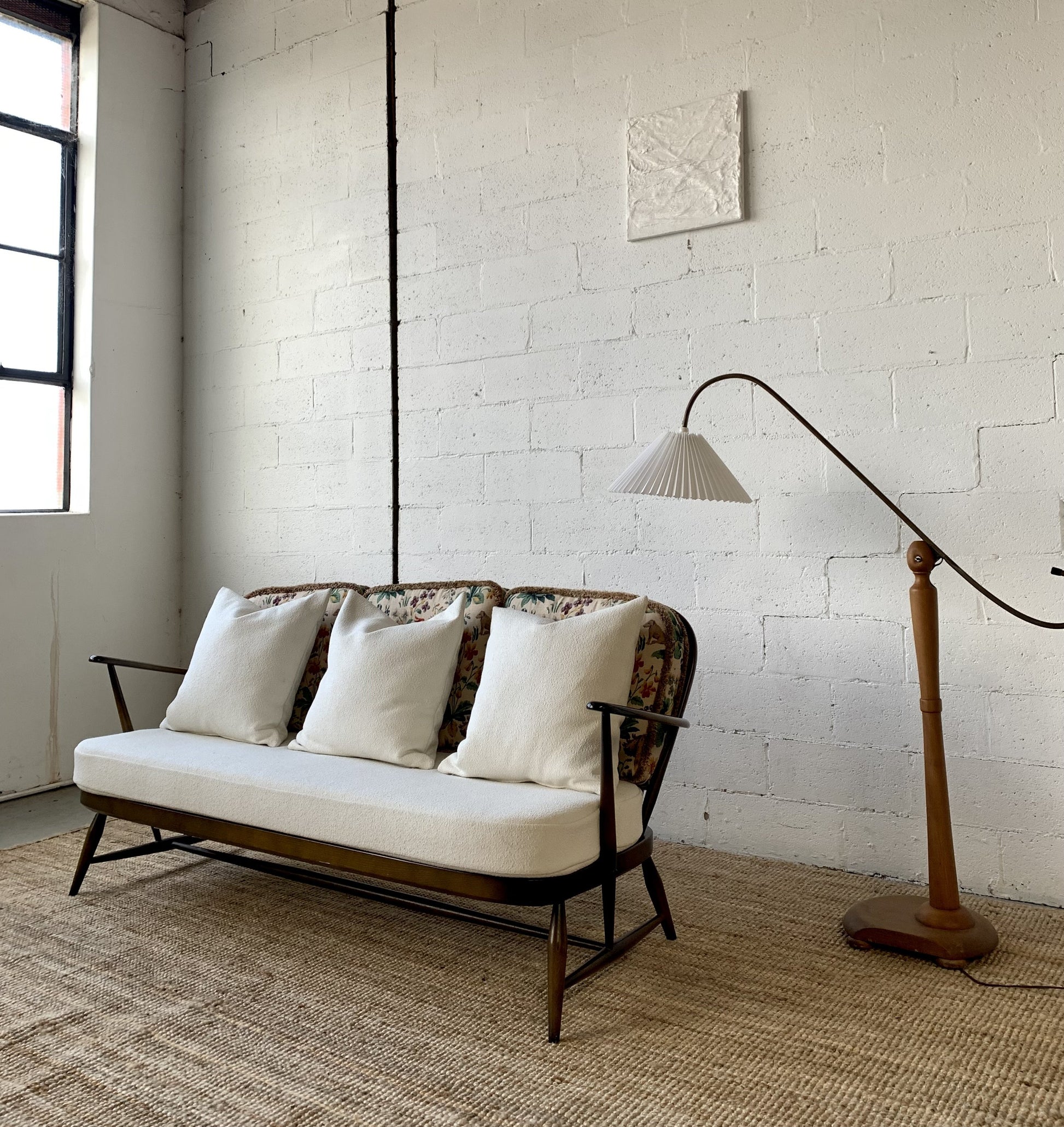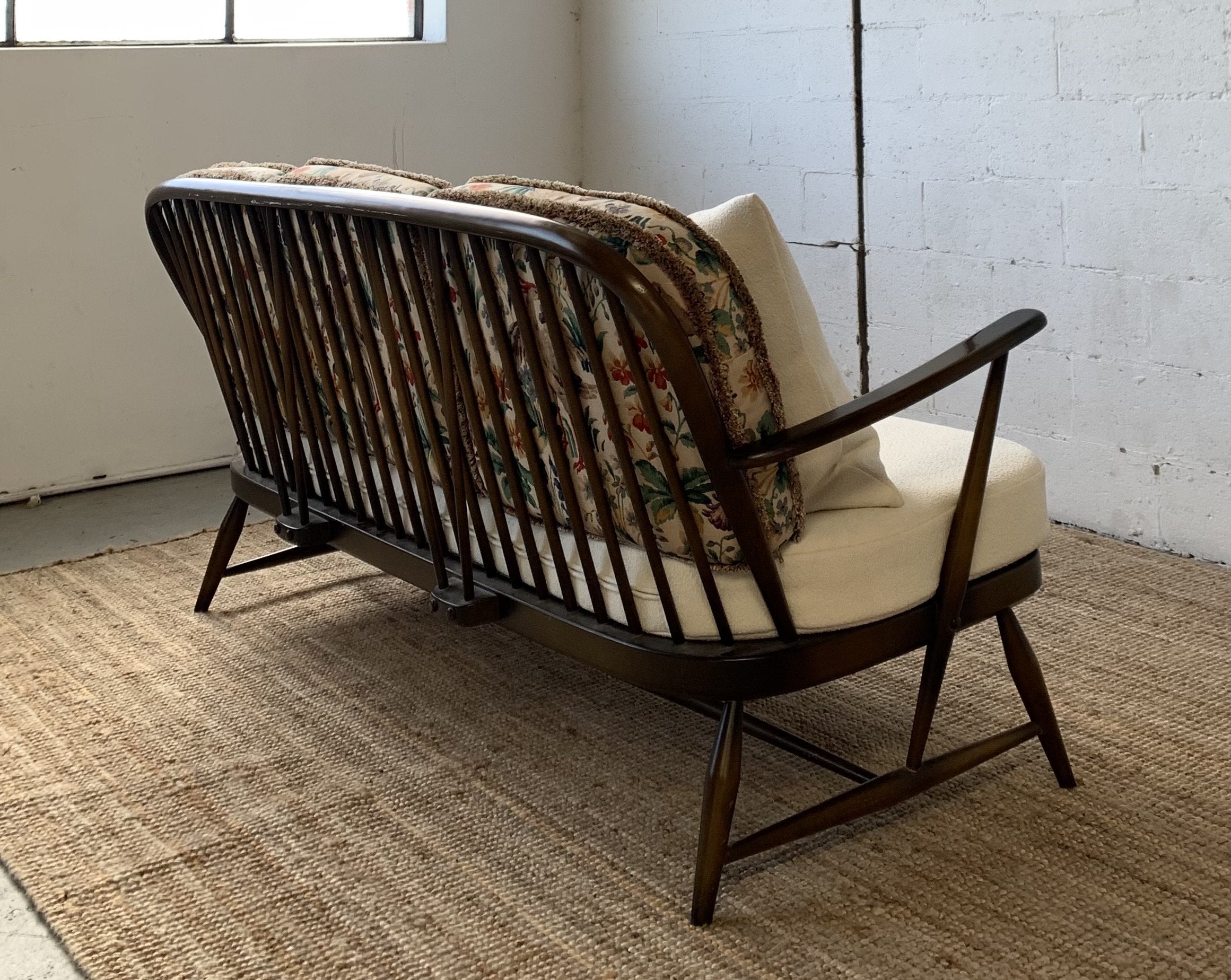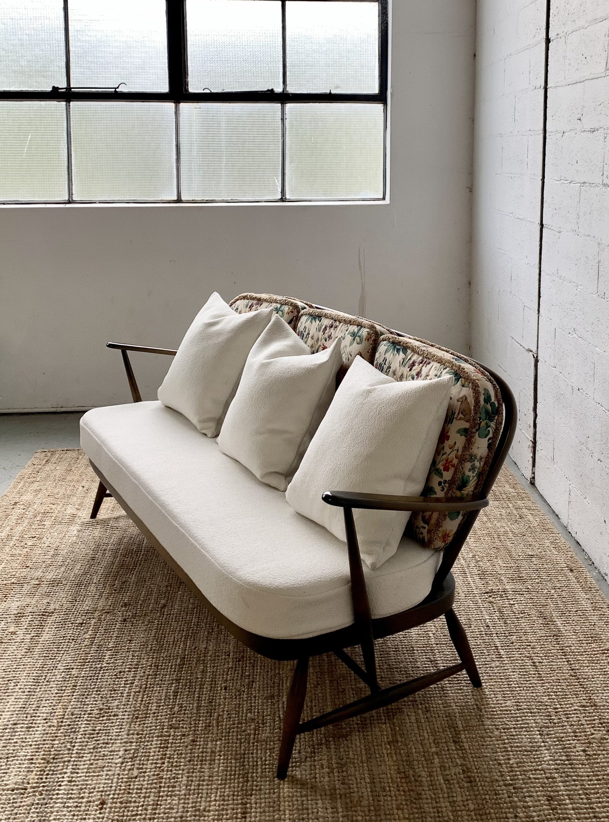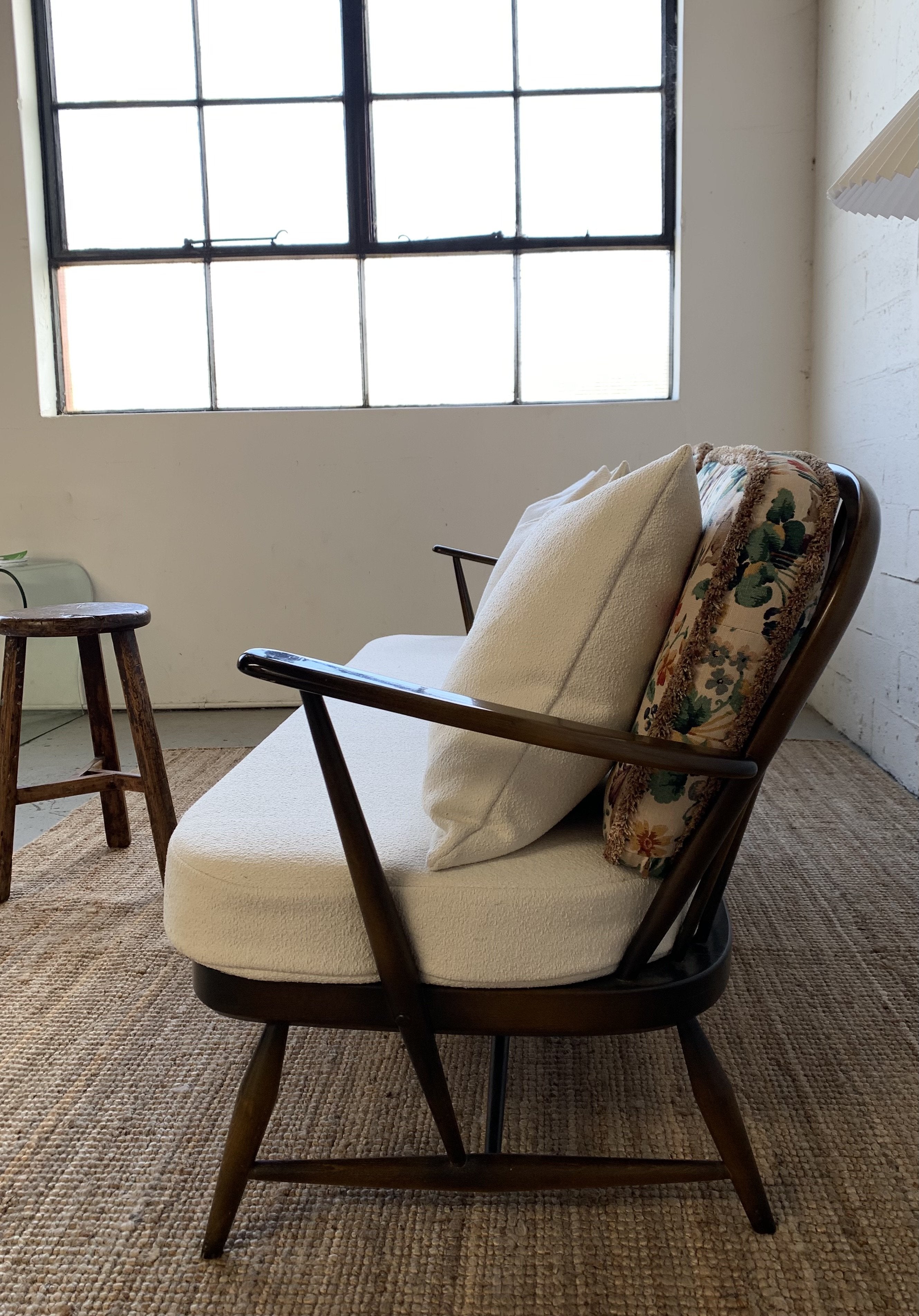 Gorgeous stained beech wood sofa by Lucian Ercolani for Ercol, 1950s. Newly reupholstered in Wortley ivory boucle, with three matching (ethically-sourced) feather and down cushions. The sofa also comes with a set of its original, fantastically maximalist fringed upper cushions. Mix and match as desired.