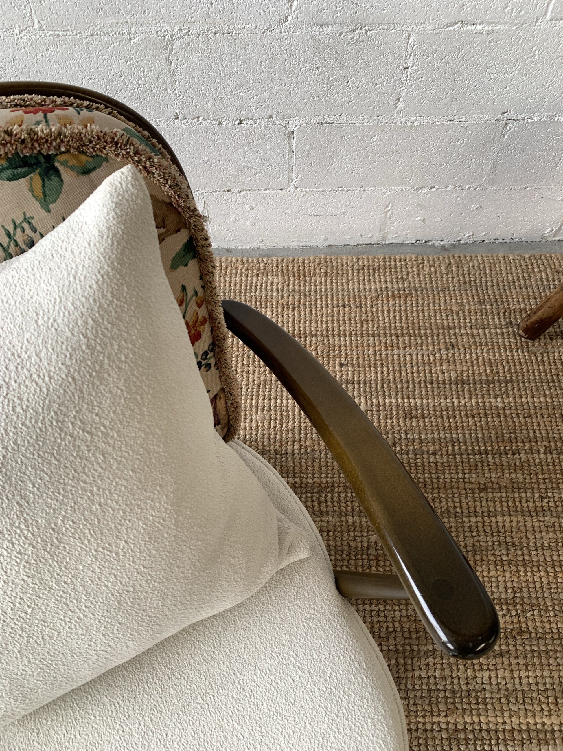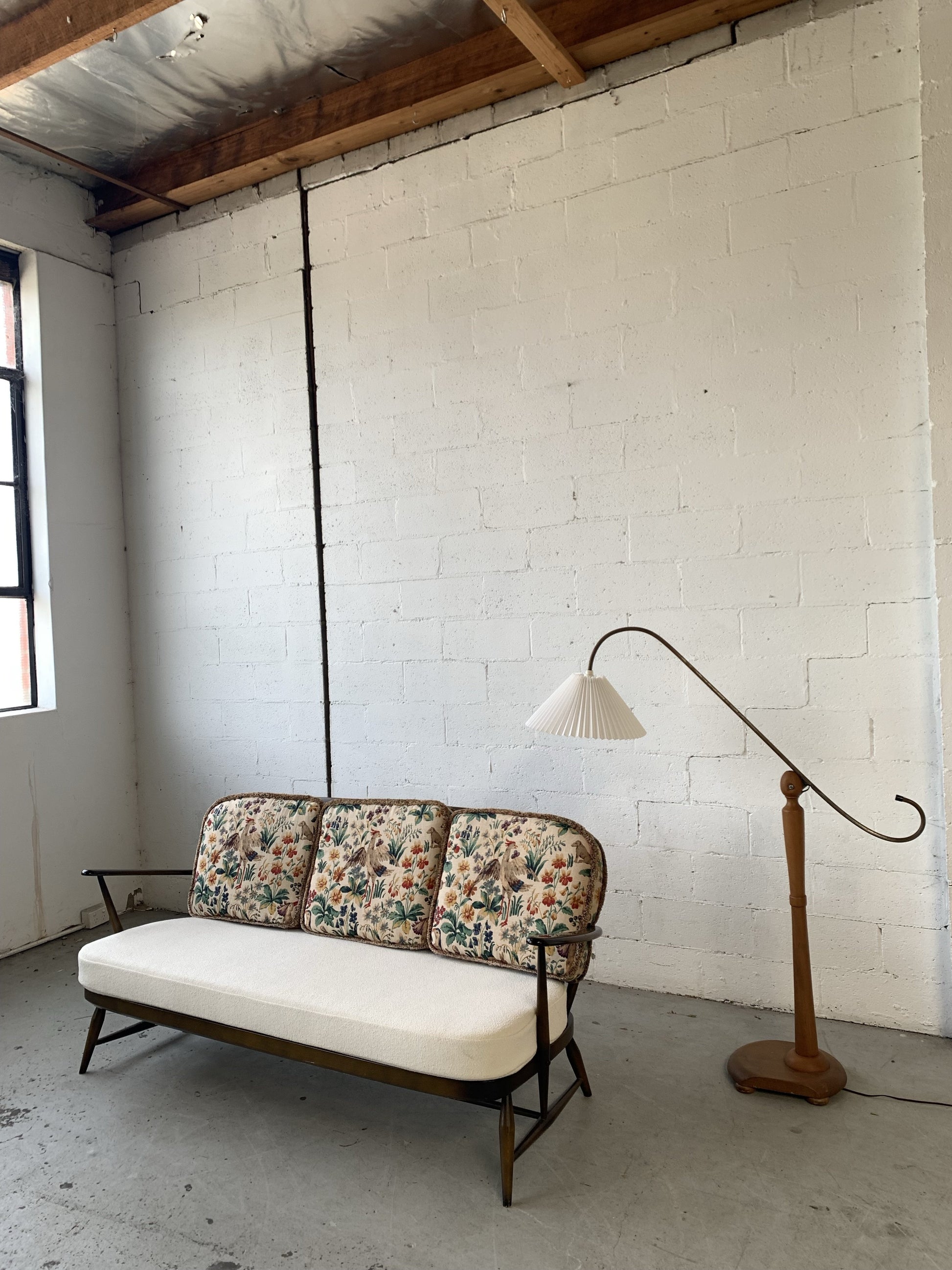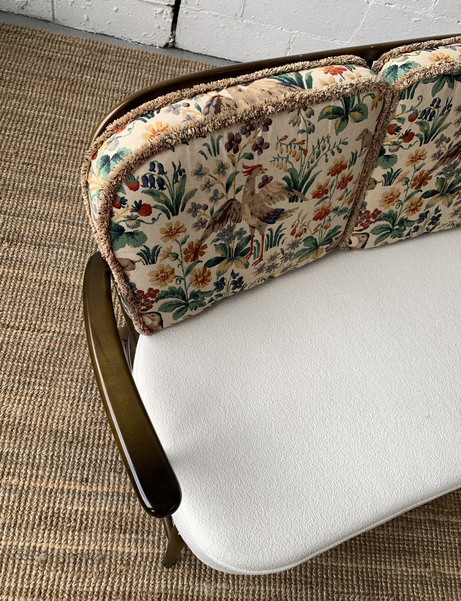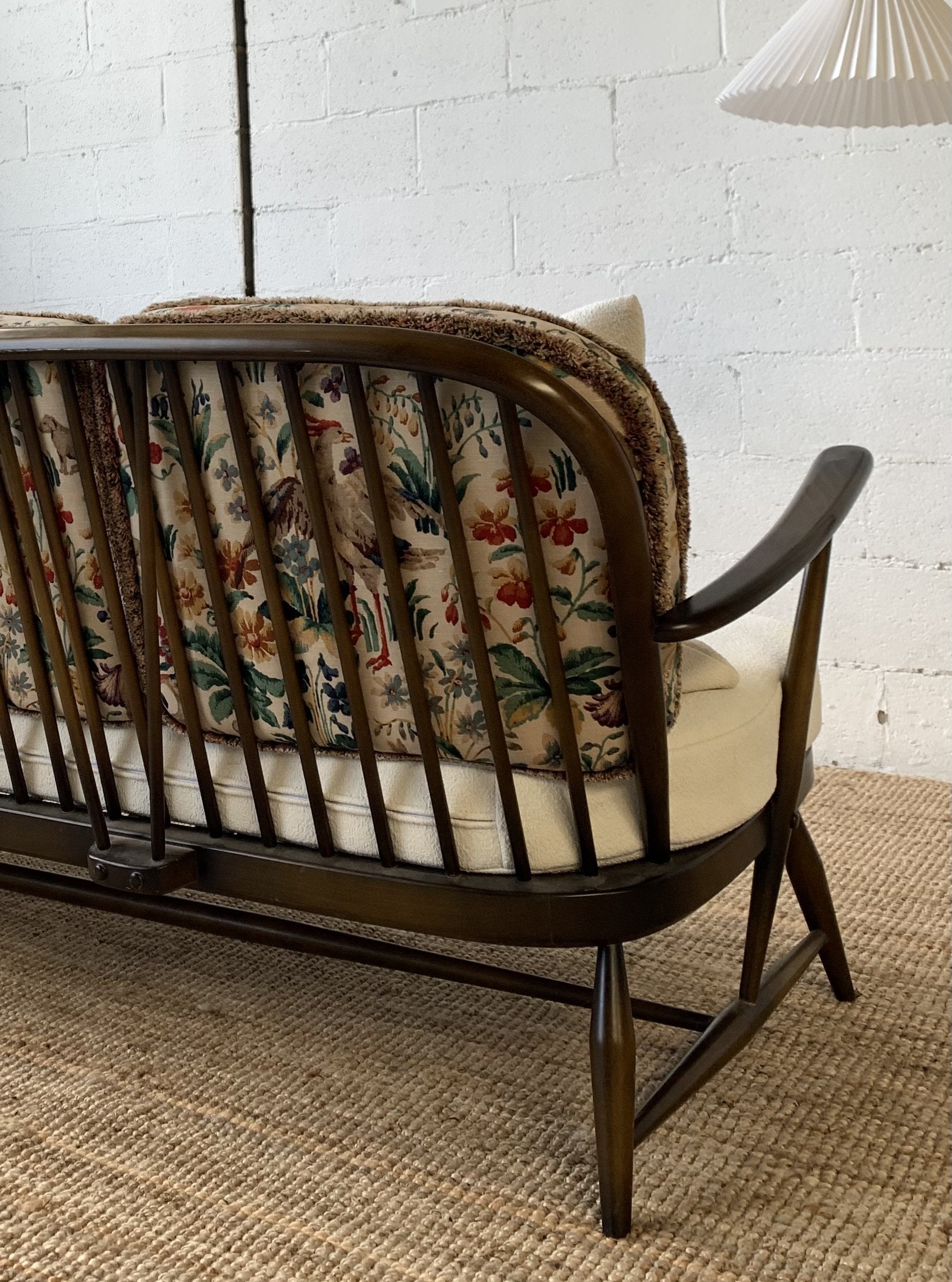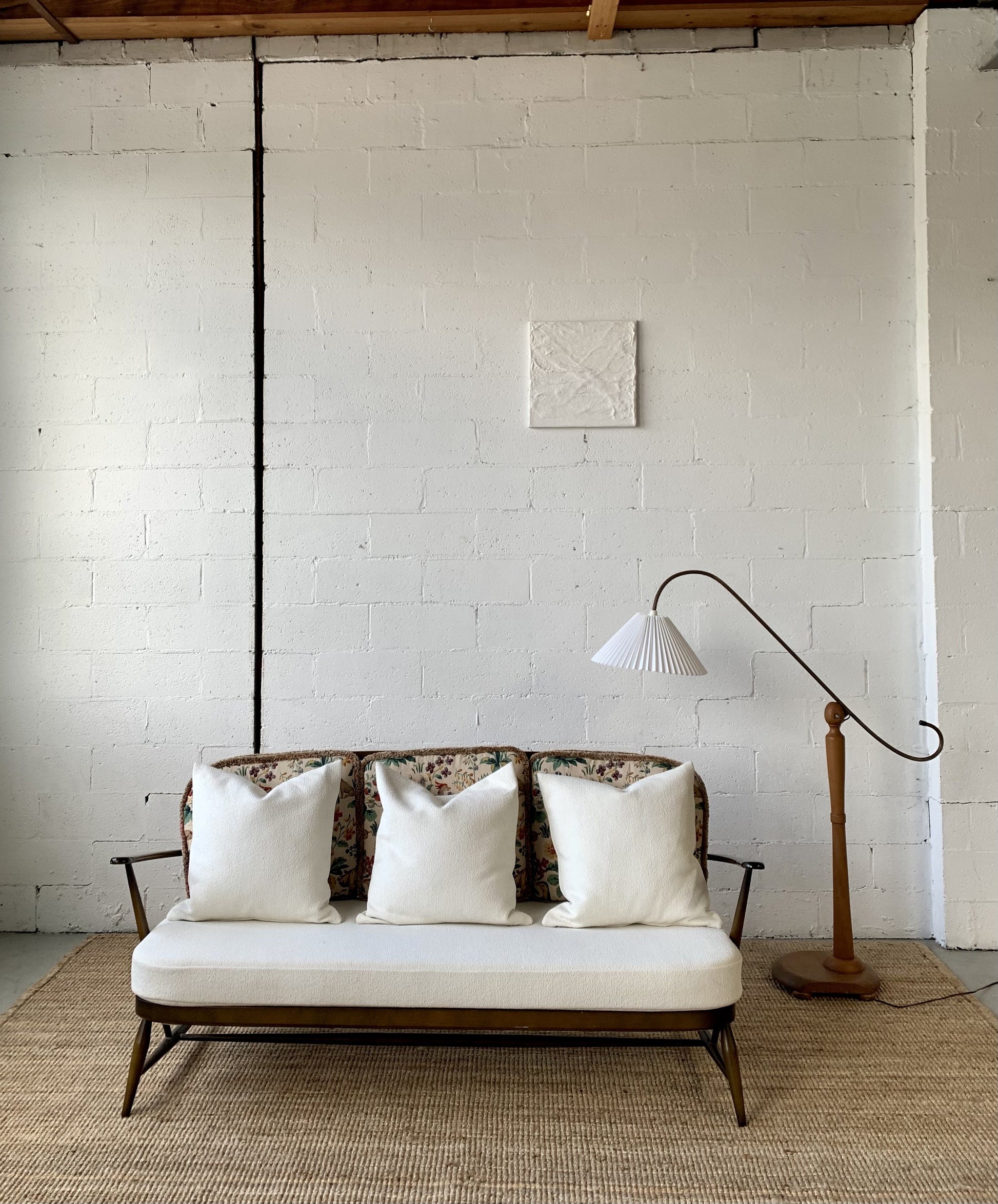 Gorgeous stained beech wood sofa by Lucian Ercolani for Ercol, 1950s. Newly reupholstered in Wortley ivory boucle, with three matching (ethically-sourced) feather and down cushions. The sofa also comes with a set of its original, fantastically maximalist fringed upper cushions. Mix and match as desired.