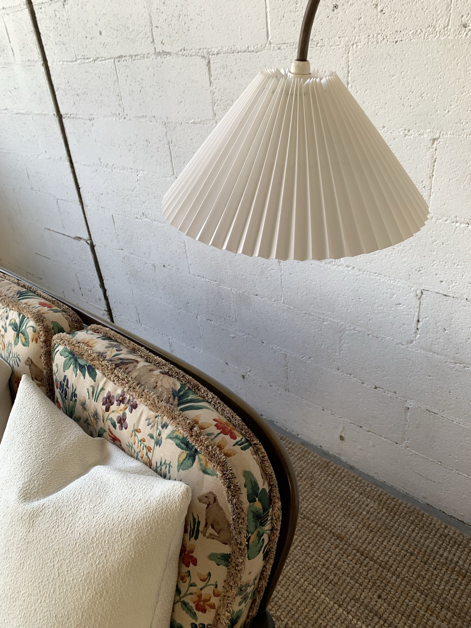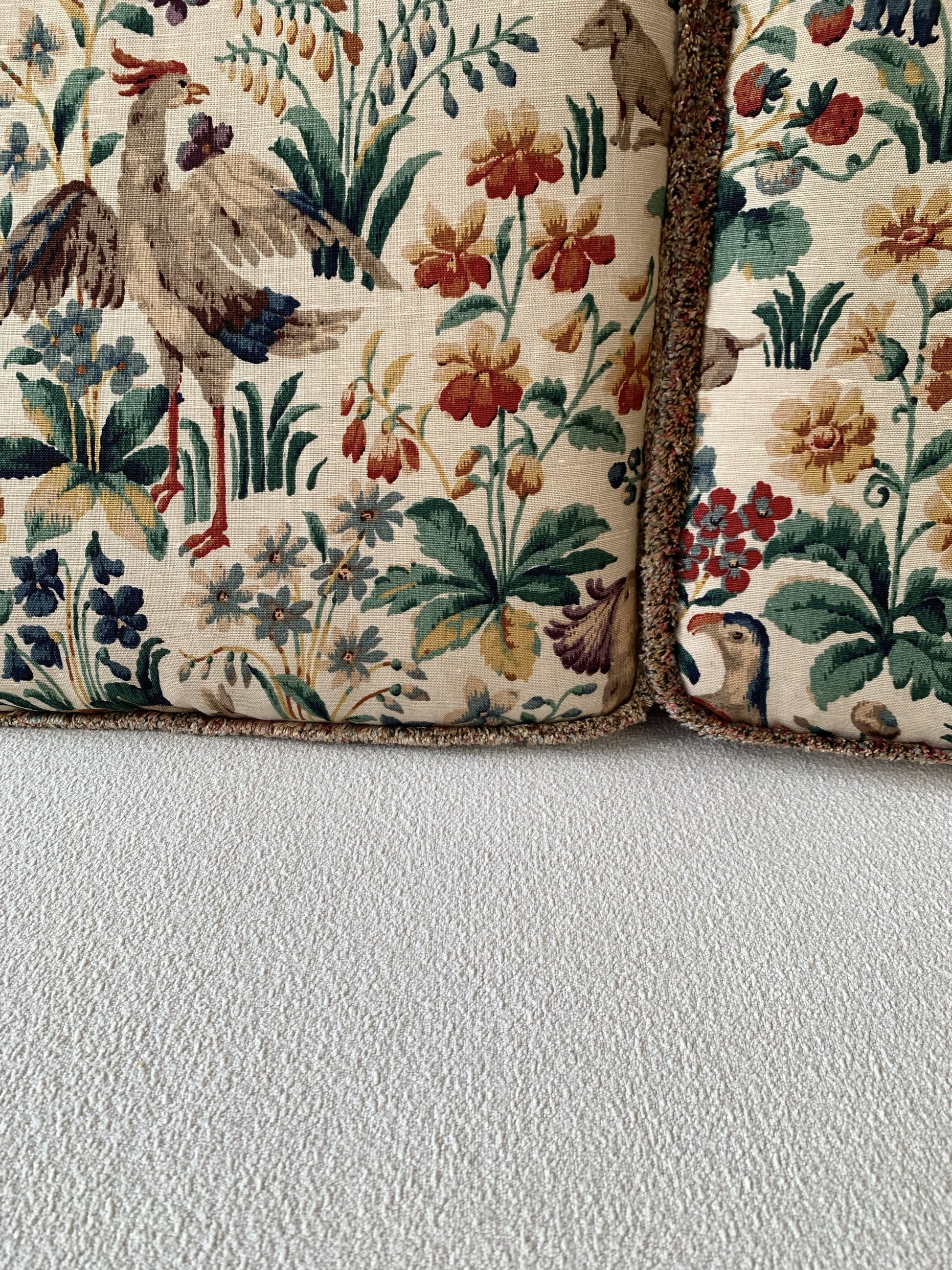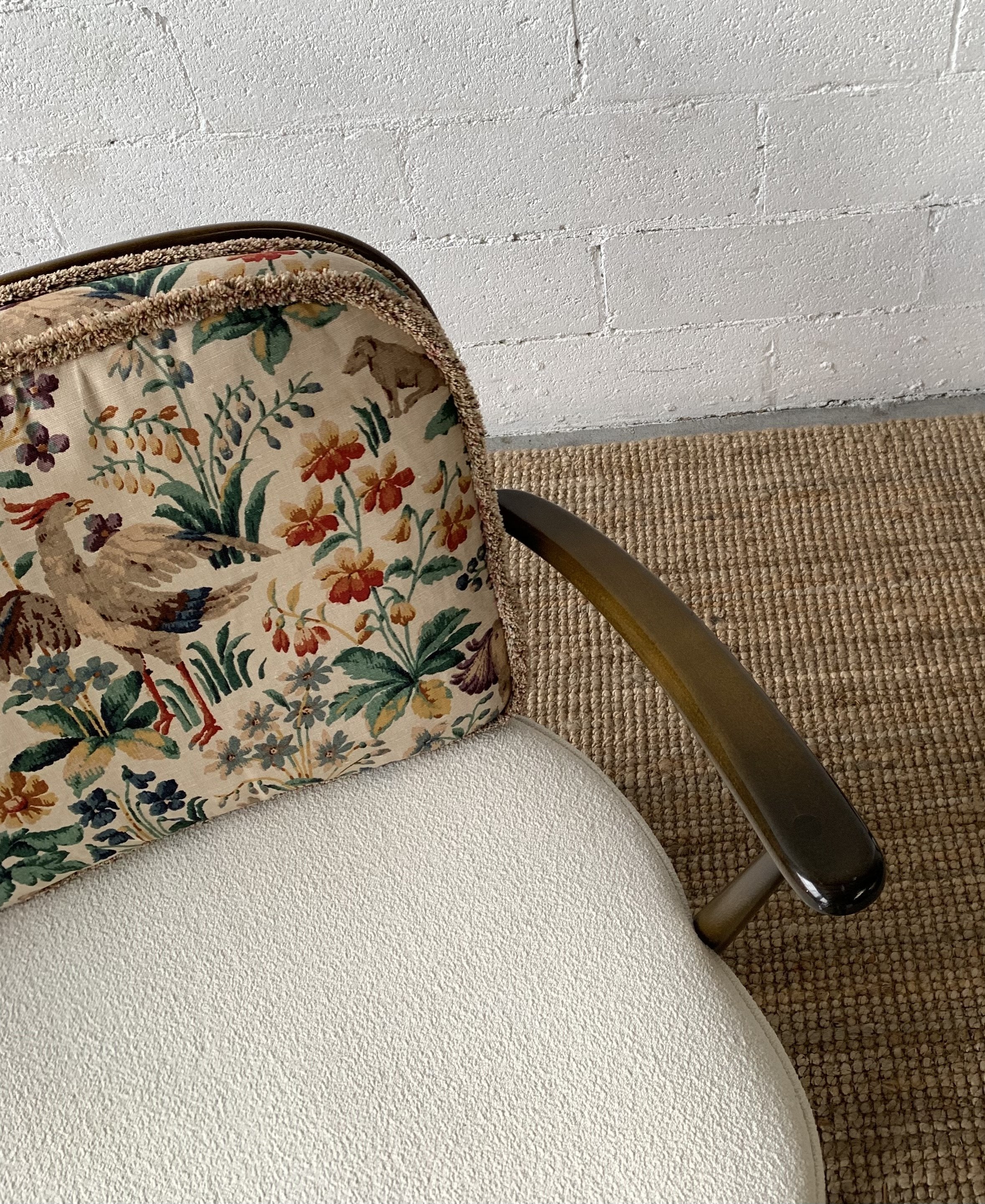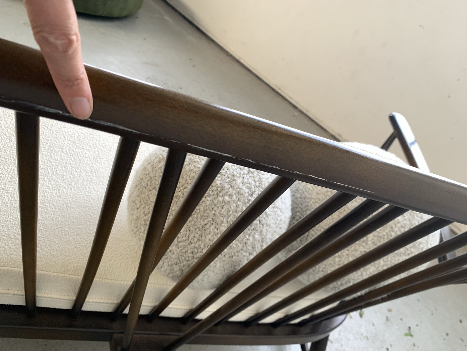 Gorgeous stained beech wood sofa by Lucian Ercolani for Ercol, 1950s. Newly reupholstered in Wortley ivory boucle, with three matching (ethically-sourced) feather and down cushions. The sofa also comes with a set of its original, fantastically maximalist fringed upper cushions. Mix and match as desired.