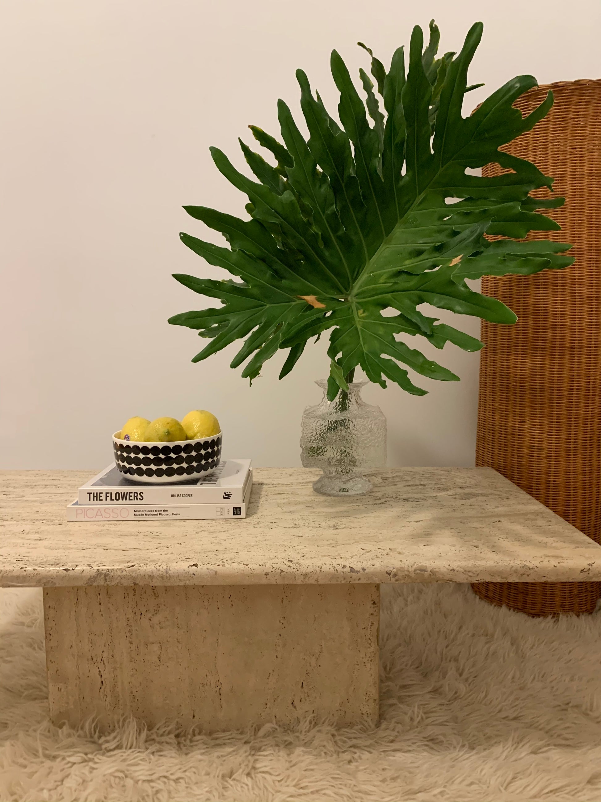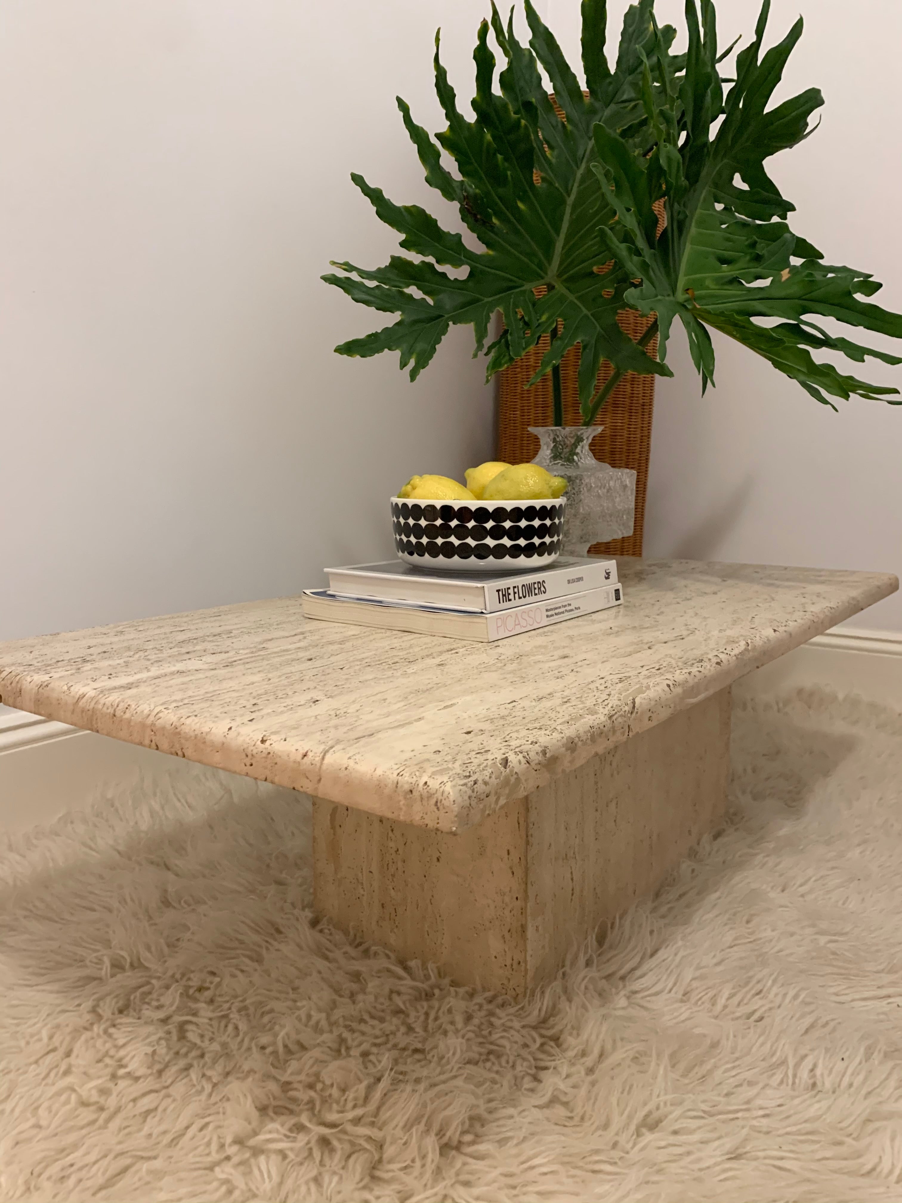 Stunning Vintage Unfilled Travertine Coffee Table in excellent condition. The travertine is raw and features a beautiful organic vein.