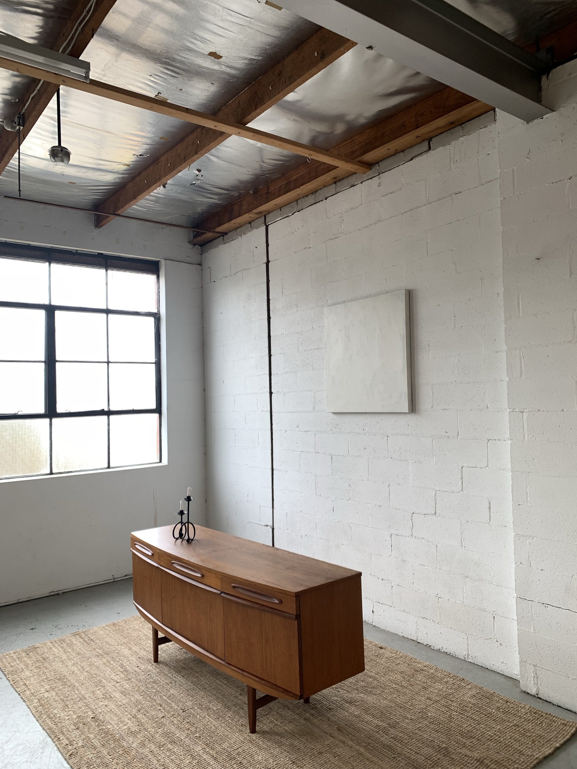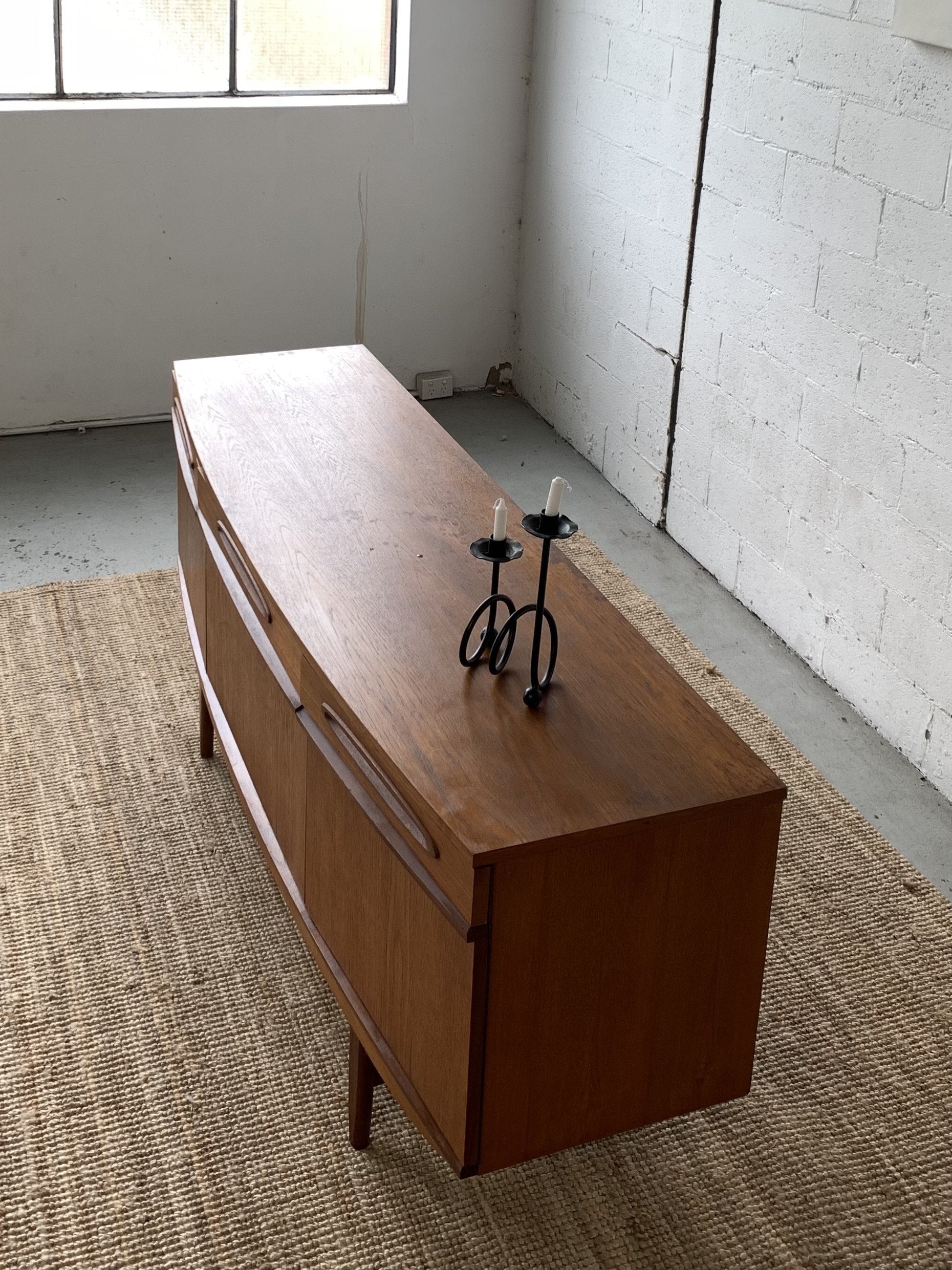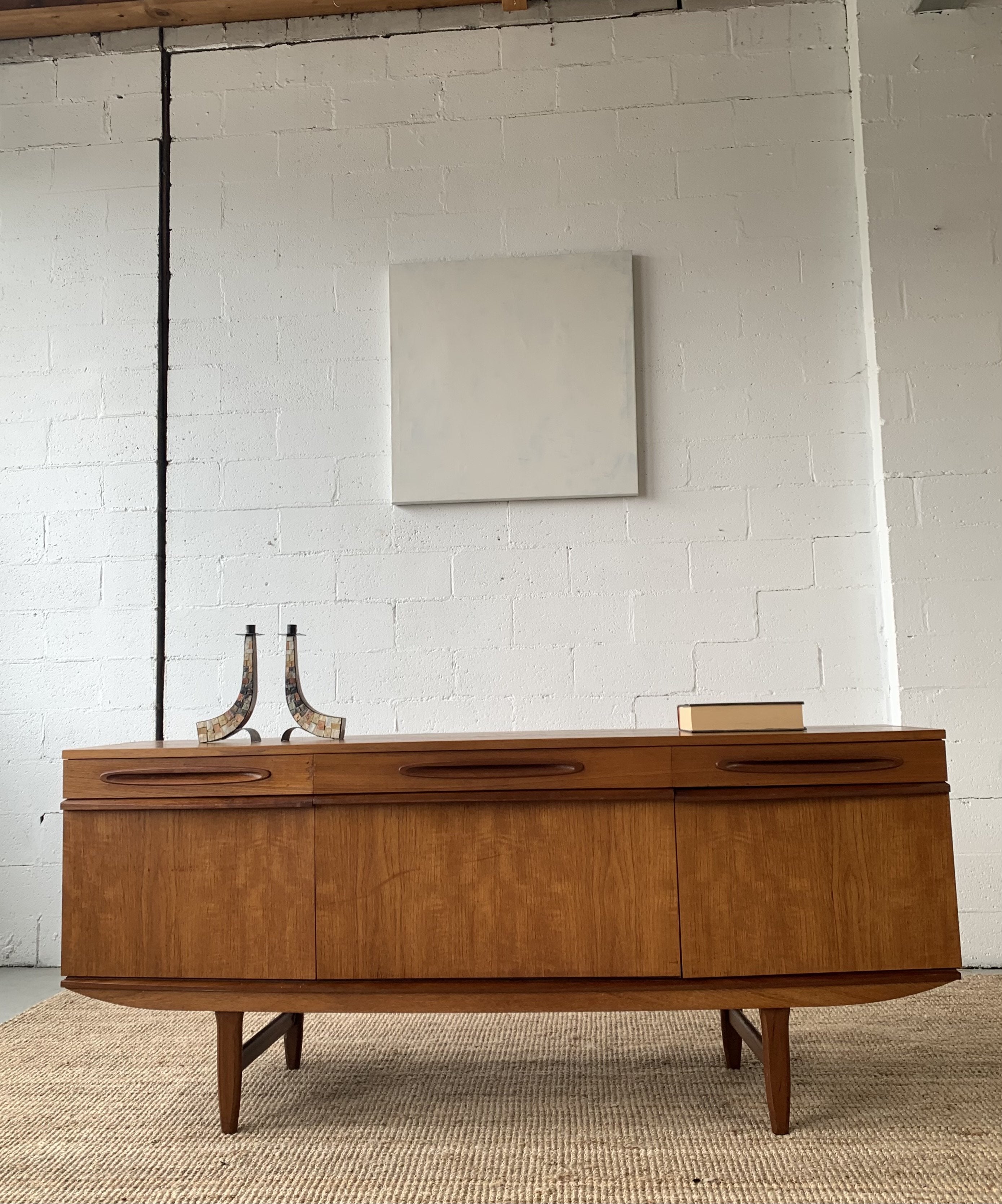 Stunning solid teak sideboard with a curved bow front, three drawers and three storage compartments below. A gorgeous rich colour and timeless shape that will complement any interior for years to come. Circa 1960.