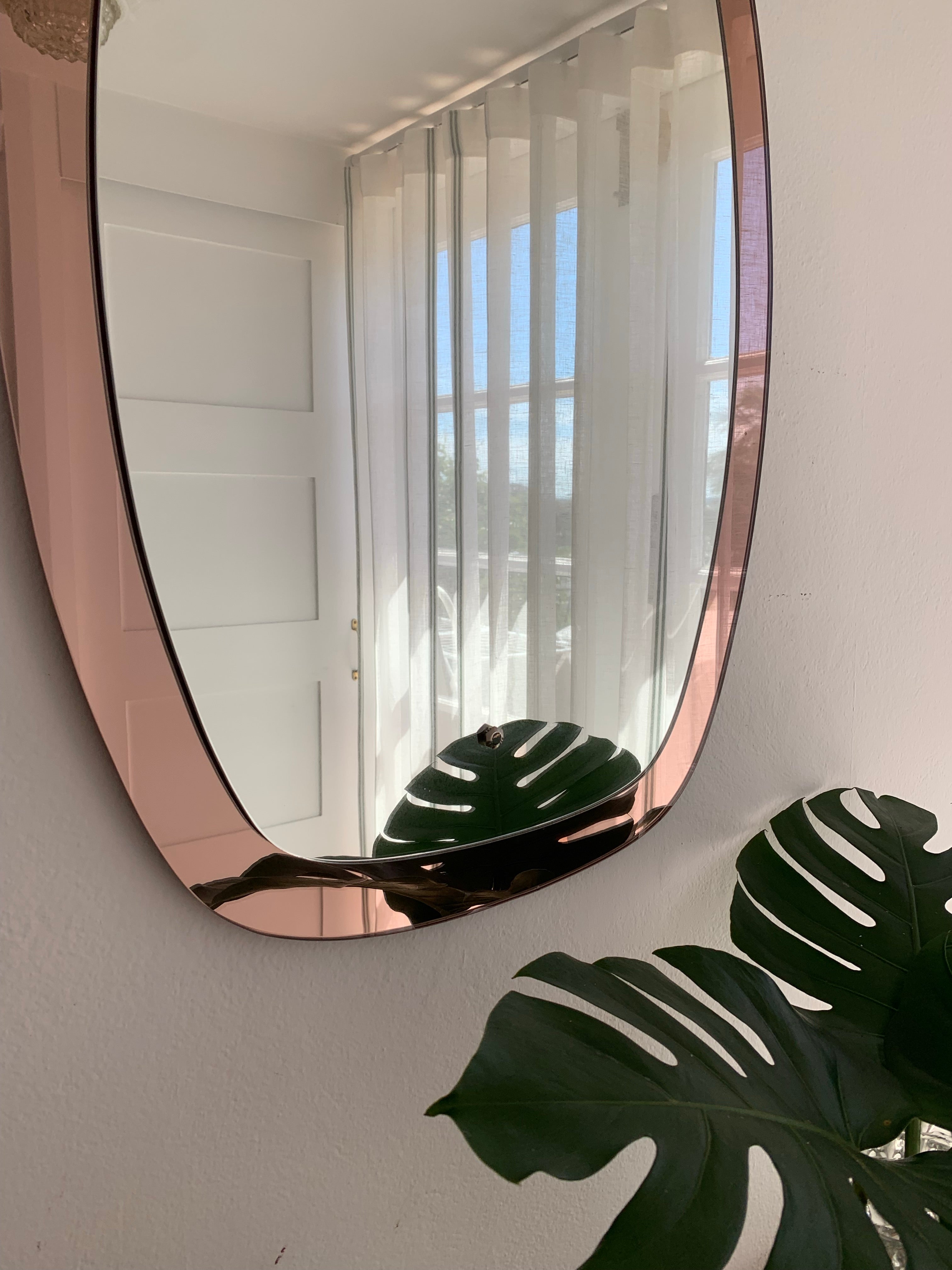 Stunning Italian 1950’s Fontana Arte style mirror with pink contrast glass rim. A beautiful classic Italian style that works well in multiple interiors, including use as a bathroom mirror.