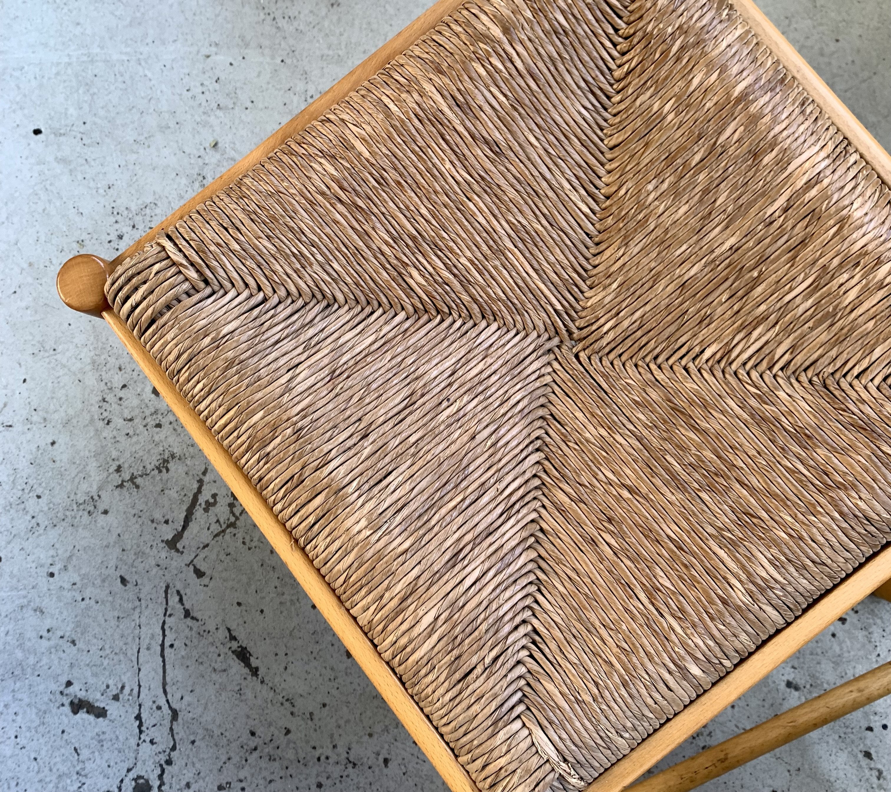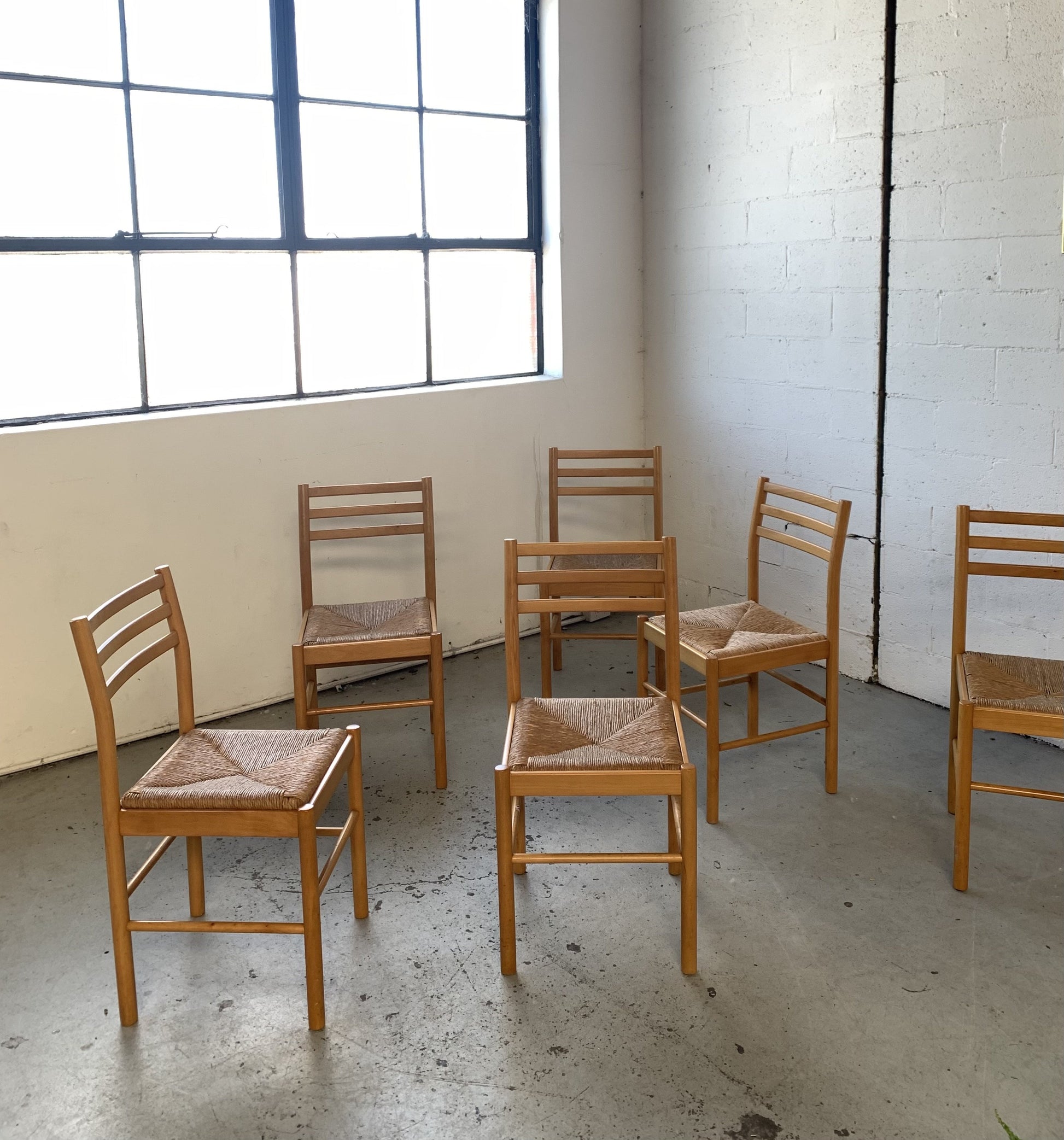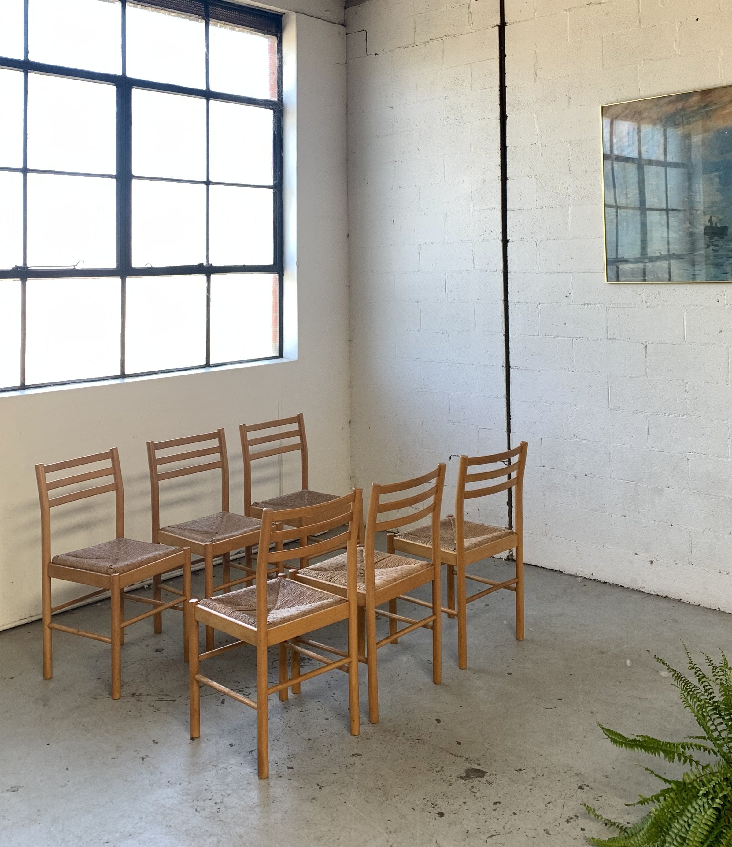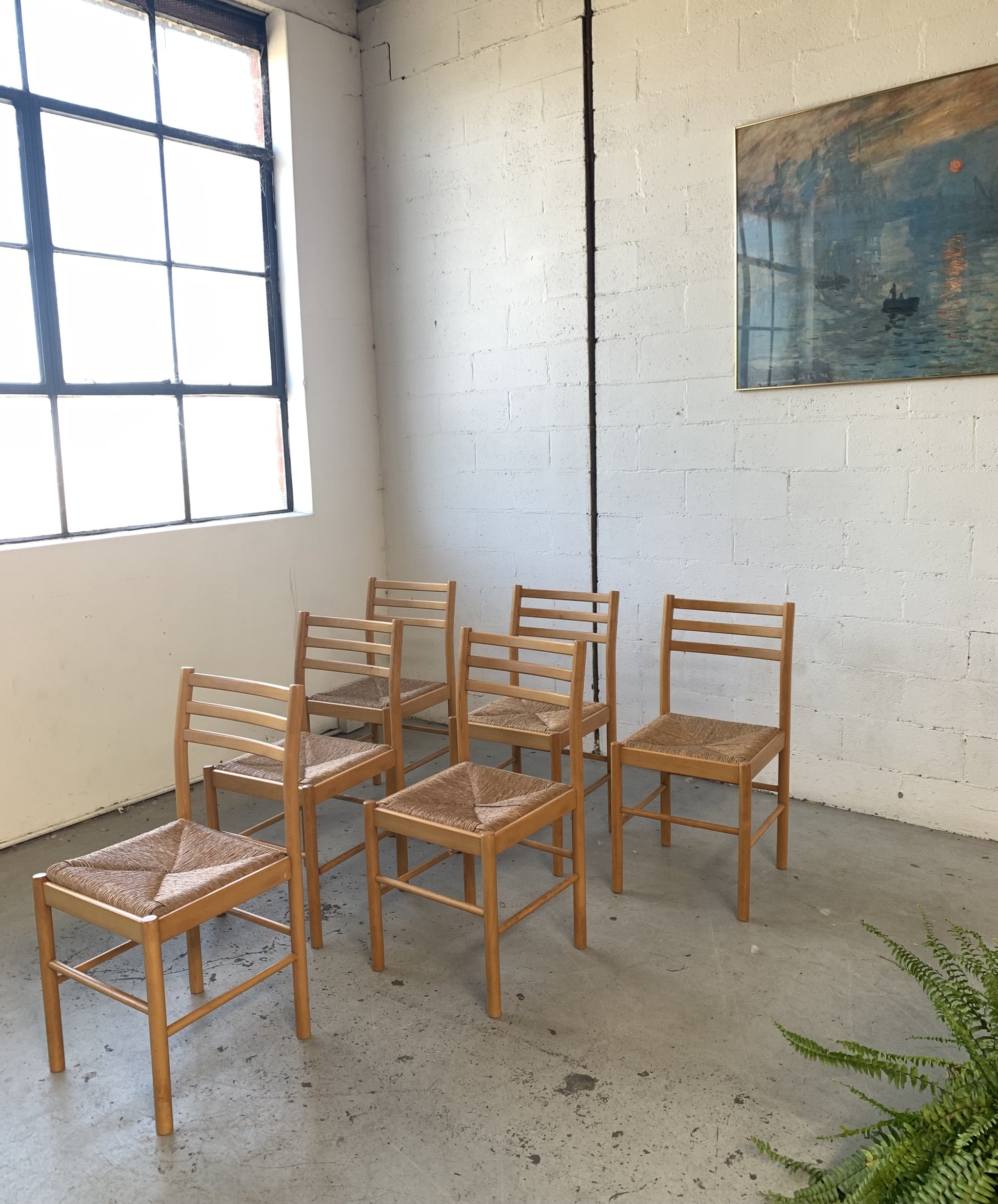 Set of six vintage blonde wood dining chairs with lovely thick rush seats in a camel hue.
