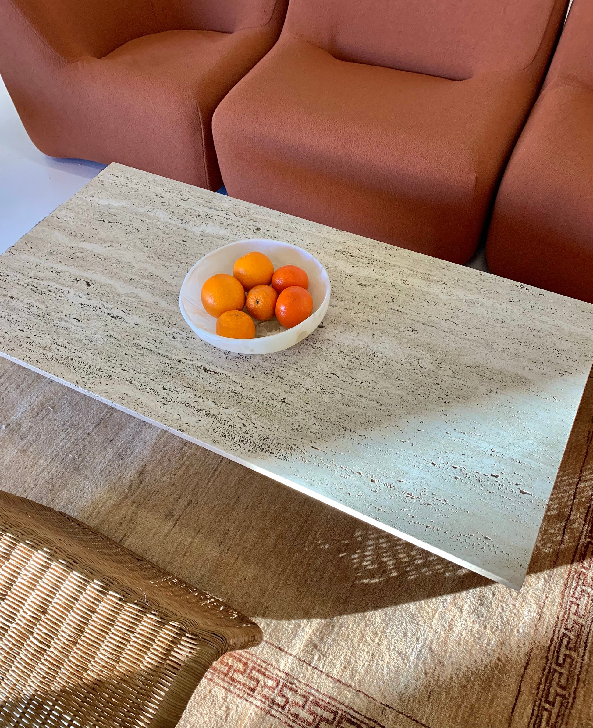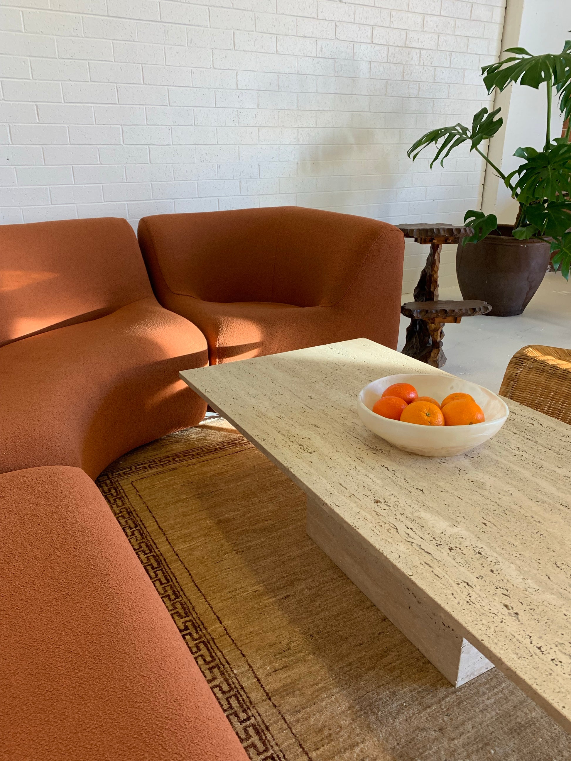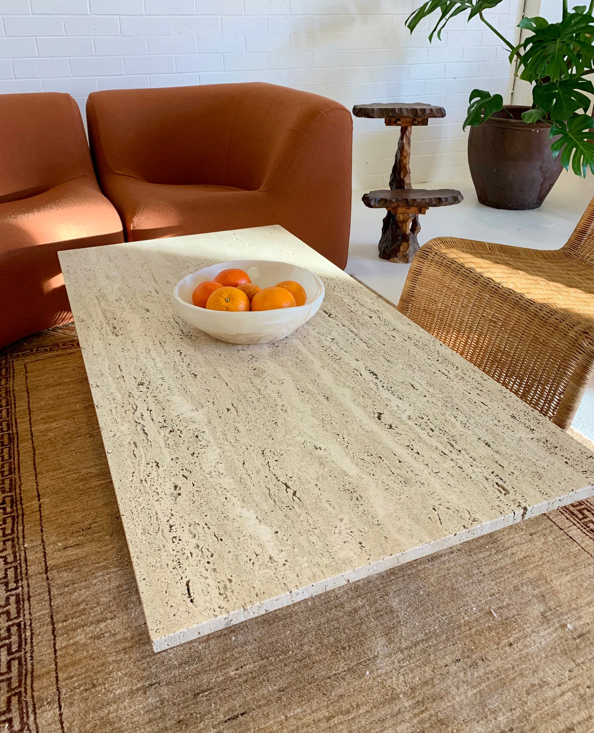 Stunning unfilled travertine coffee table. The stone is raw with a natural finish. Table top sits on a rectangular base