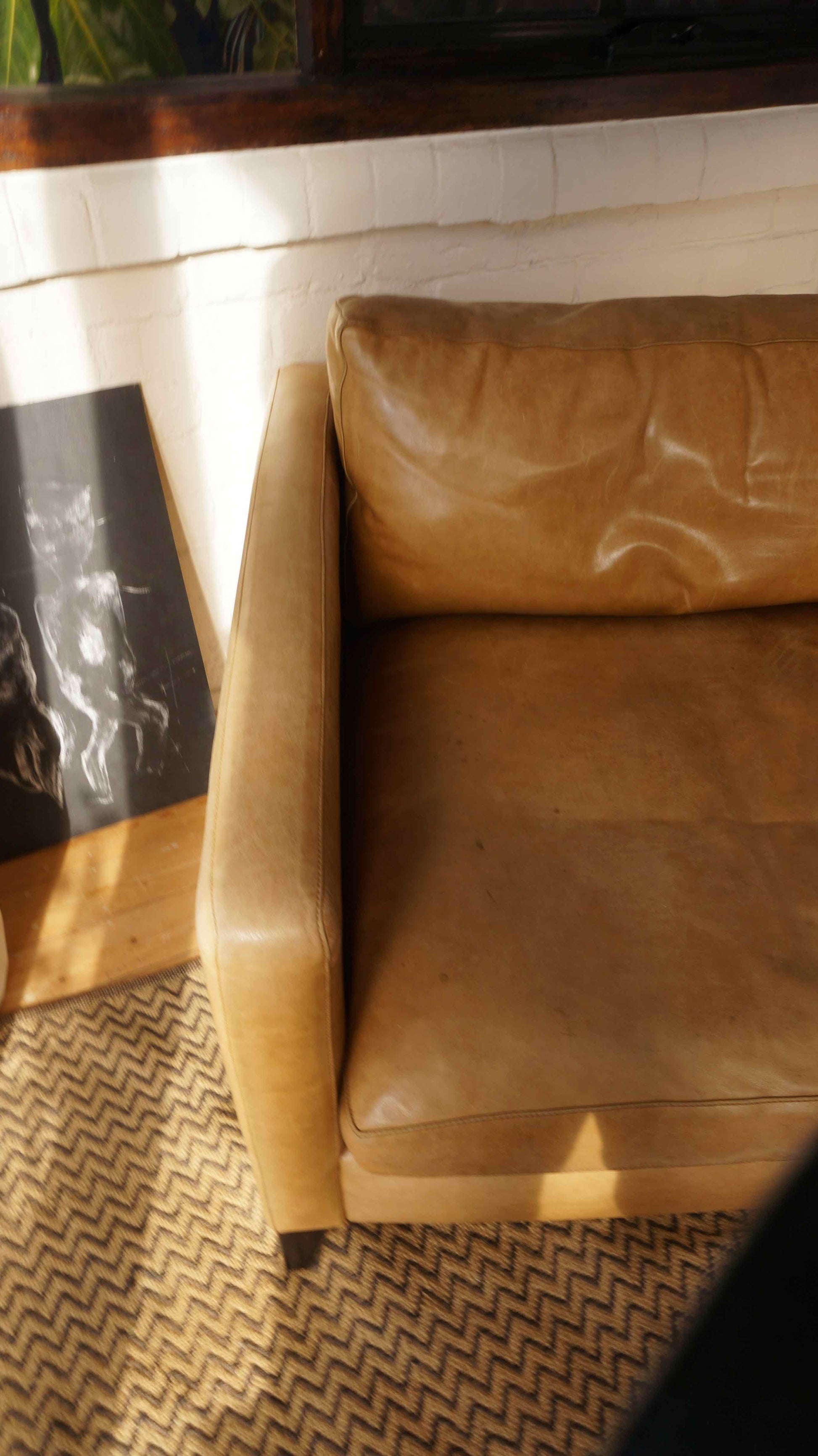 Gorgeous oversized arm chair by Jardan in a beautiful light tan/caramel leather. These have a hardwood frame and are built to last. This design is very similar to the current Nook model but have different feet and have a wonderful slender frame and a real timeless style. The feet are in a dark walnut finish.