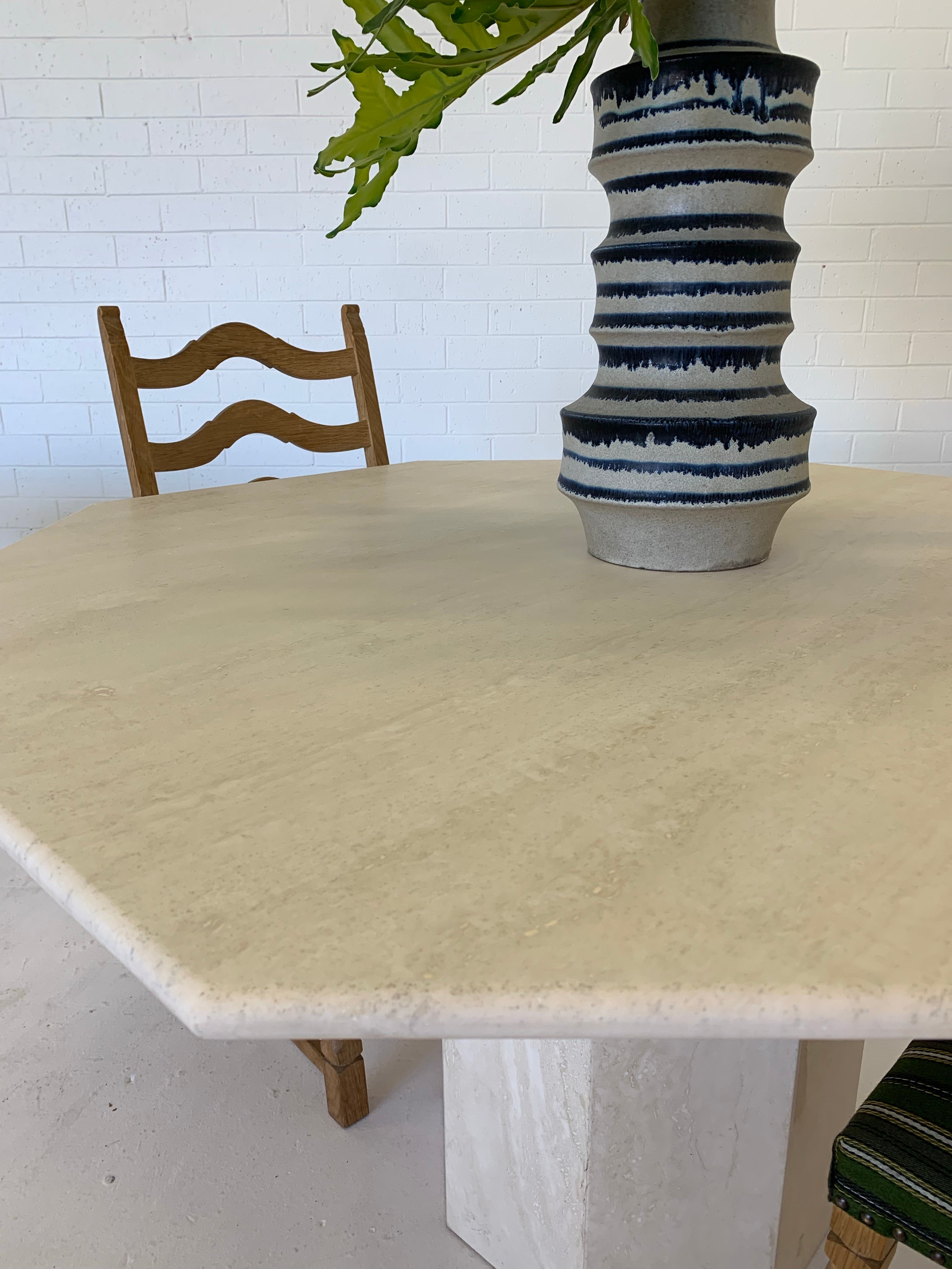 Vintage honed white travertine table. Seats four - six people comfortably. Newly honed by a stonemason, the travertine presents beautifully and is in excellent condition. Travertine is a white tone.