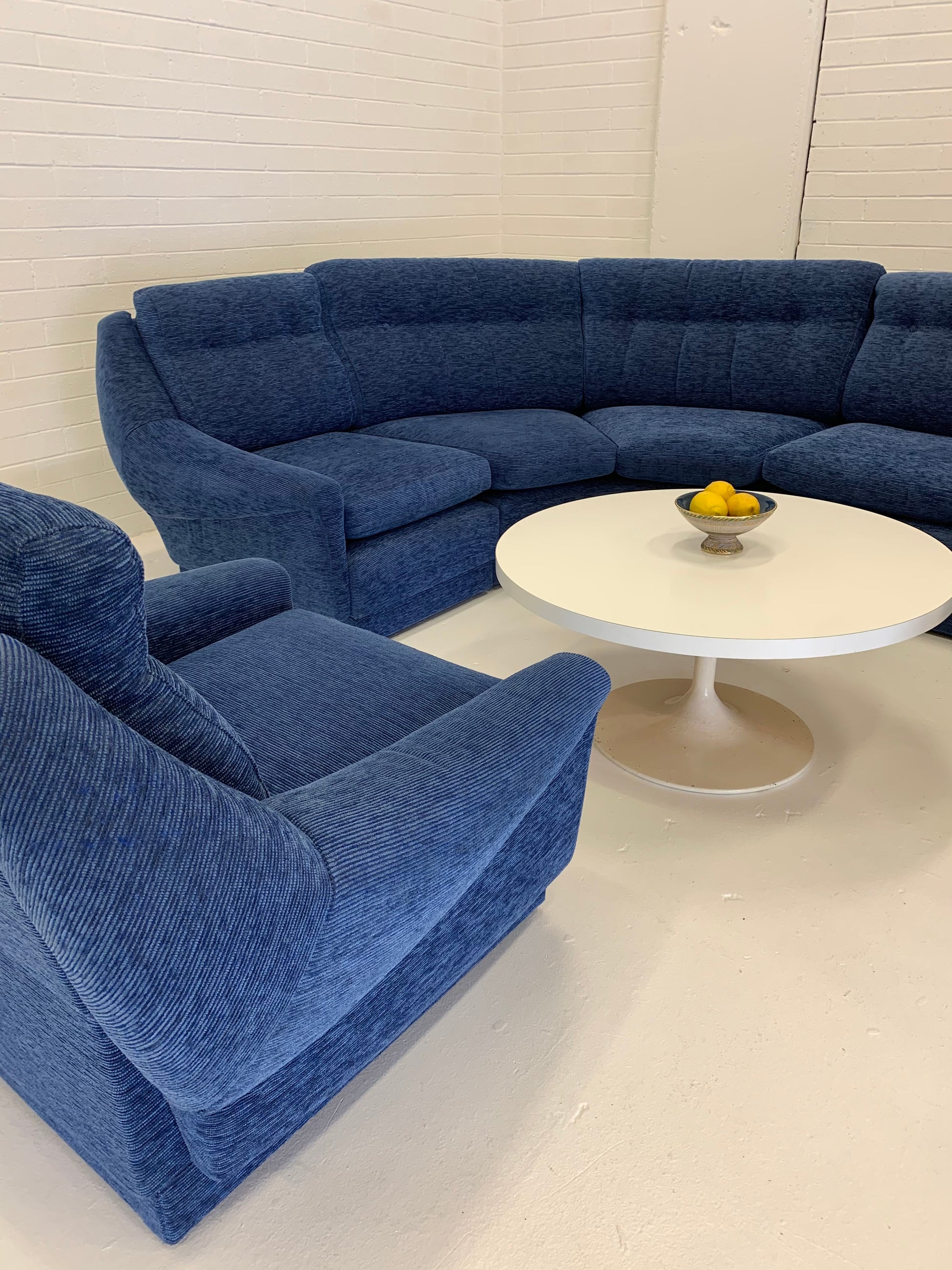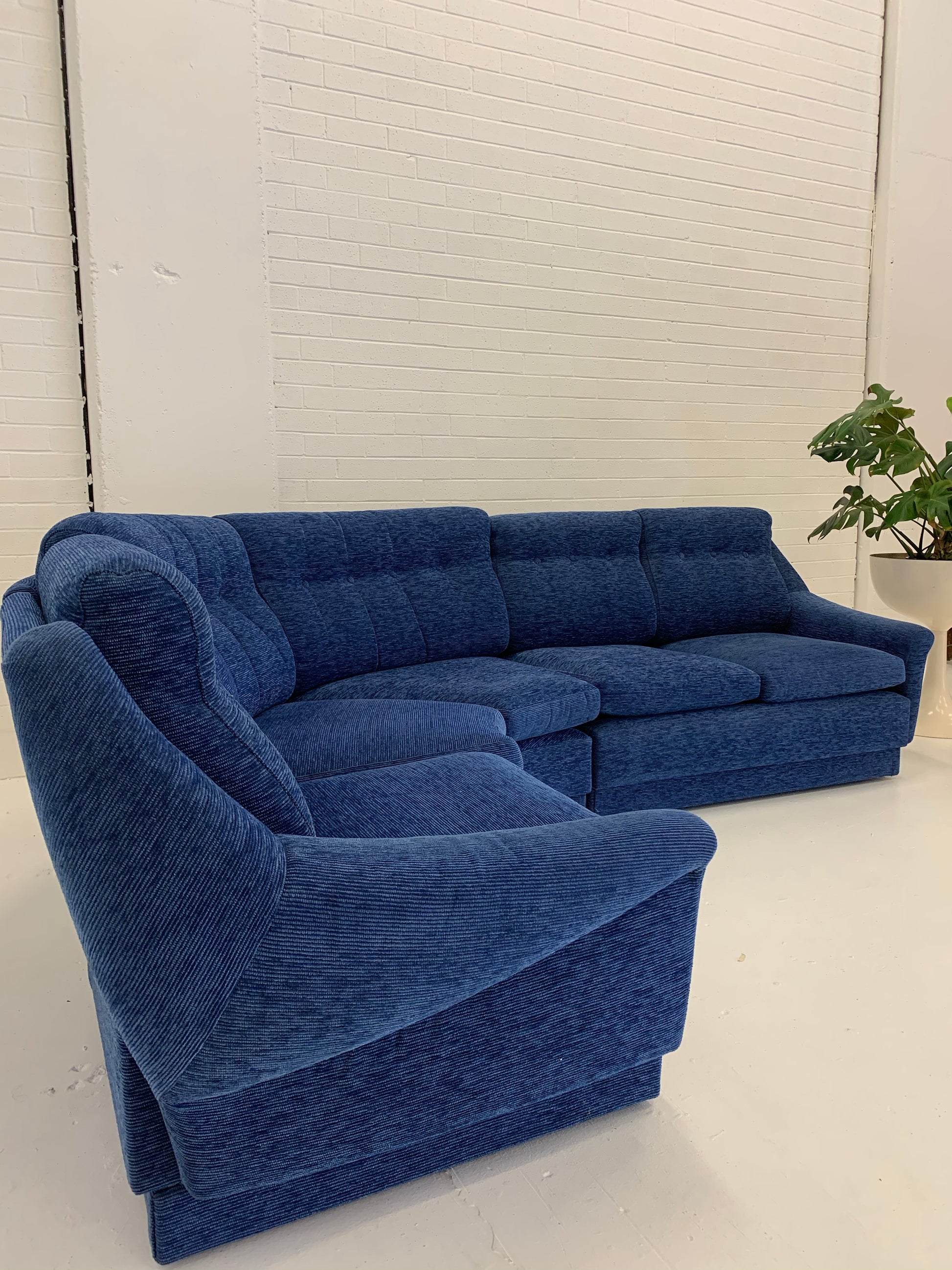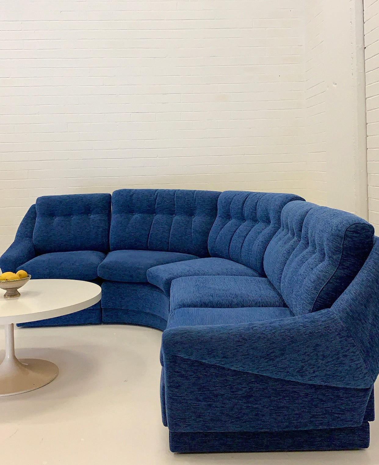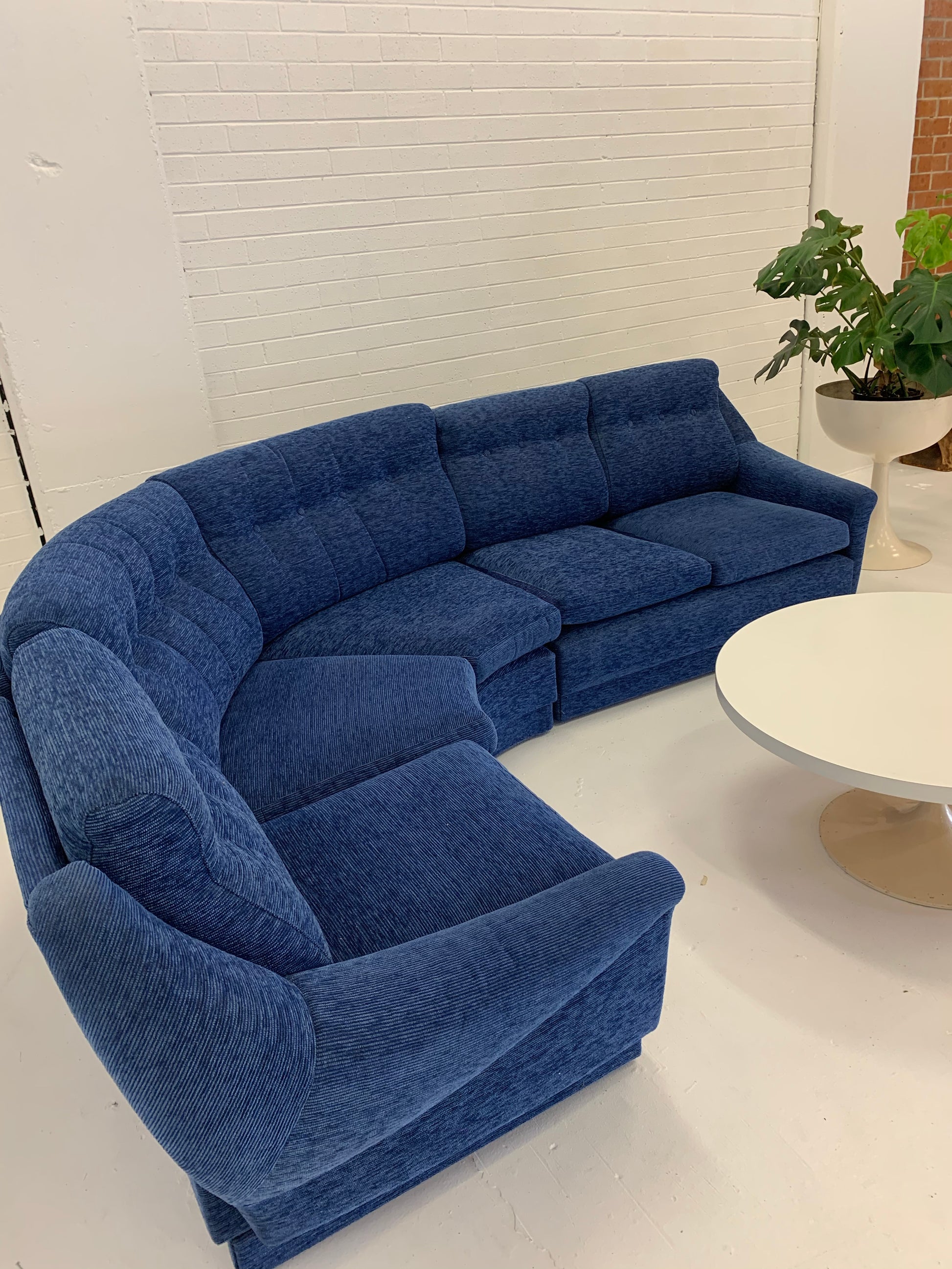 Vintage curved modular sofa by Parker with lovely arm highlights. Beautifully upholstered in a vibrant blue cord style fabric.