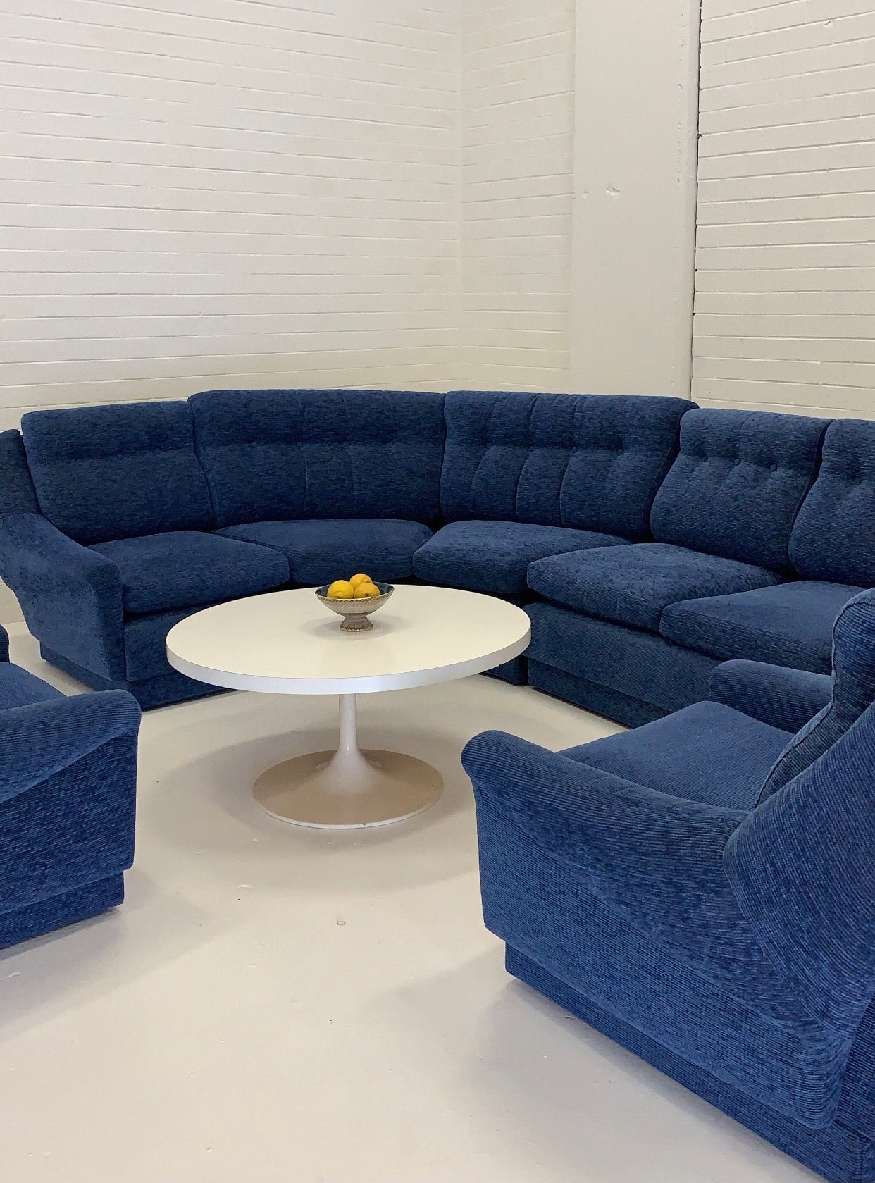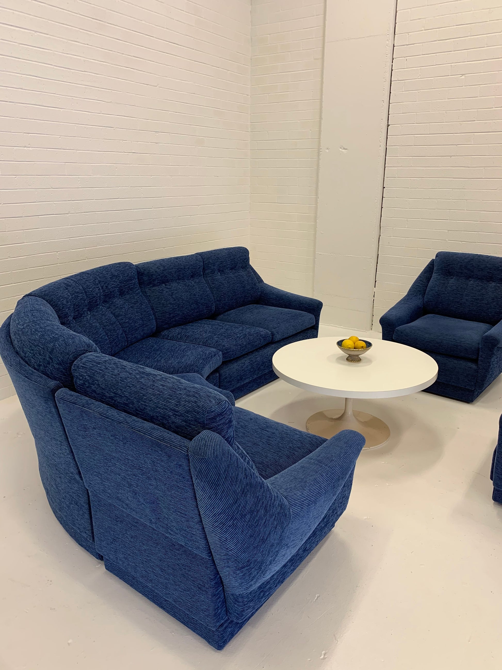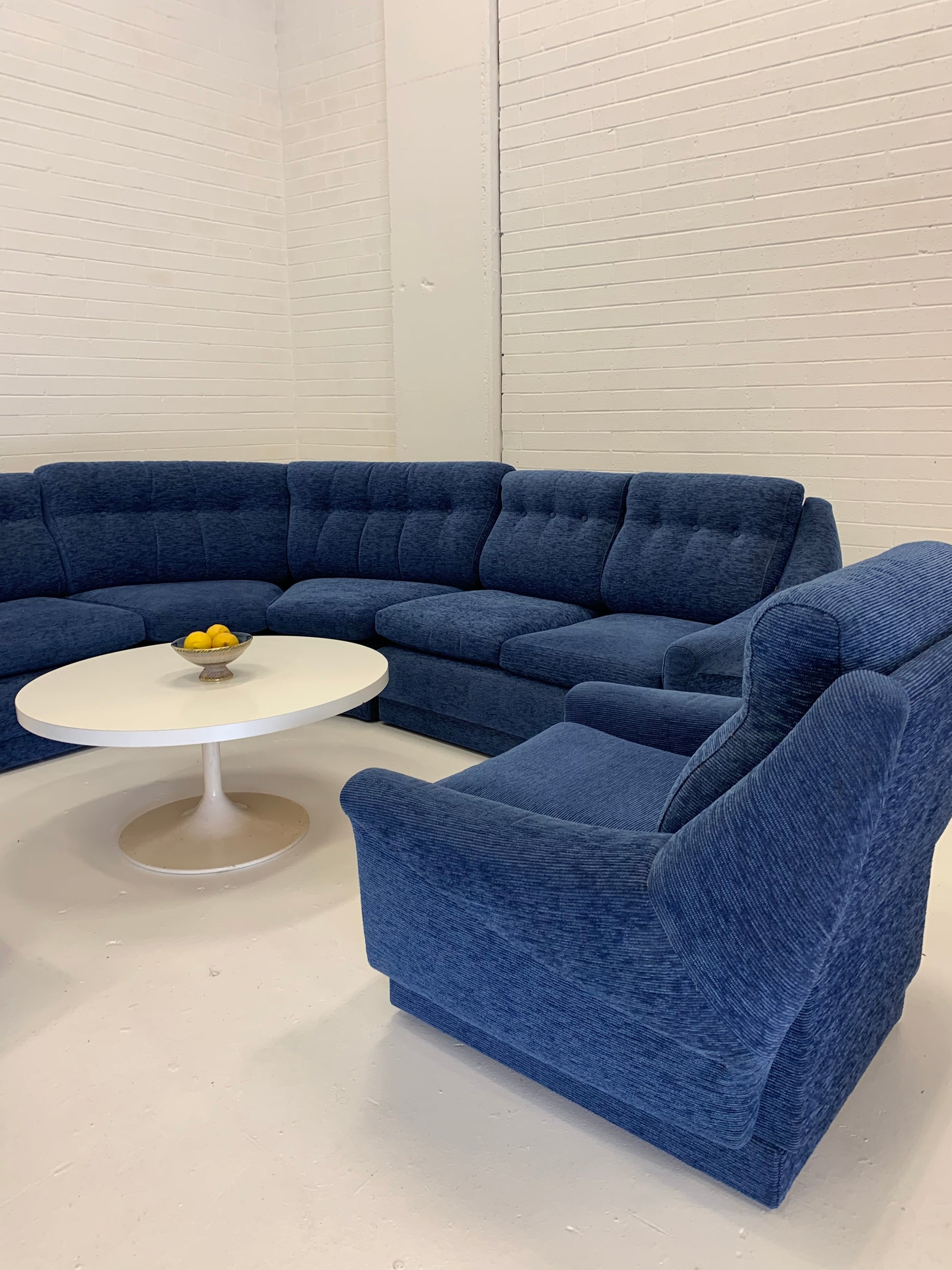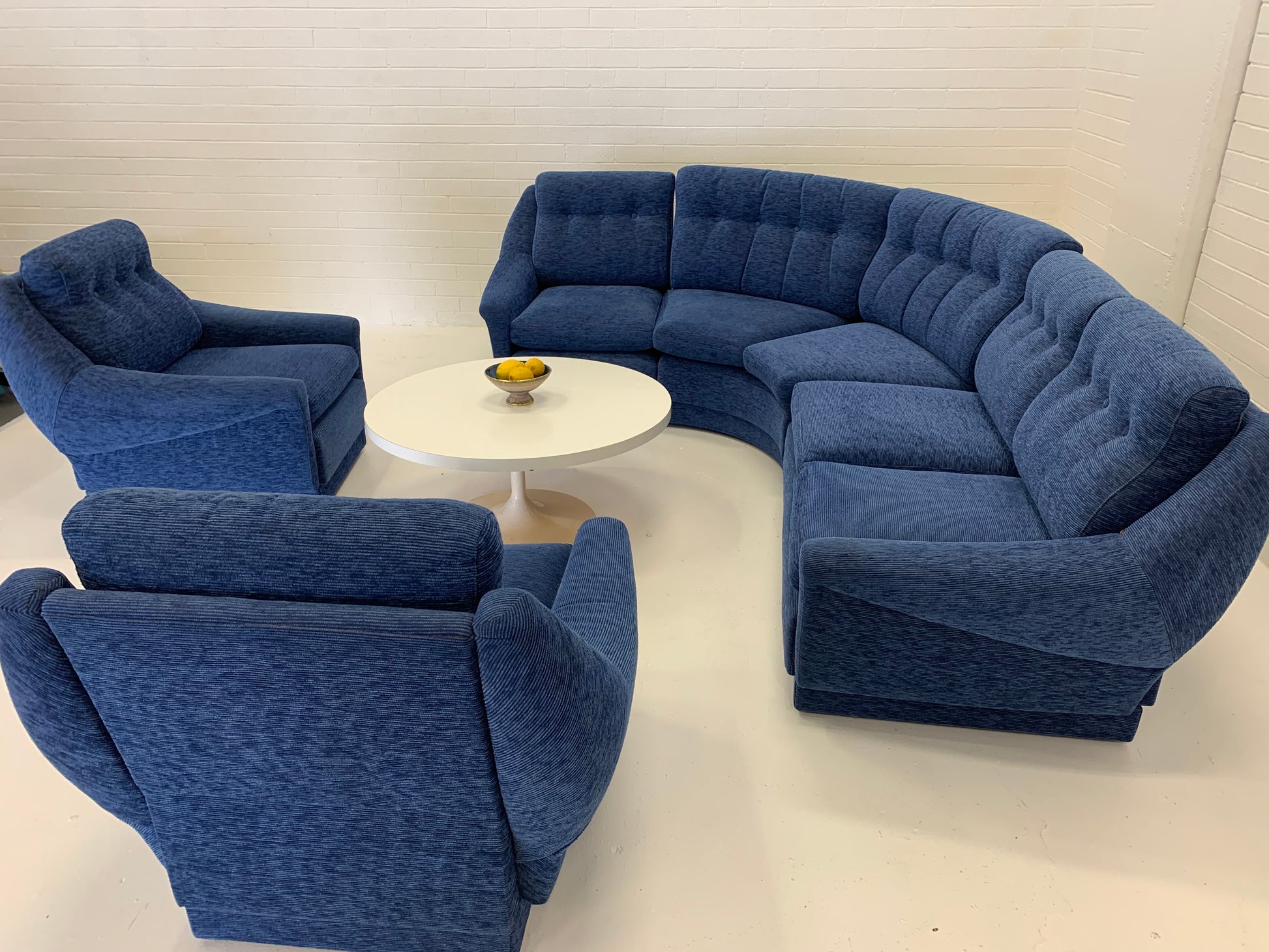 Vintage curved modular sofa by Parker with lovely arm highlights. Beautifully upholstered in a vibrant blue cord style fabric.