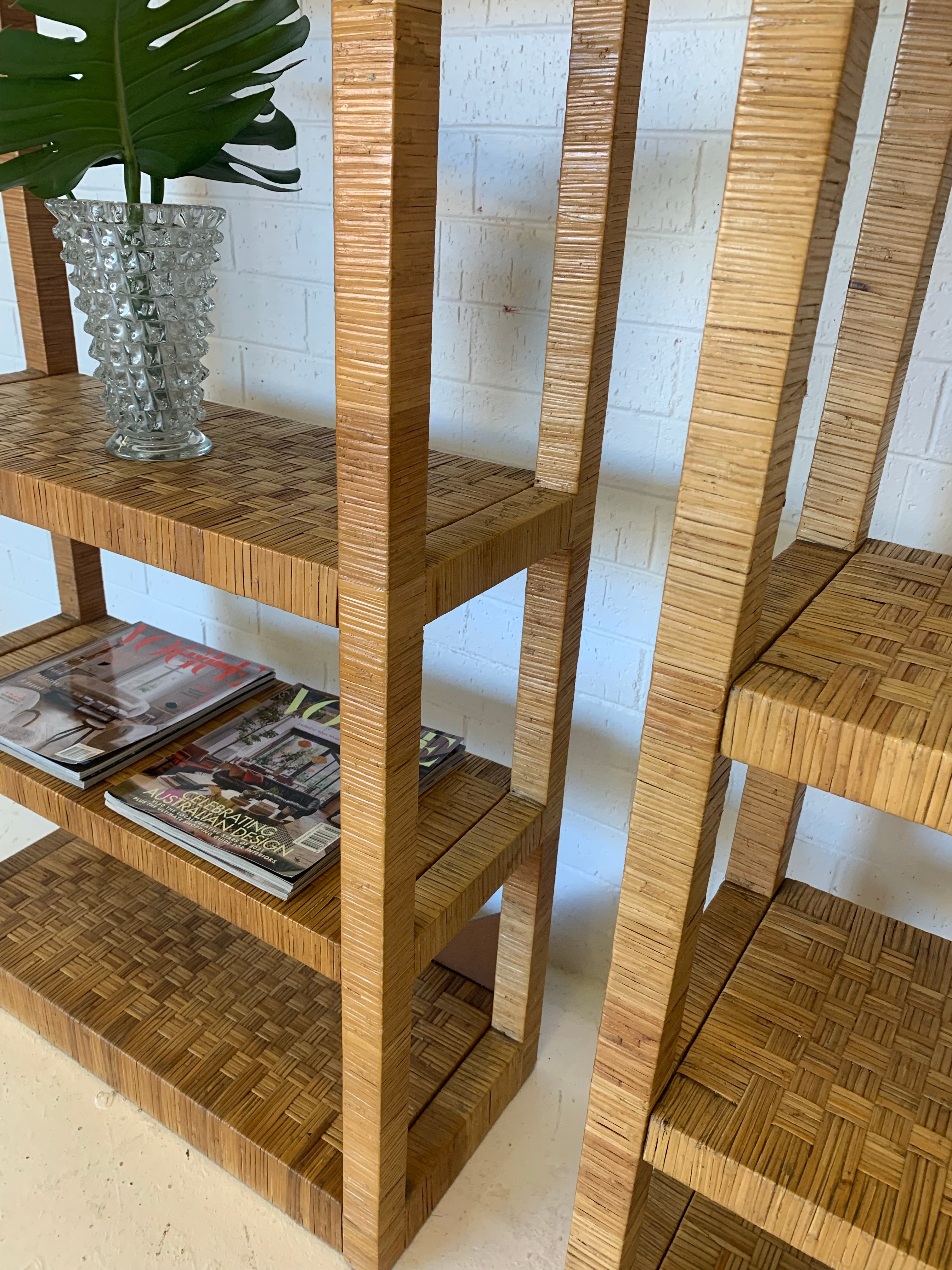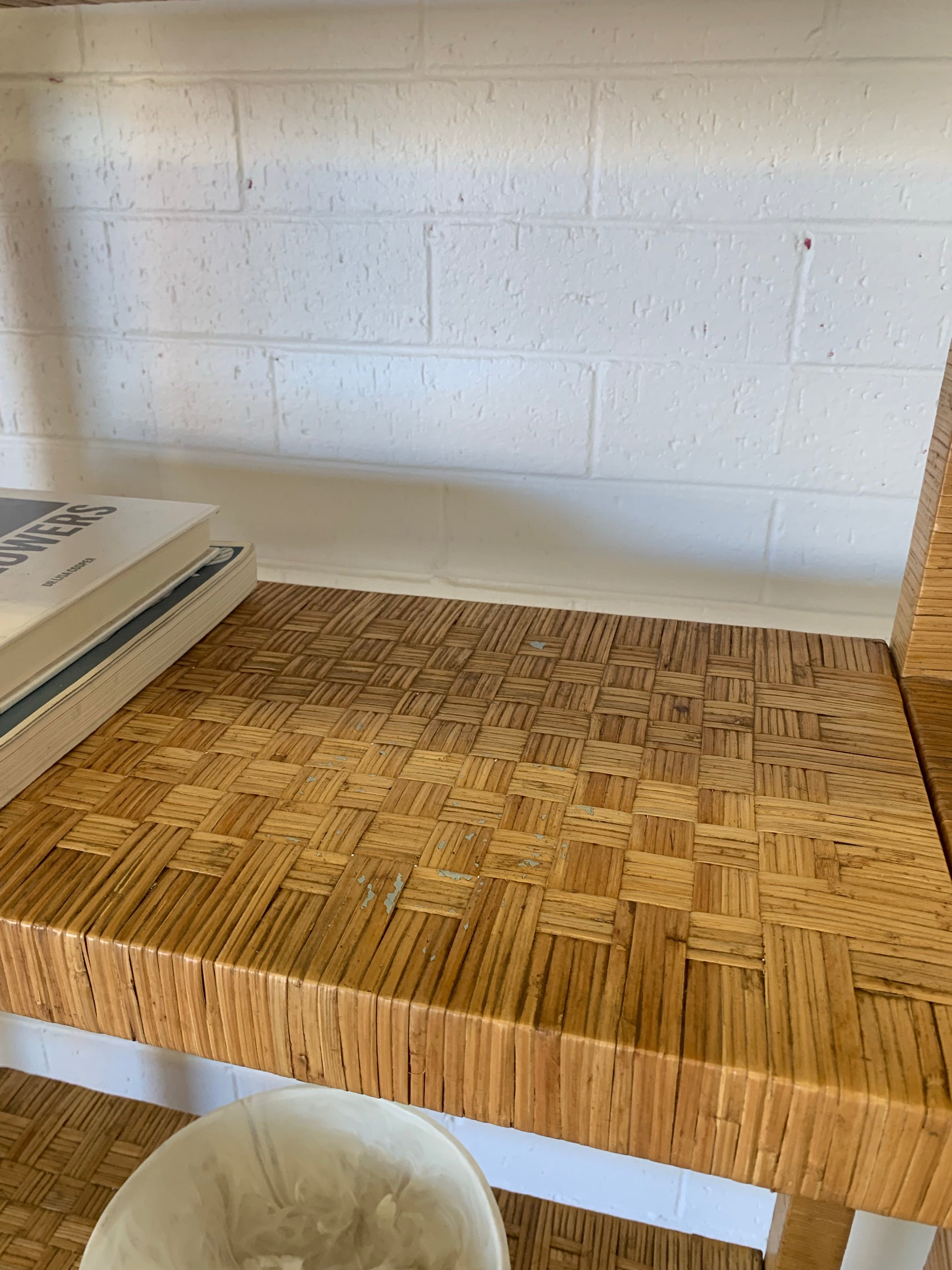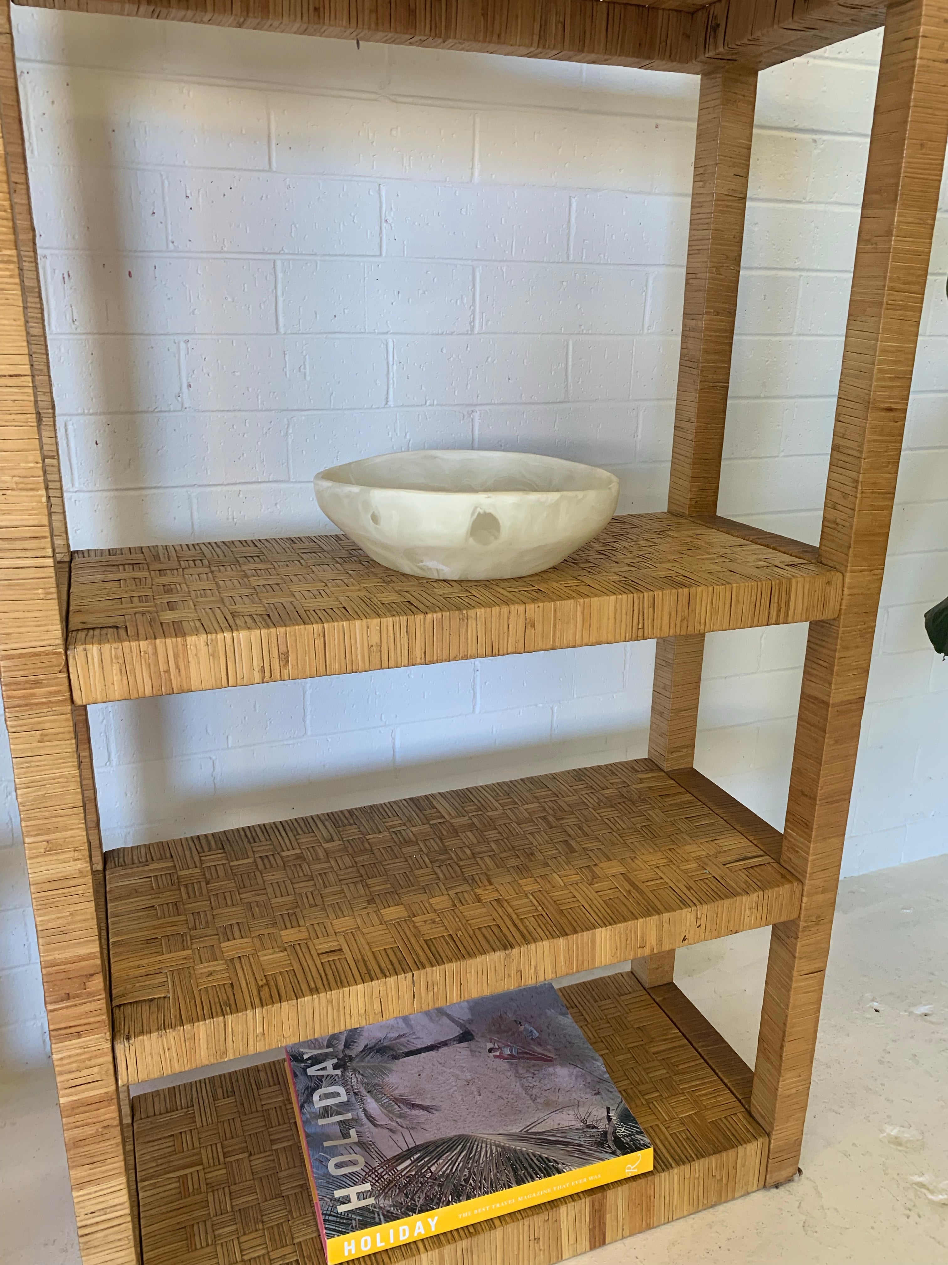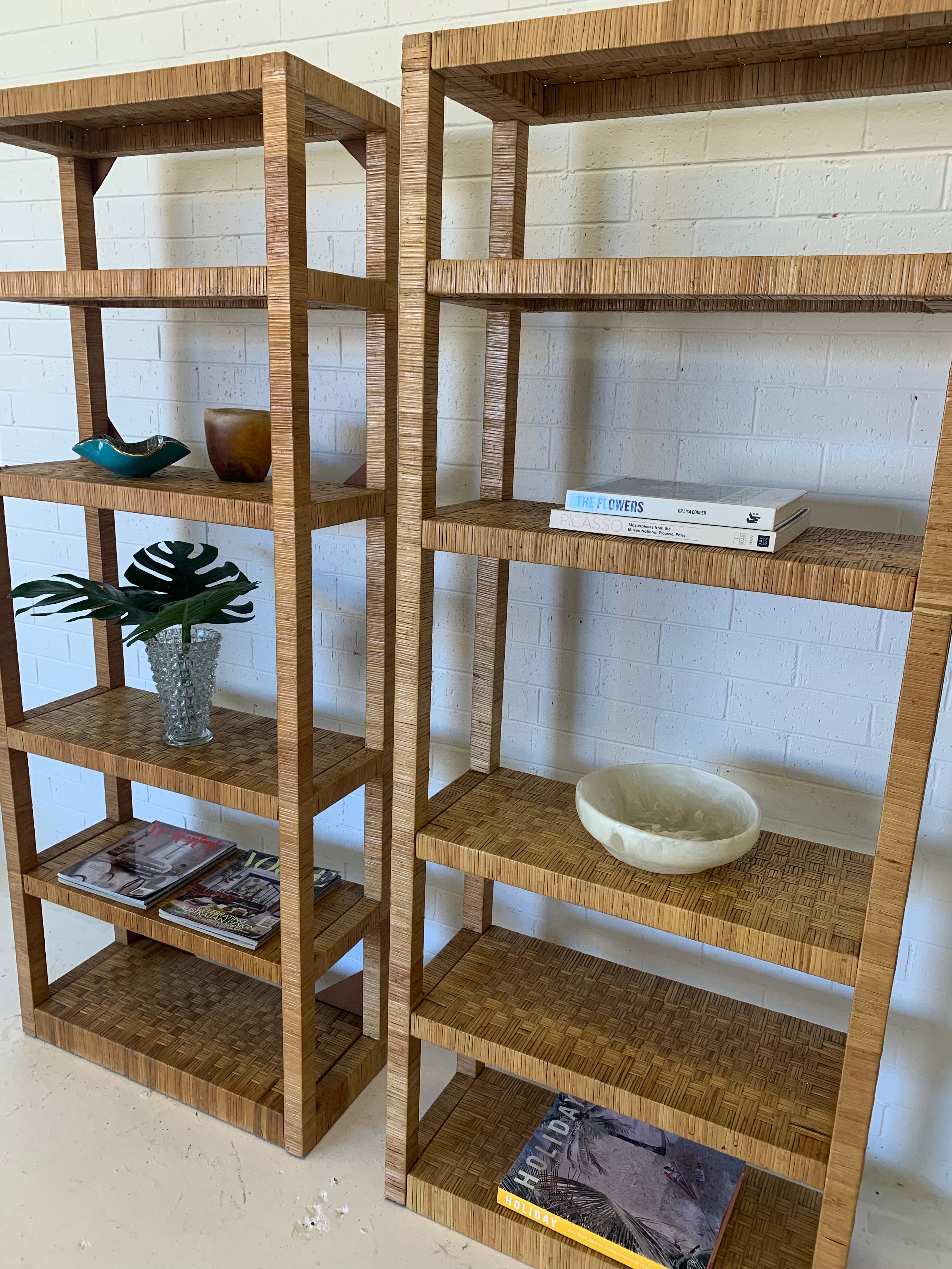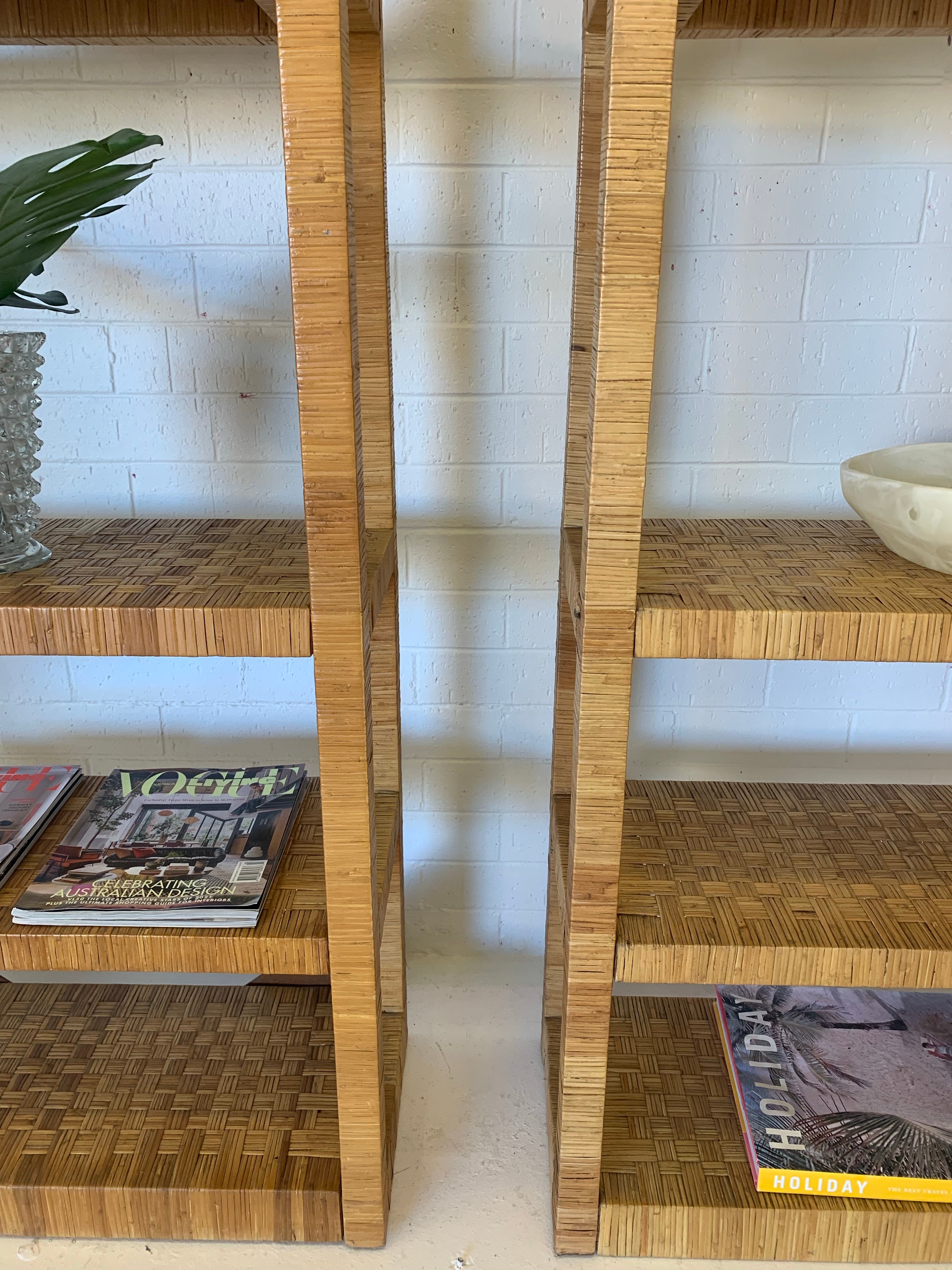 Gorgeous vintage rattan bookshelf featuring cane shelves and a lovely bound rattan frame.