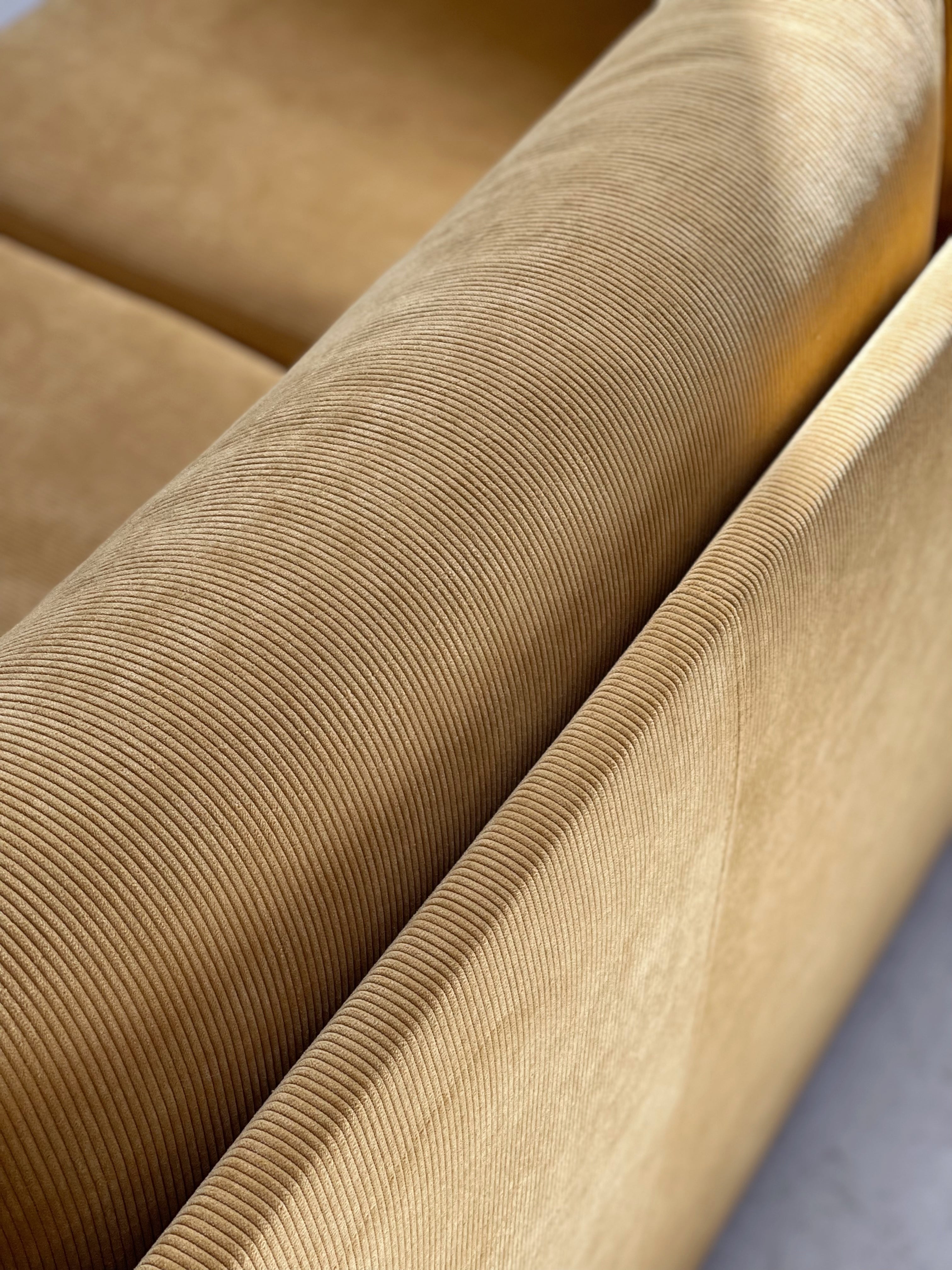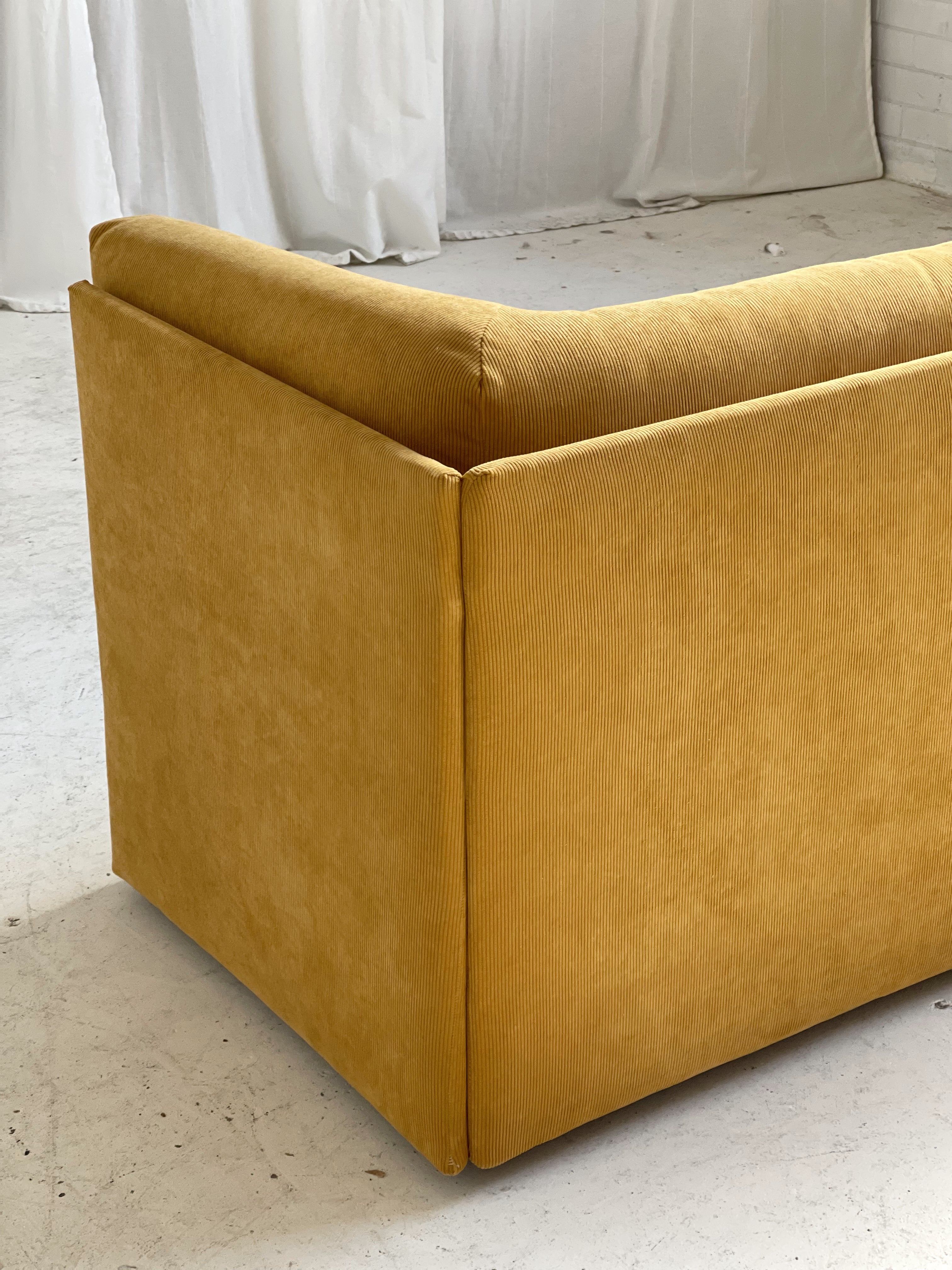Yellow Corduroy Vintage Sofa. Newly reupholstered in a mustard corduroy Warwick fabric from their Cruze collection. A lovely statement piece for your home. Super comfortable.