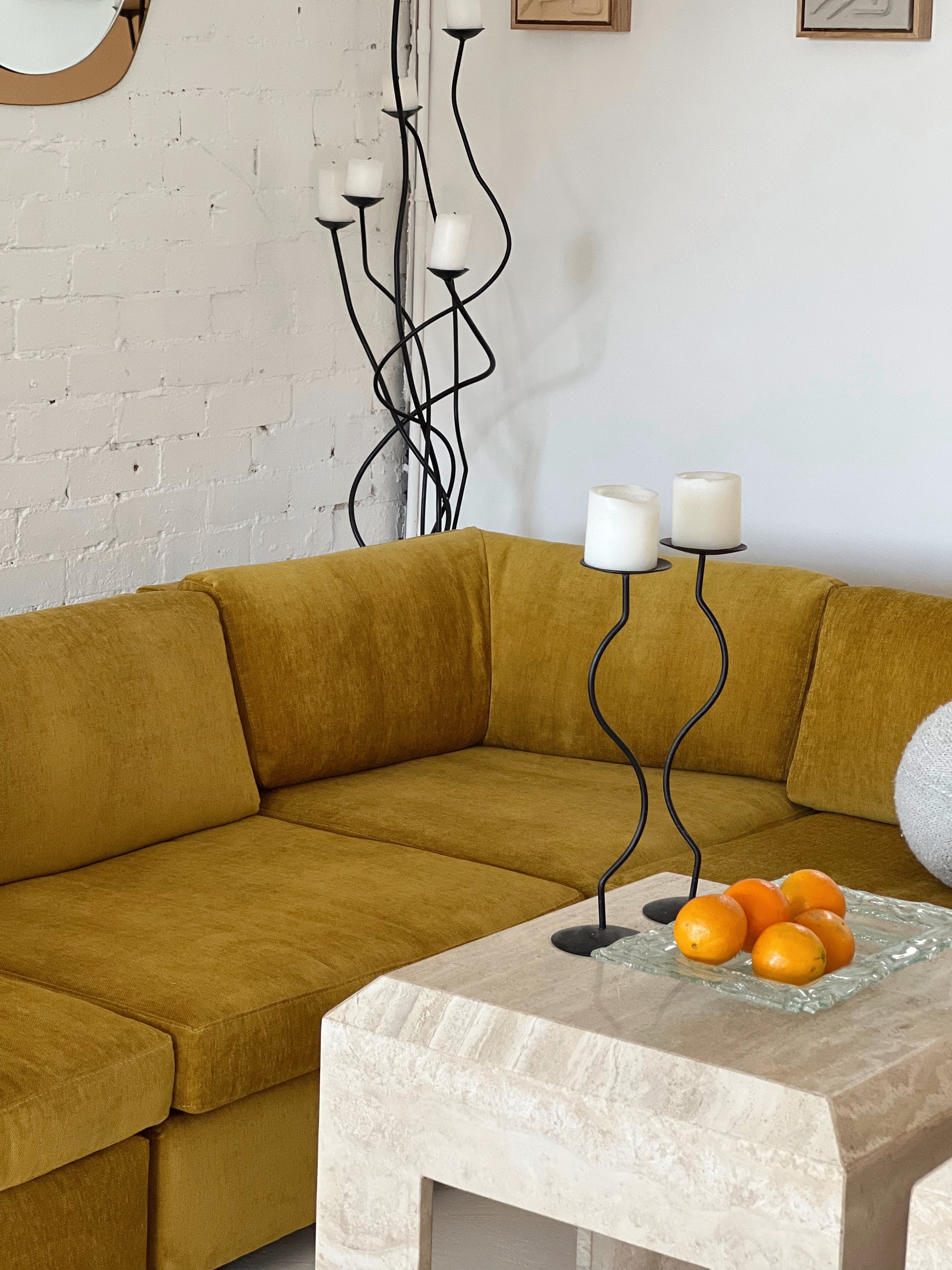 Yellow Velvet Vintage Modular Playpen Sofa. Newly reupholstered in a yellow chambray velvet Warwick fabric from their Magma collection. A lovely statement piece for your home. Super comfortable. Consists of six pieces, arrange the modules however you like.