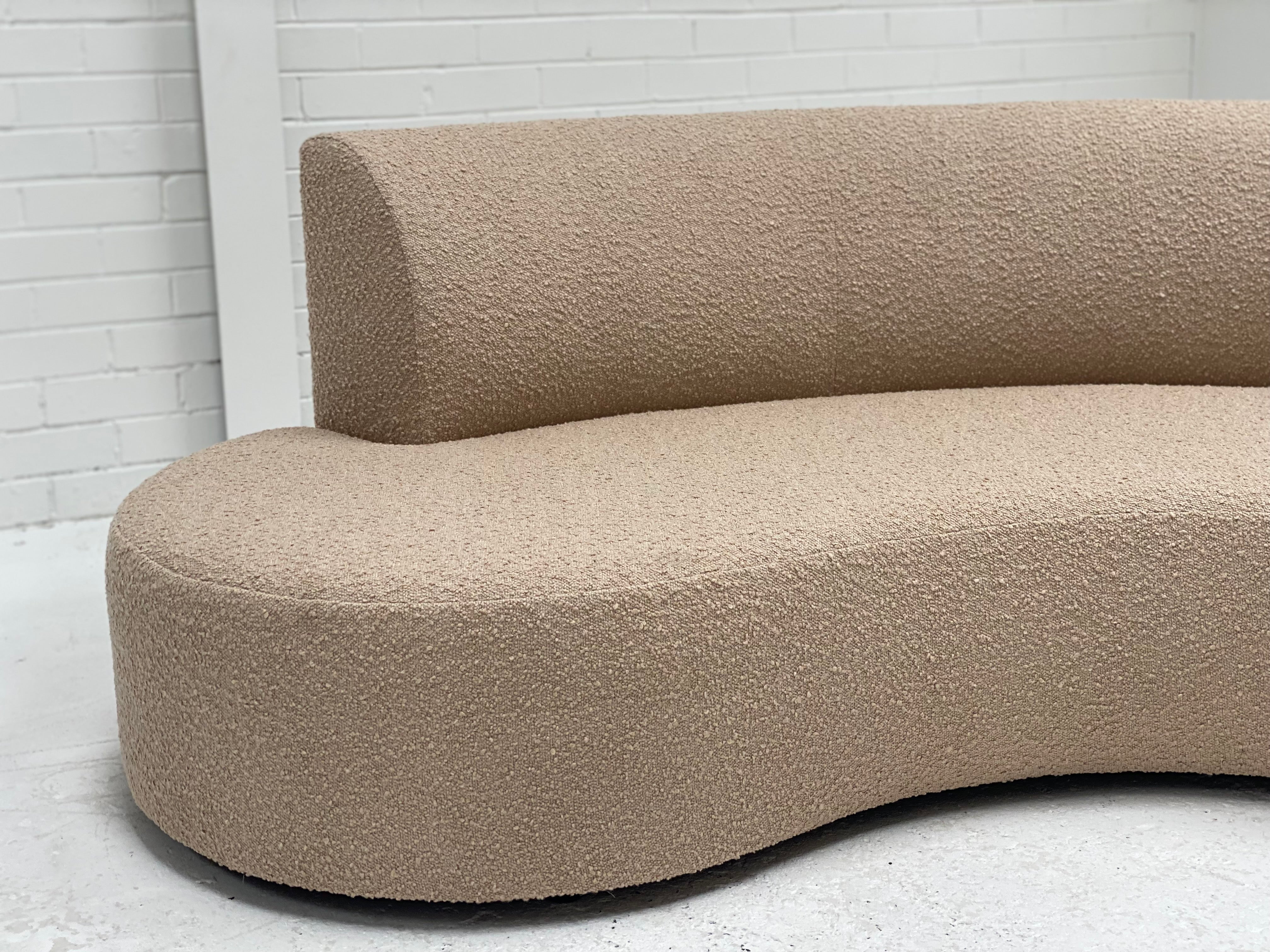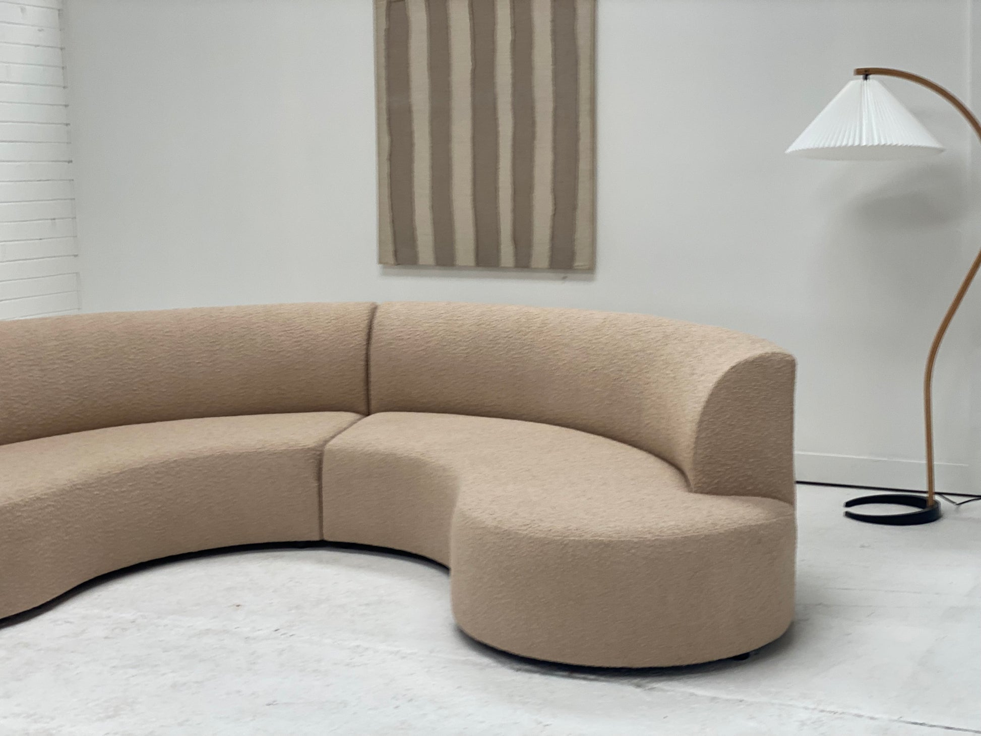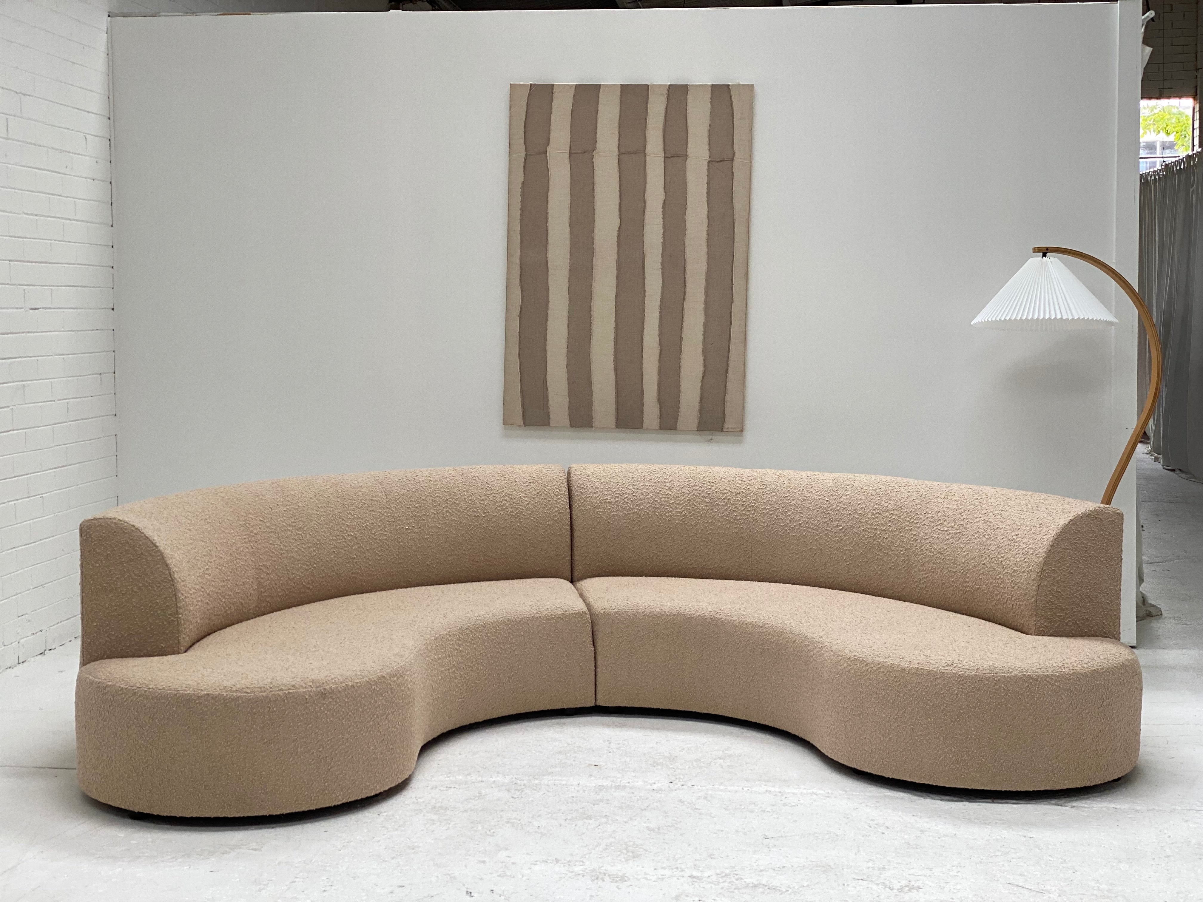 Curved beige boucle two piece modular sofa. Gorgeously shaped, this sofa is extremely well made and comfortable.