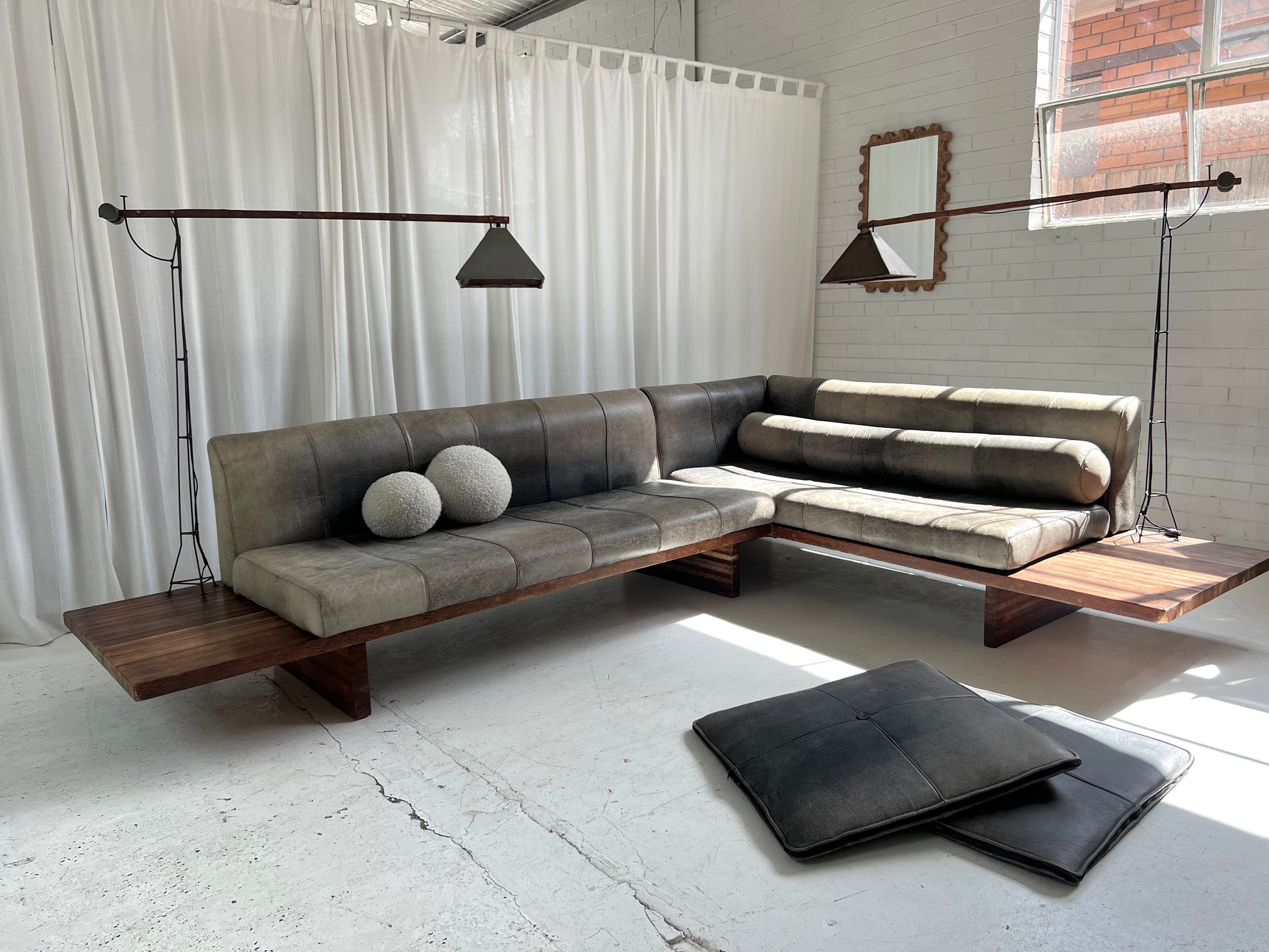 Two flat leather floor cushions and large leather bolster cushions are included in the set. (Note the two white boucle ball cushions and are not included and are for styling purposes only)