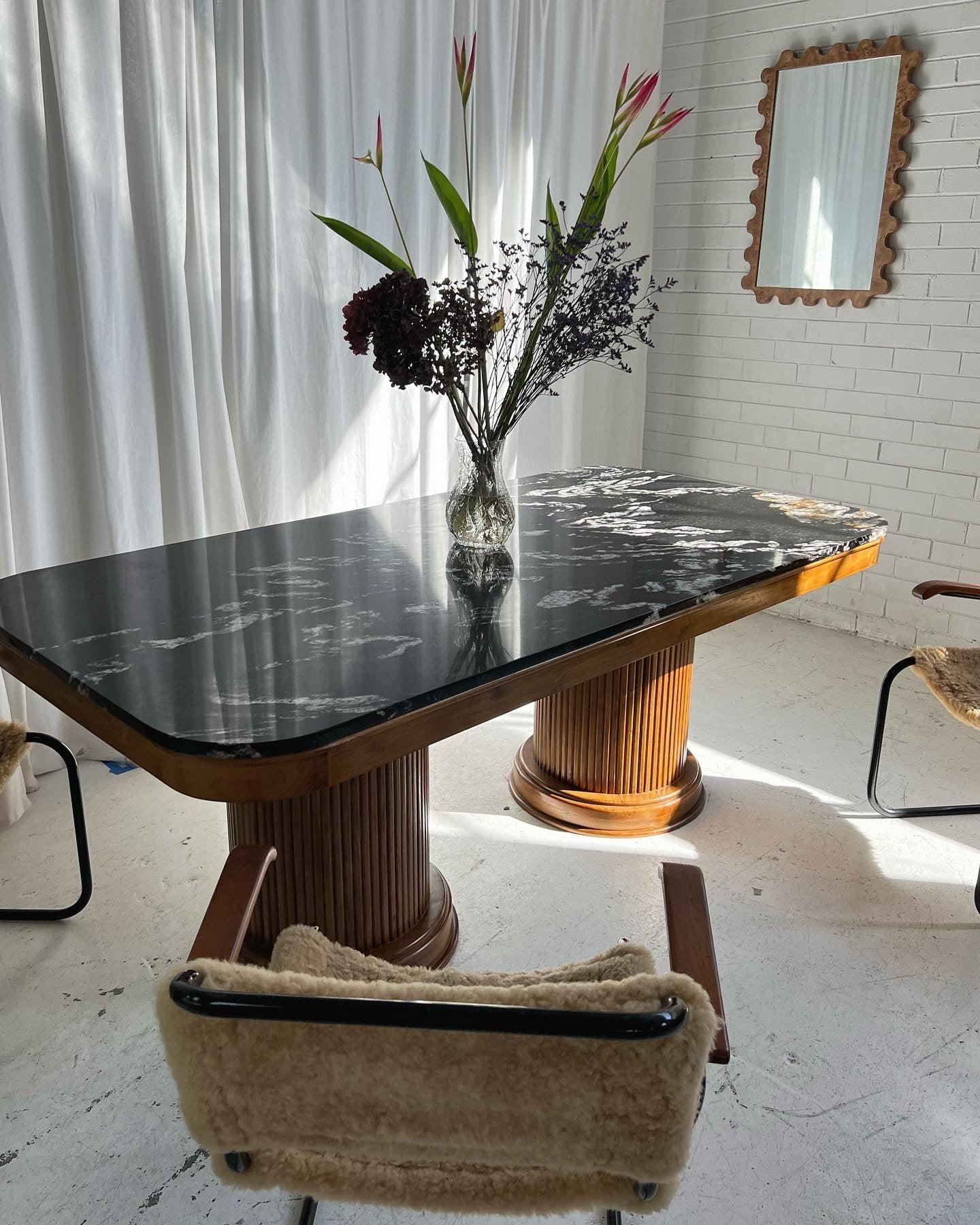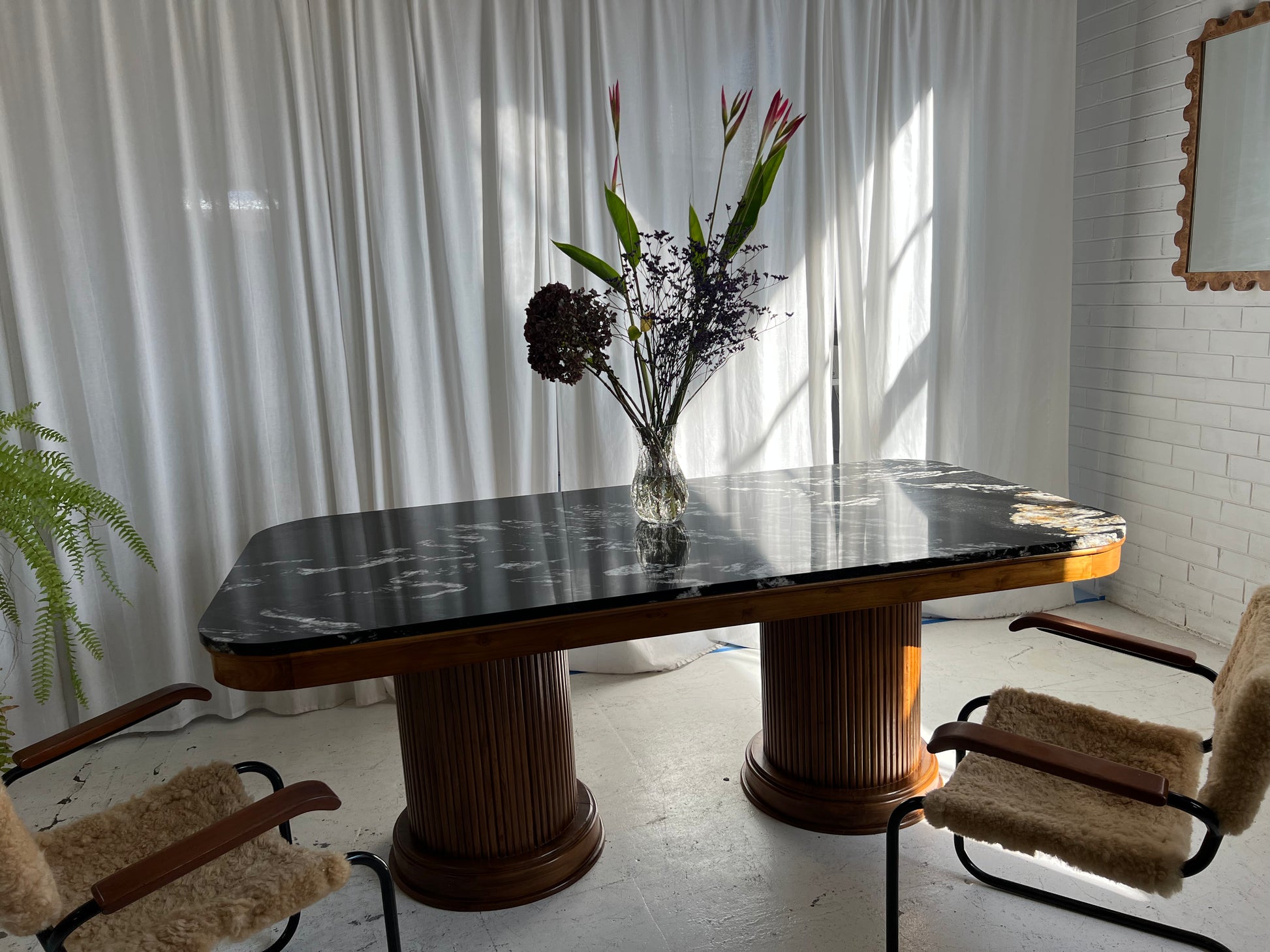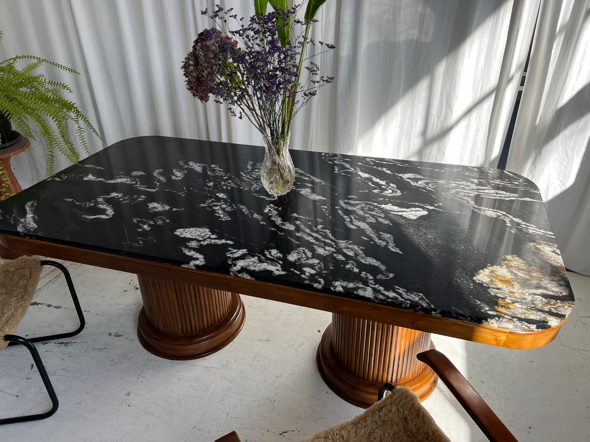 This unique piece is as new and consists of the most spectacular black marble from Italy and chunky cylinder wooden legs. The marble sits atop a sturdy wooden structural frame and slots into place.