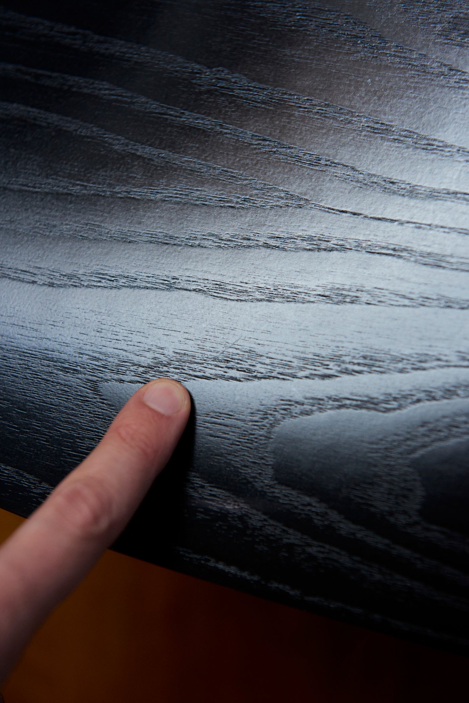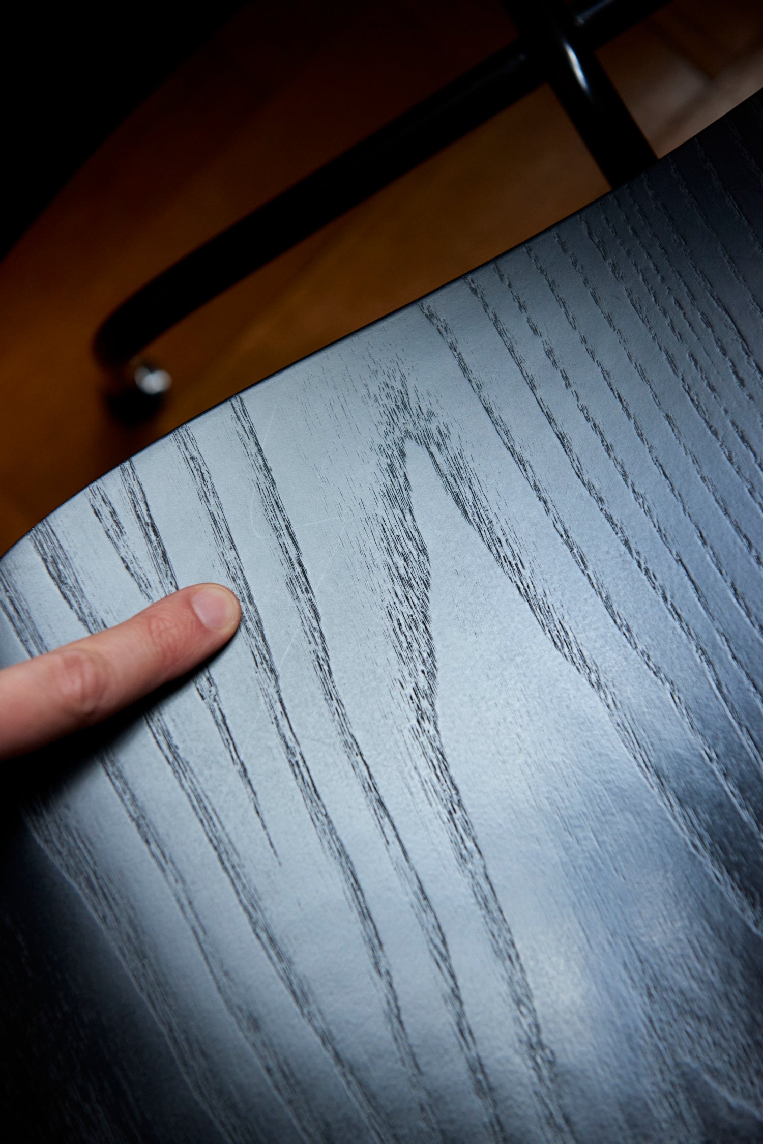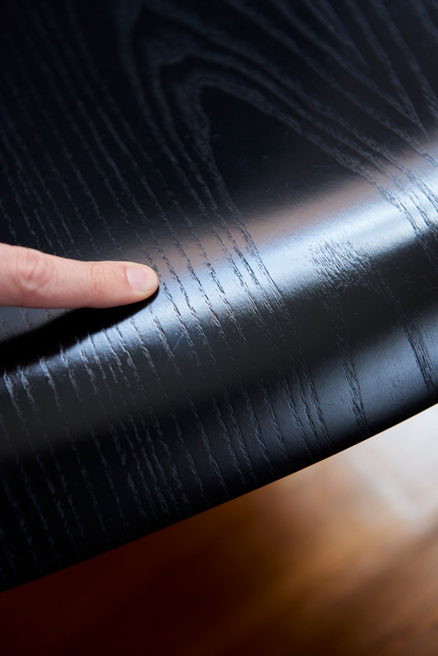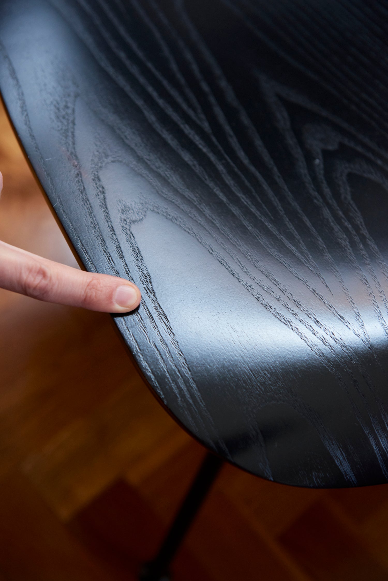 Moulded Plywood (American Ash), stained black; powder coated black metal base