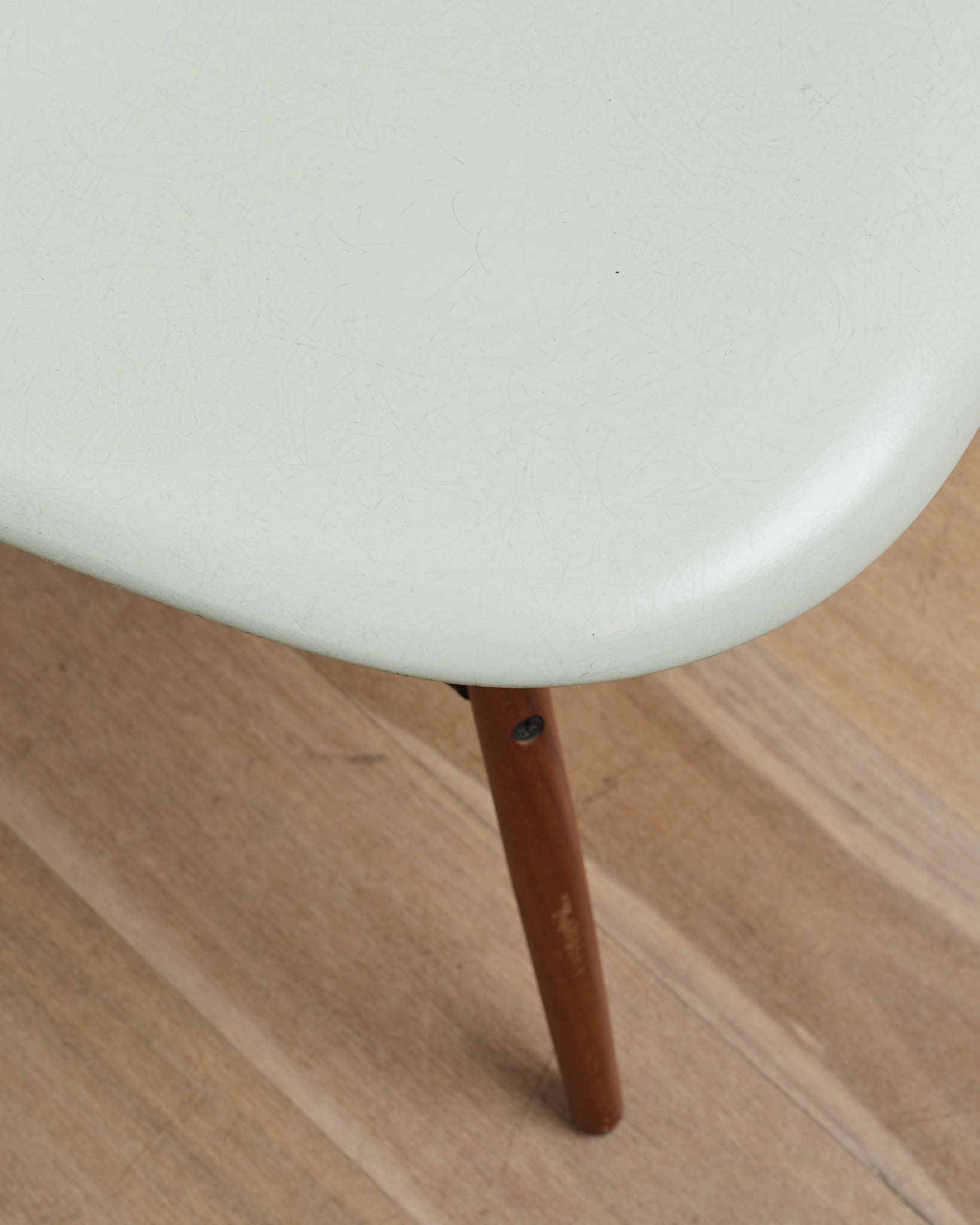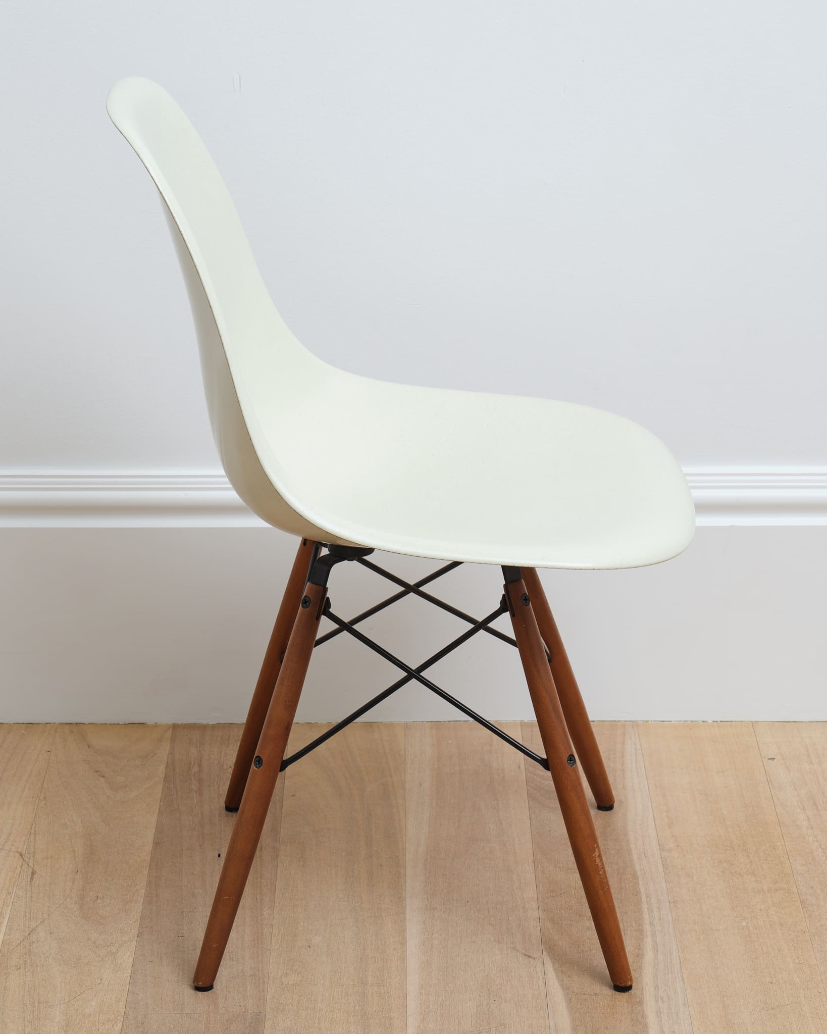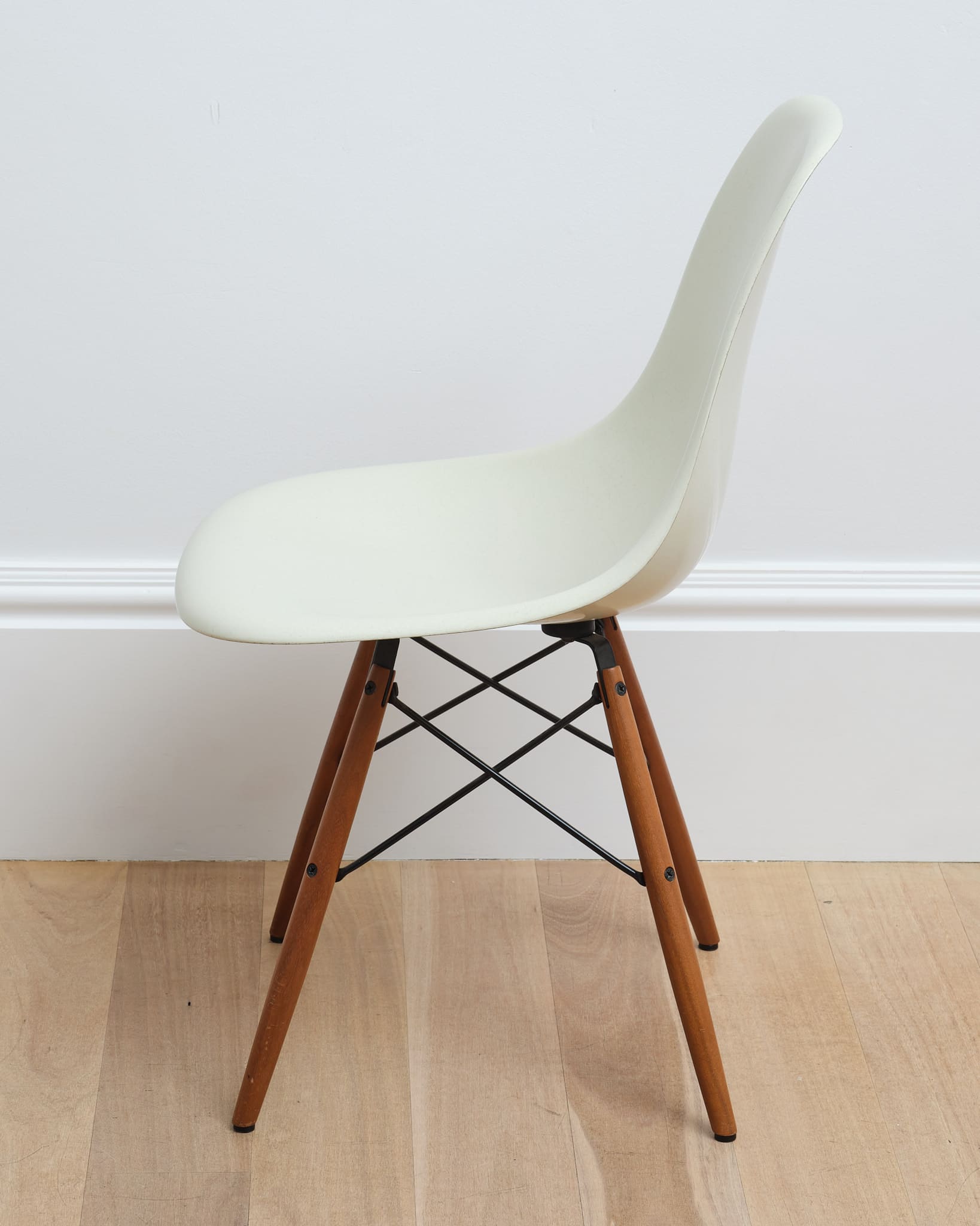 This Eames Moulded Fibreglass Side Chair is in great condition. Slight scratches on wooden legs. Fibreglass shell is in good condition with slight scuffing.