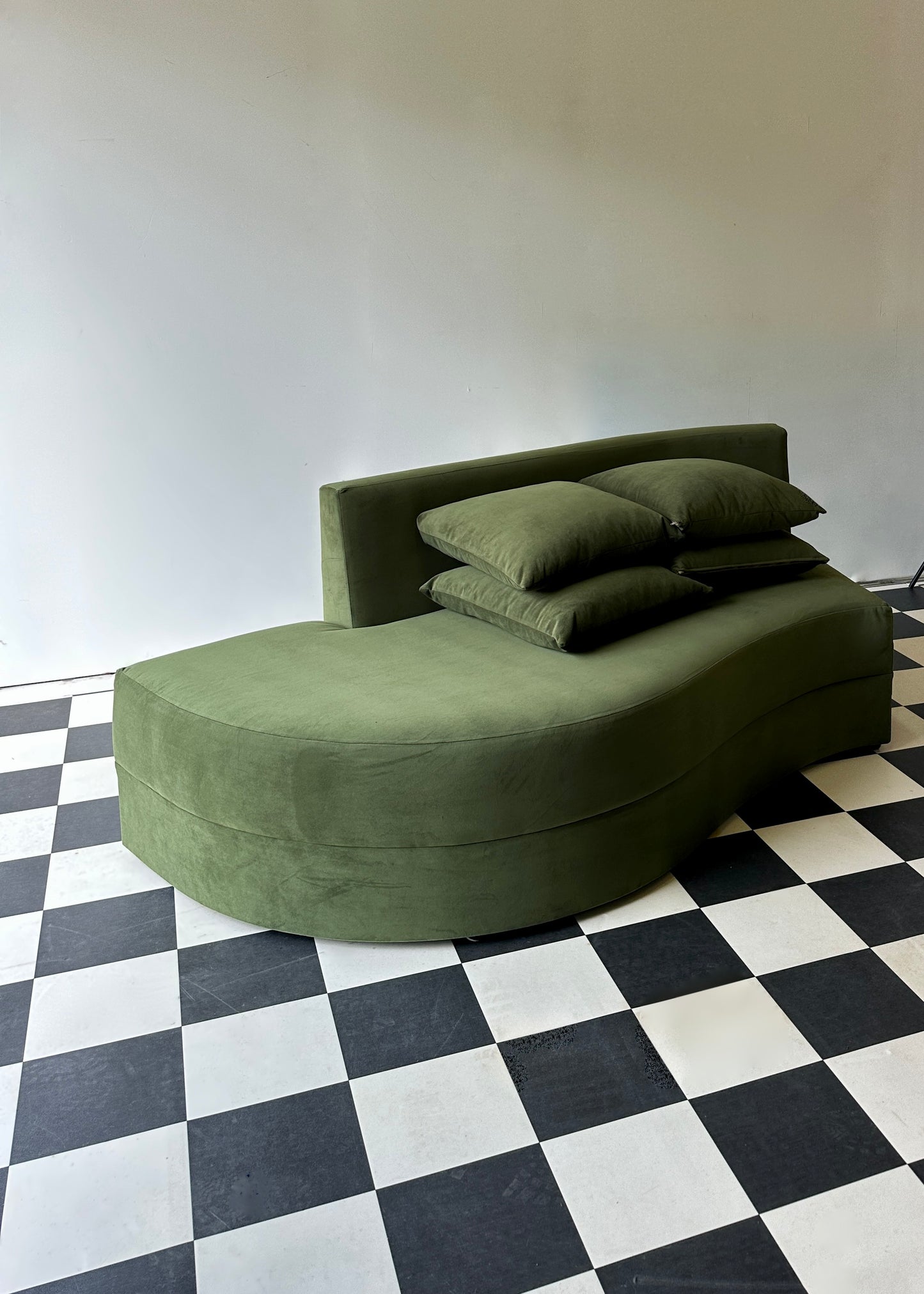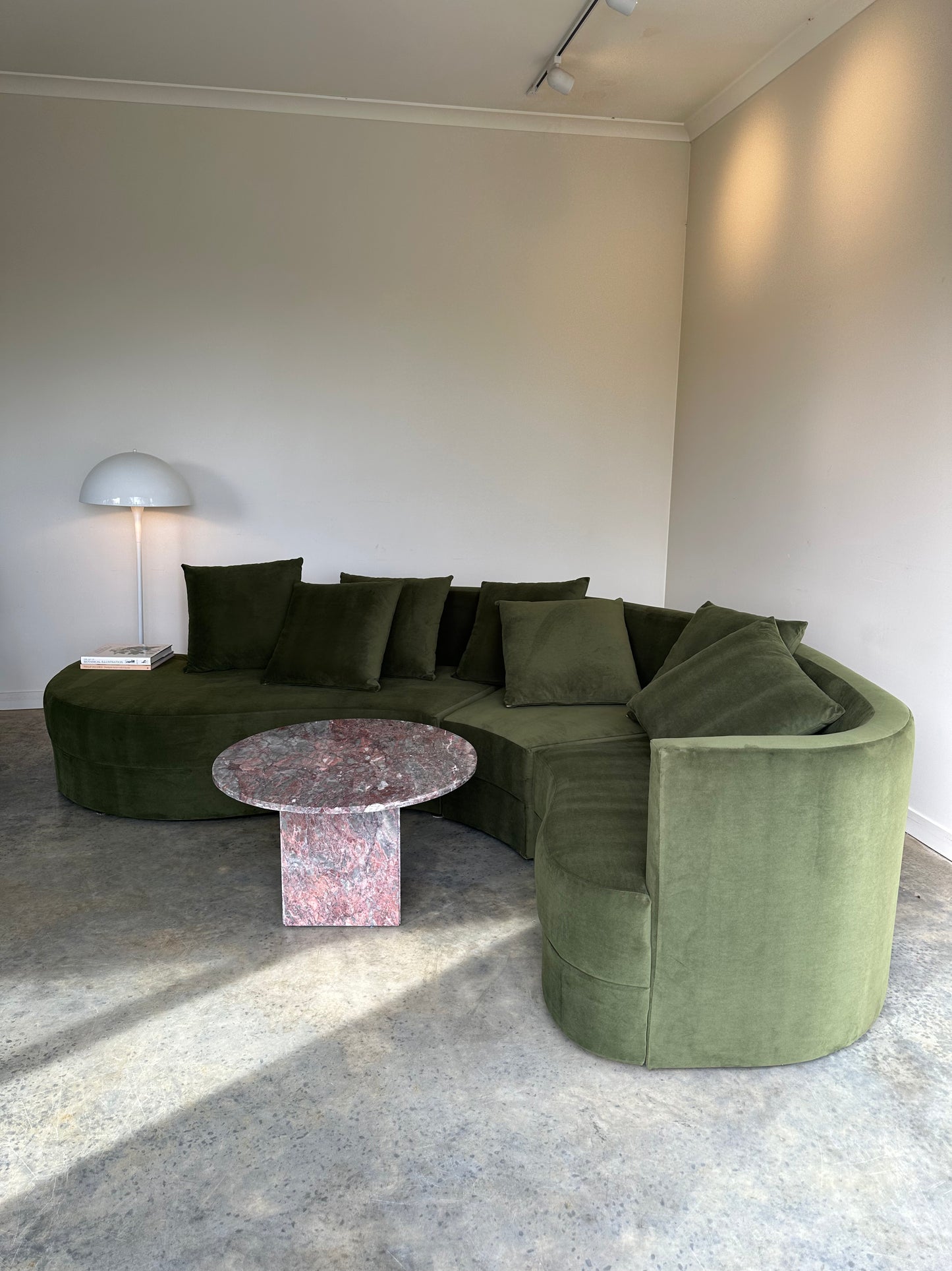 This beautifully sofa has been freshly restored and reupholstered in a beautiful premium dark green velvet by Warwick Fabrics.