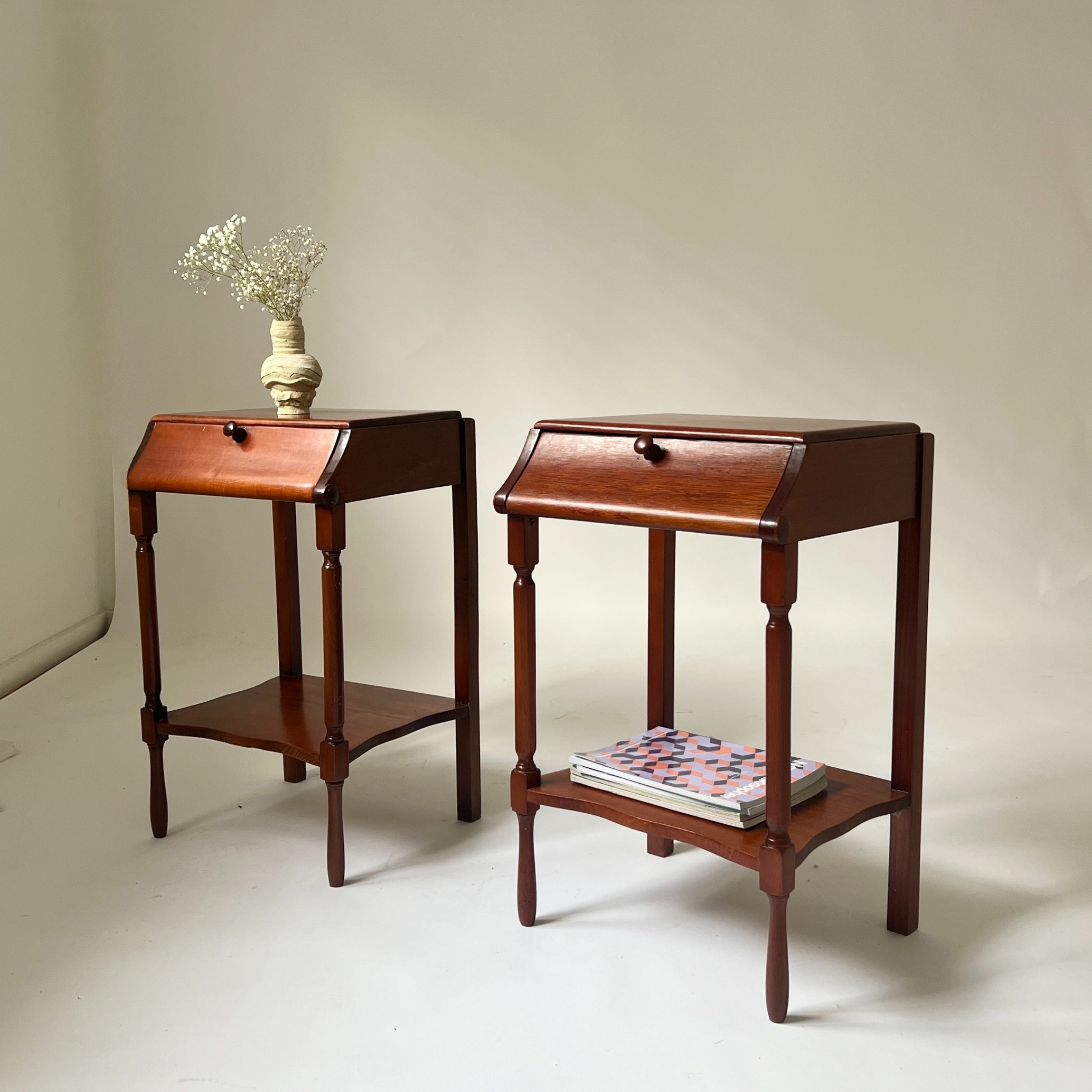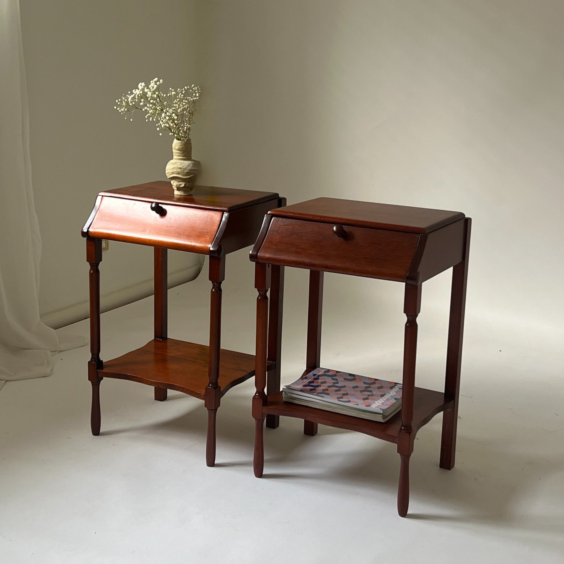 Elegant vintage timber bedside tables, c. 1940-1950s. Lift-down front reveals storage area.