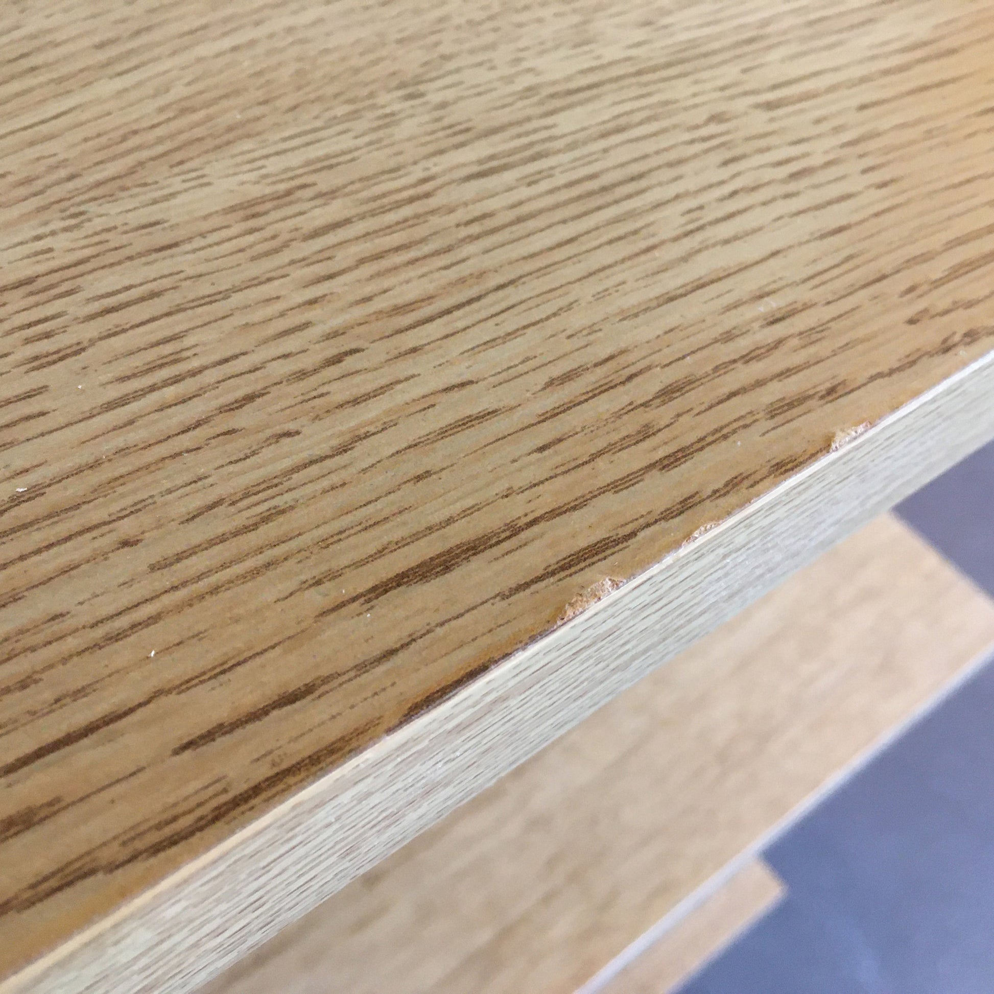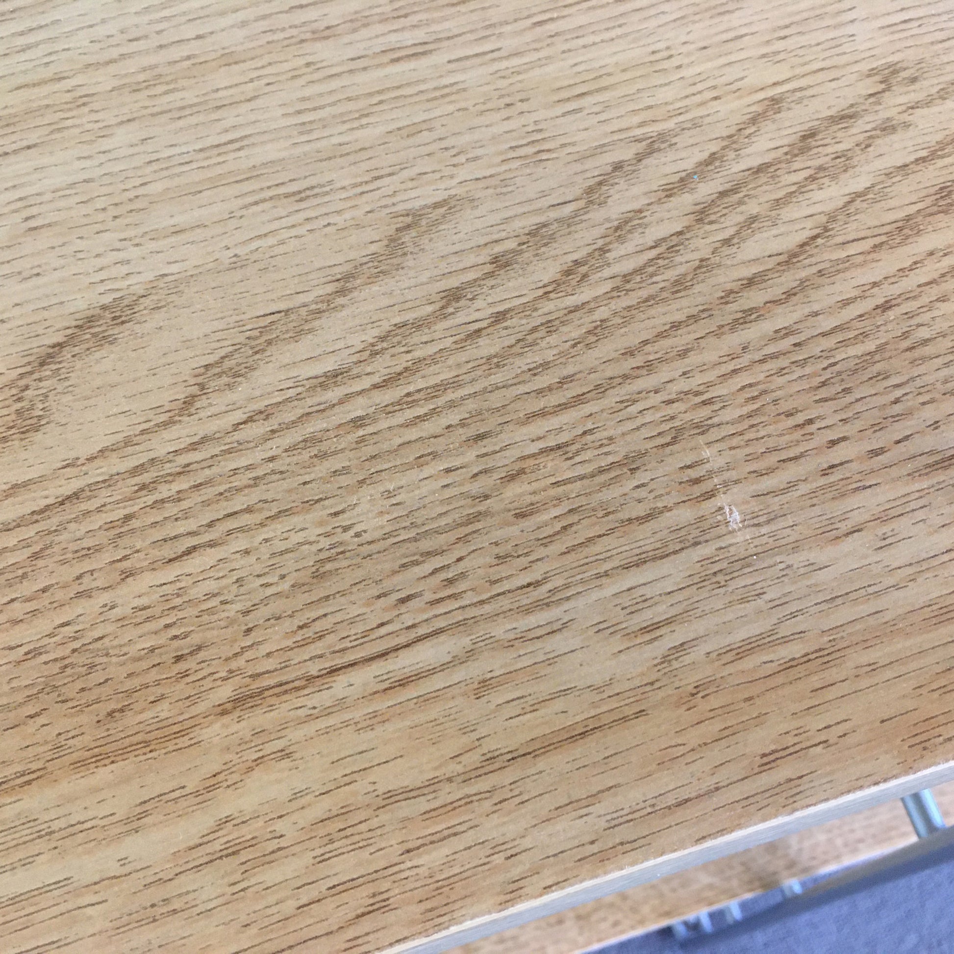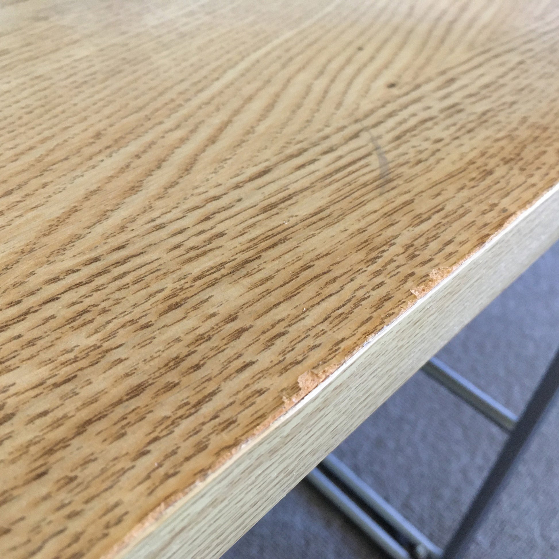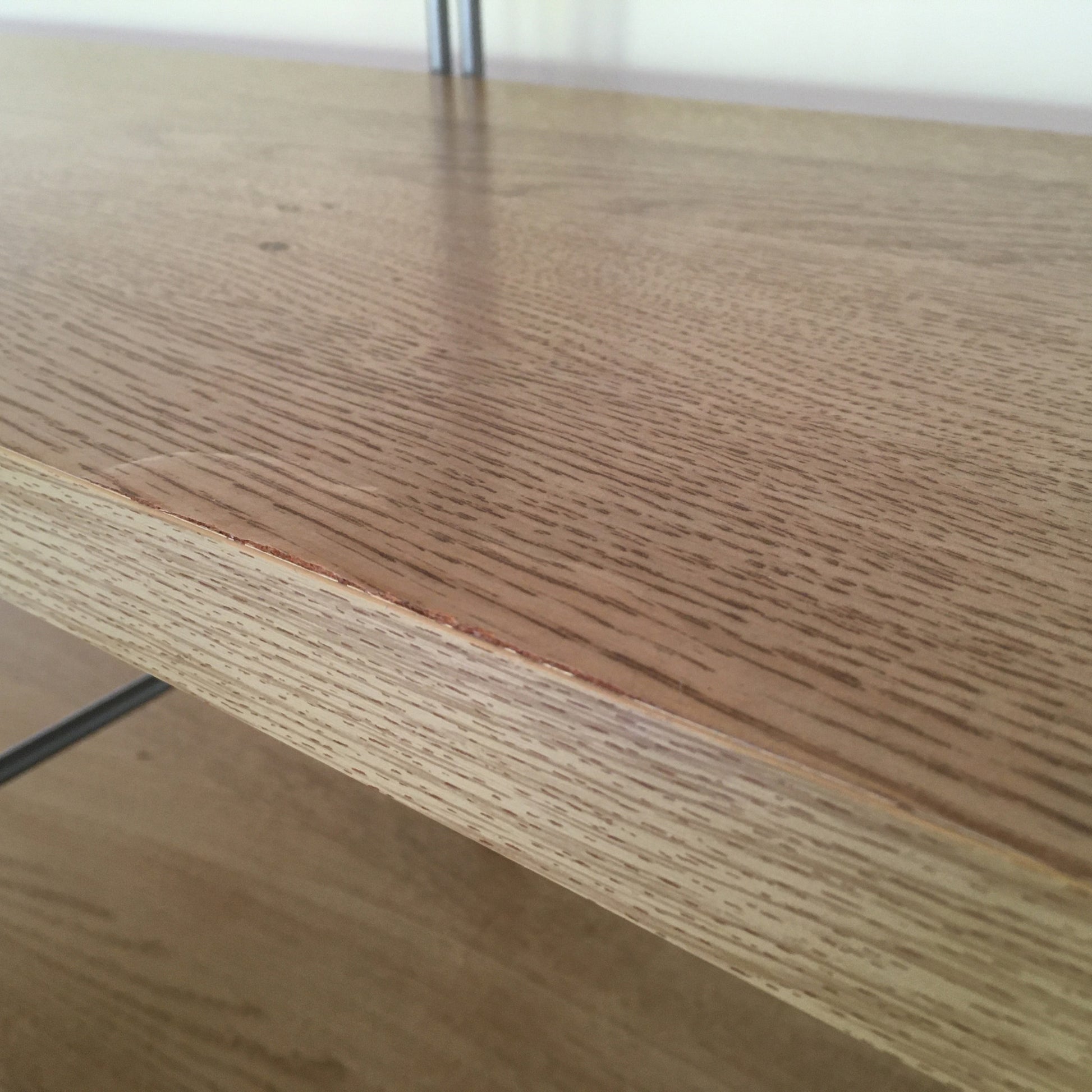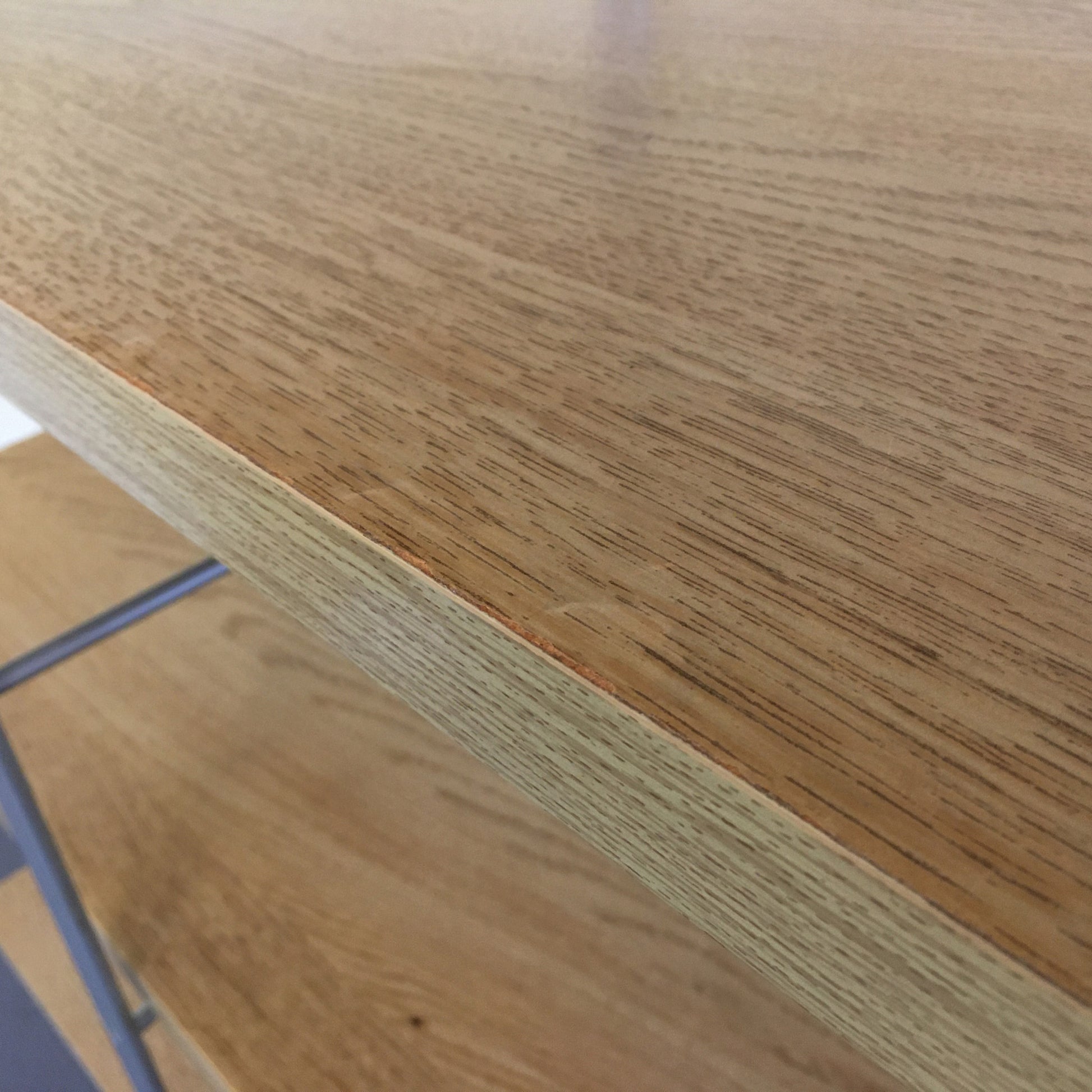 Two areas of minor swelling of oak veneer (See photos) and some minor chips and scratches to veneer. Some scuff marks/scratches across the length of the steel frame as shown in photos. One side of the steel supports has slightly bent metal.