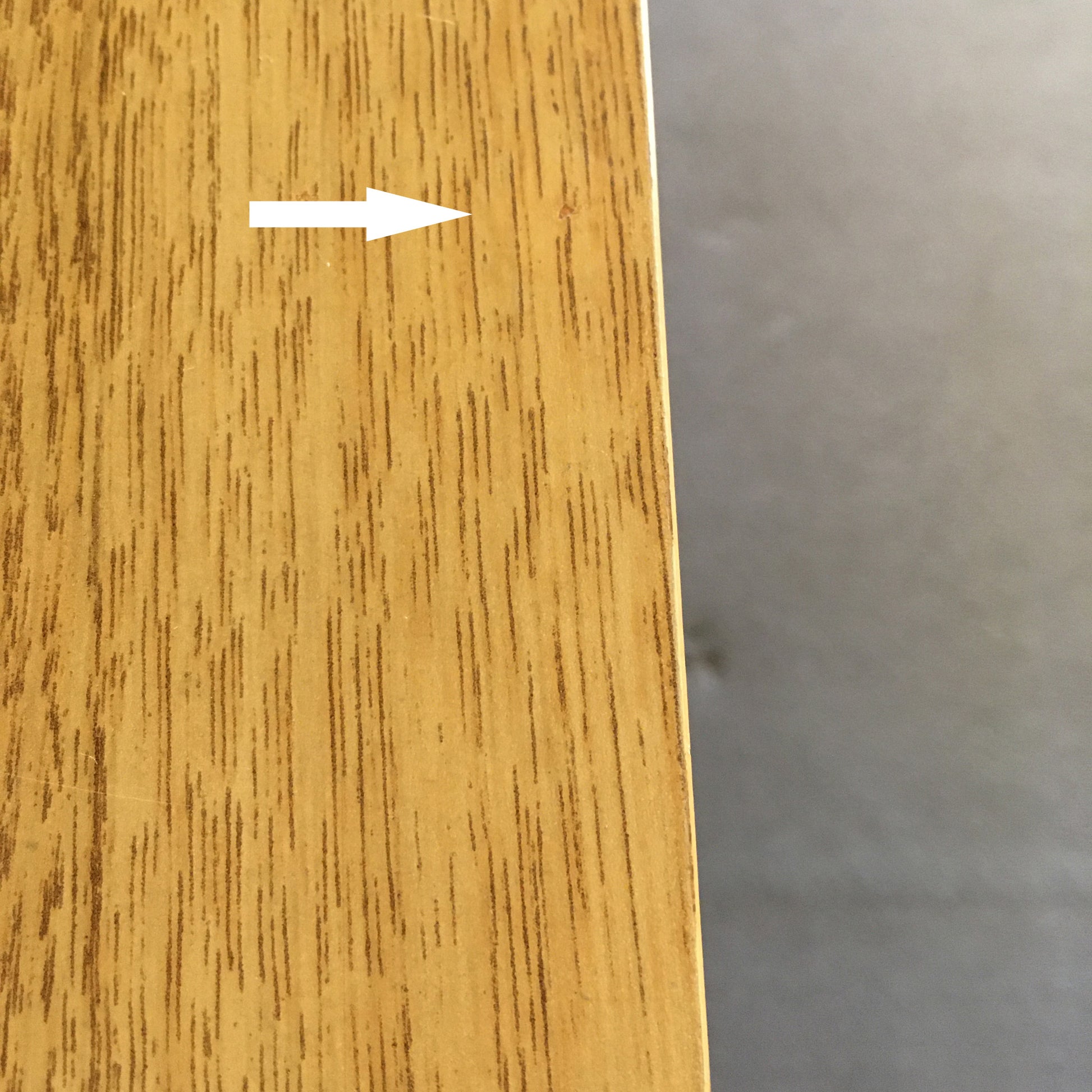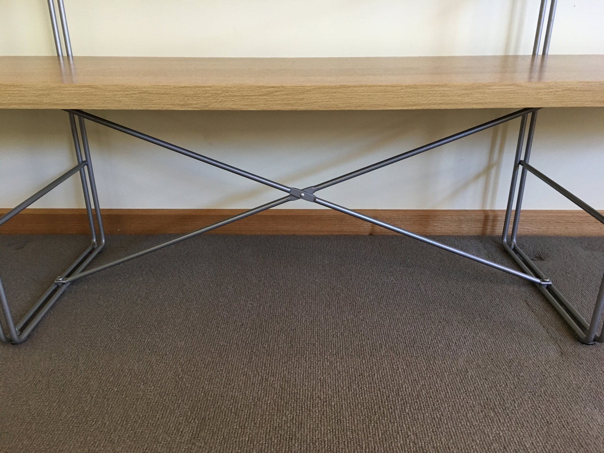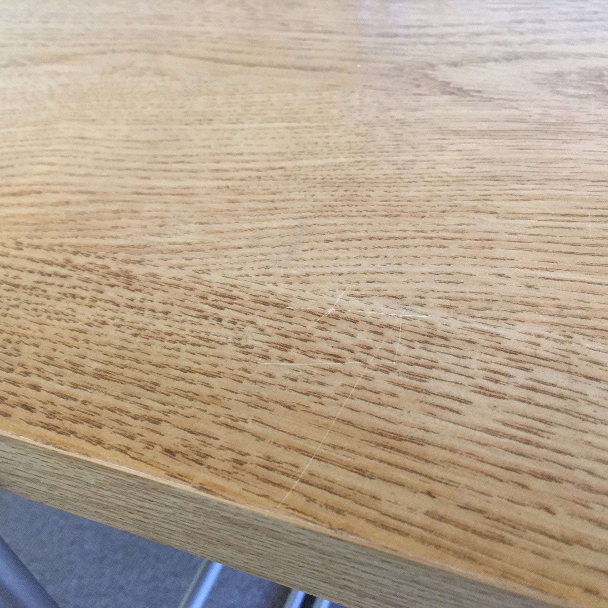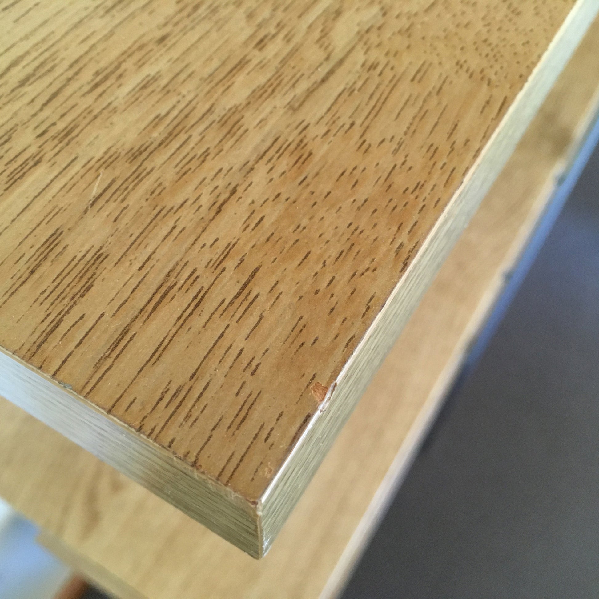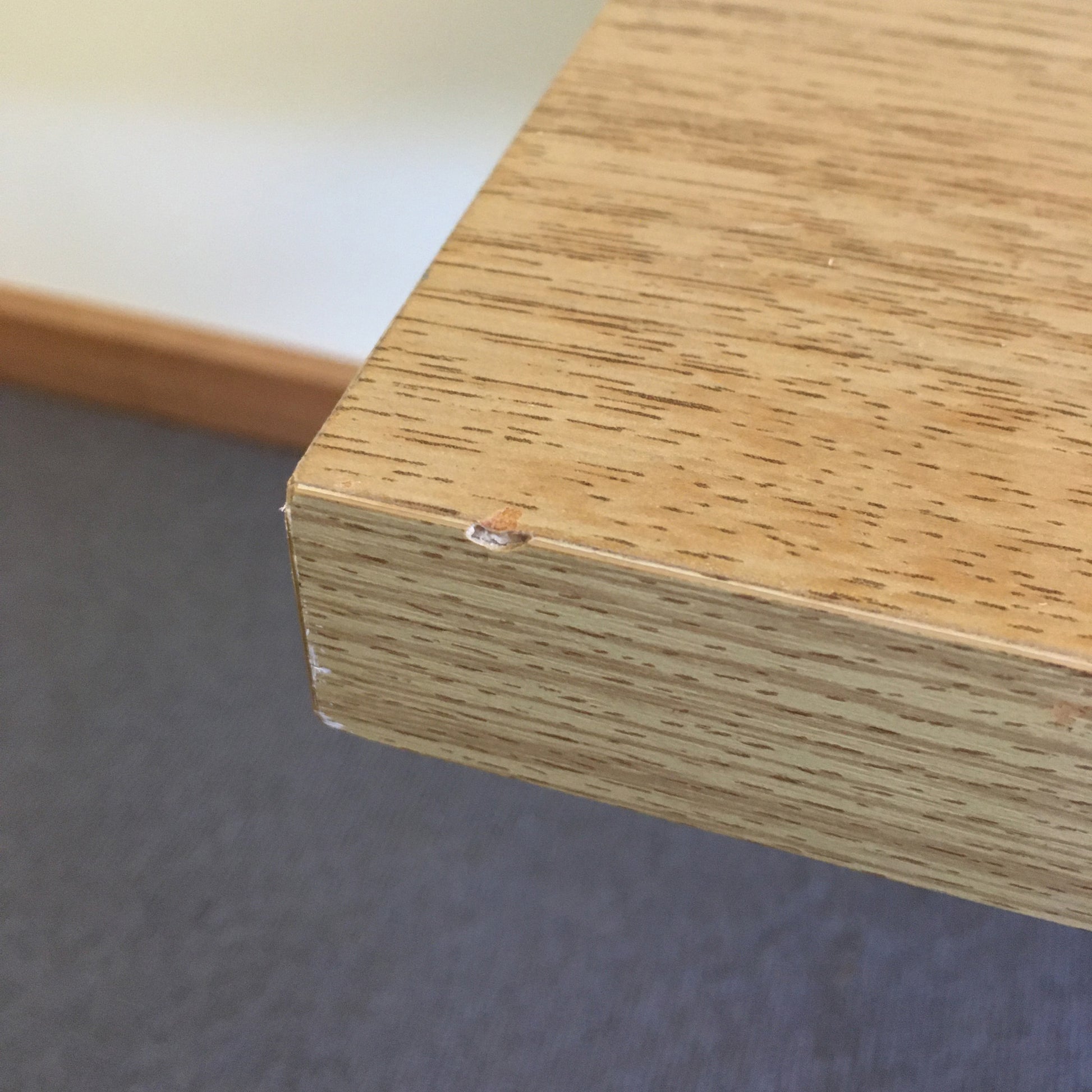 Two areas of minor swelling of oak veneer (See photos) and some minor chips and scratches to veneer. Some scuff marks/scratches across the length of the steel frame as shown in photos. One side of the steel supports has slightly bent metal.