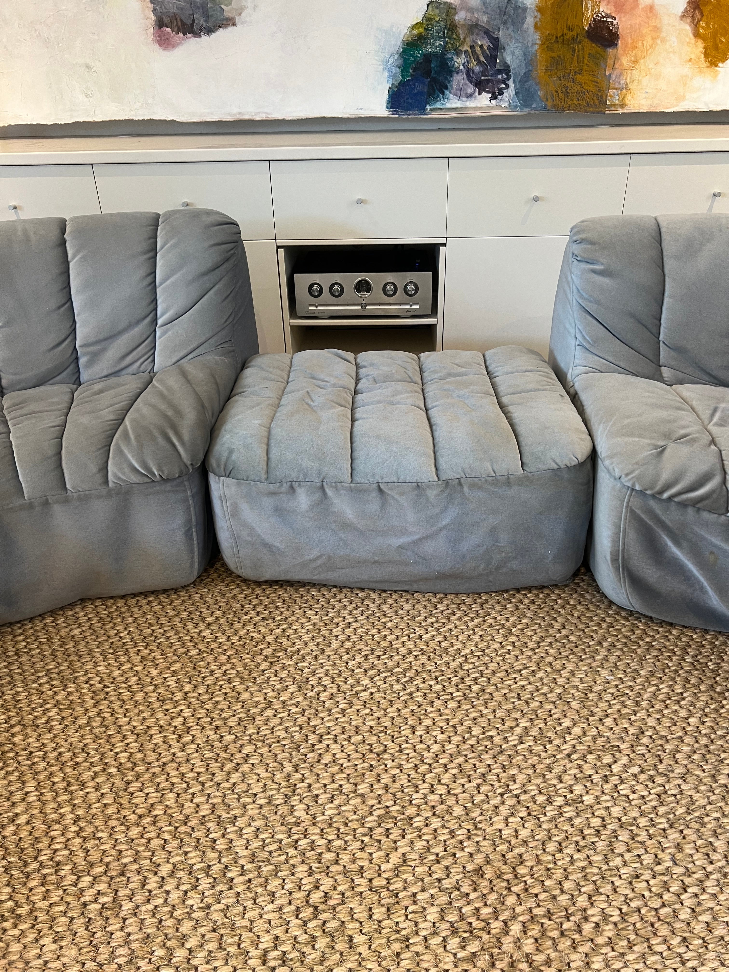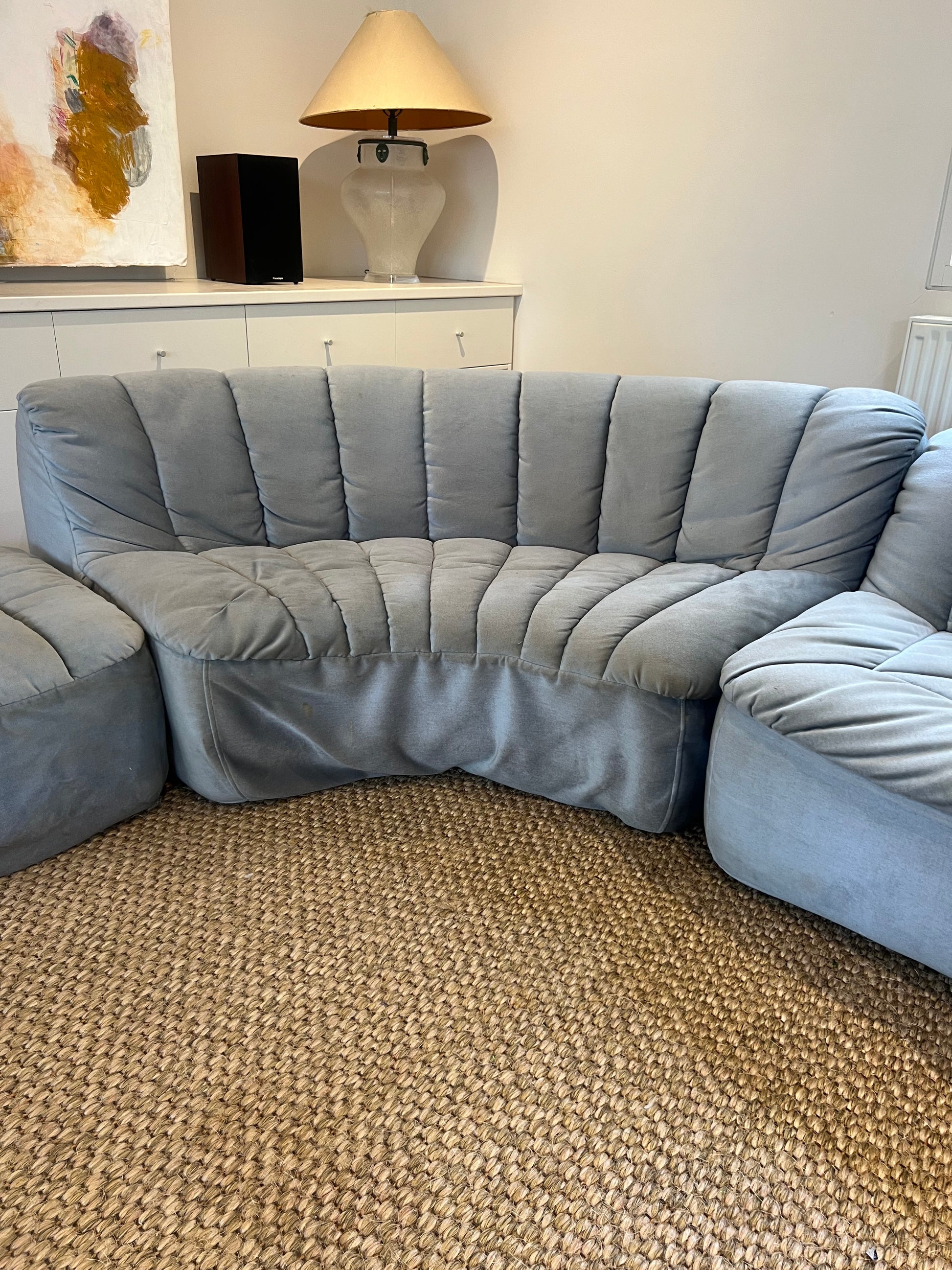 Containing two seater curved section, one corner module, one single module, and matching ottoman, which can be configured in any arrangement.