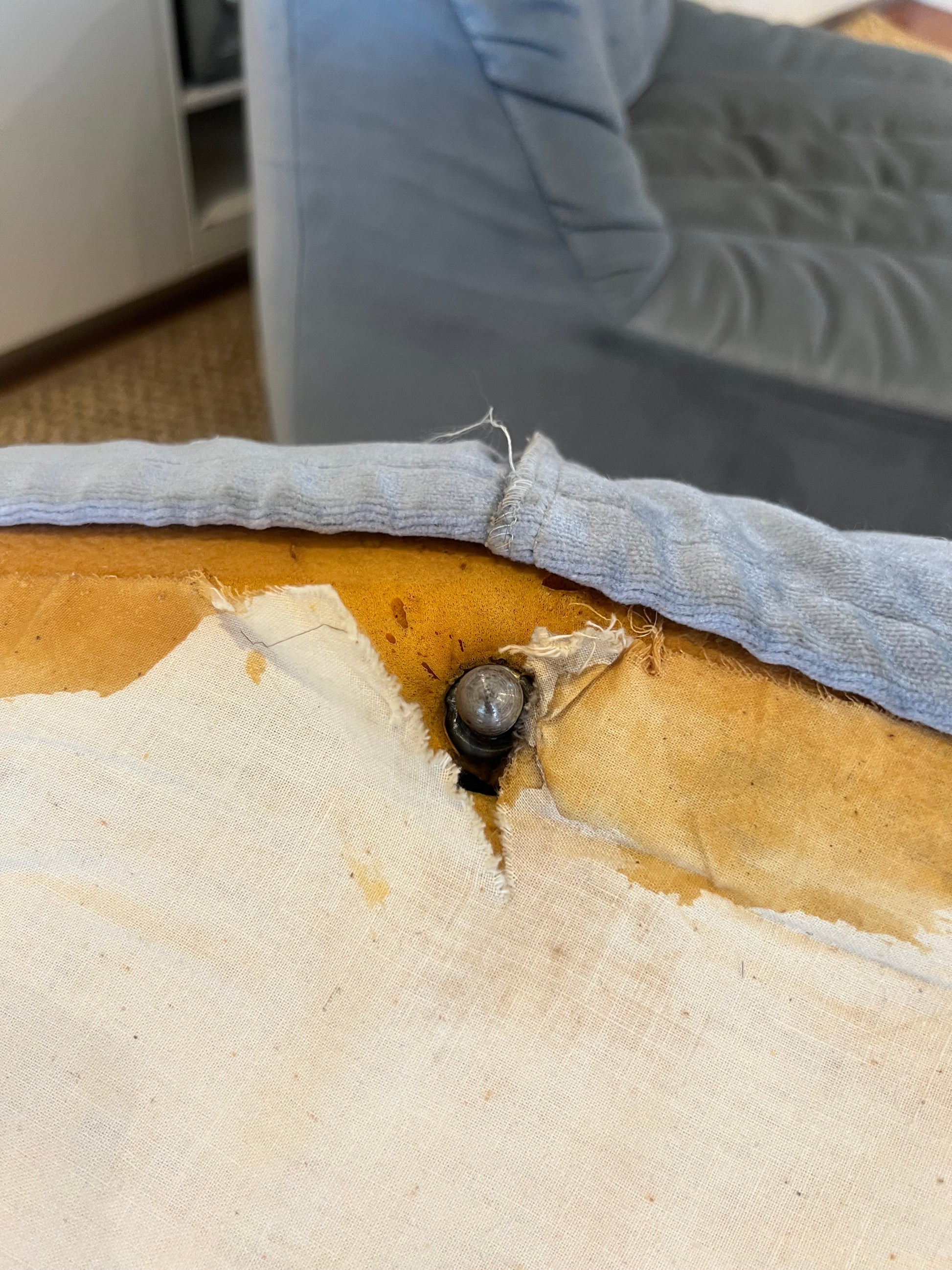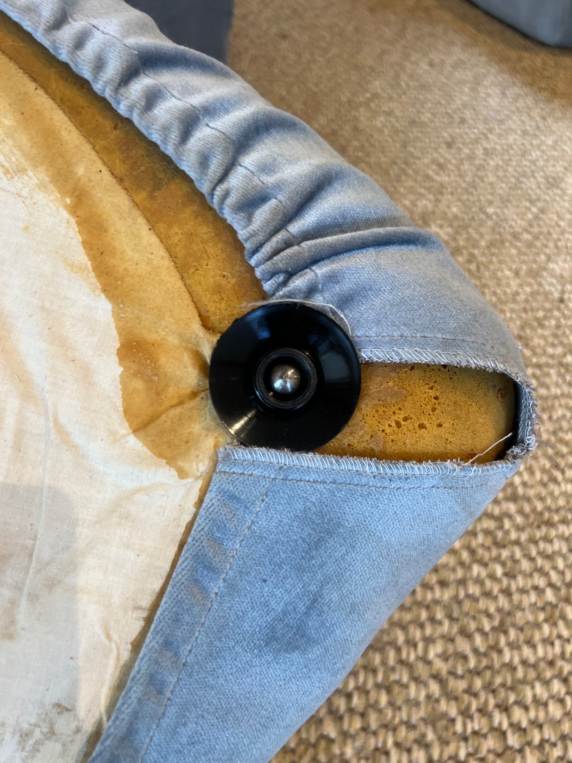 Curved Section two - a spill on the fabric - this has not yet been treated. A professional clean to the sofa is recommended. 4 out of six of the foot covers remain.