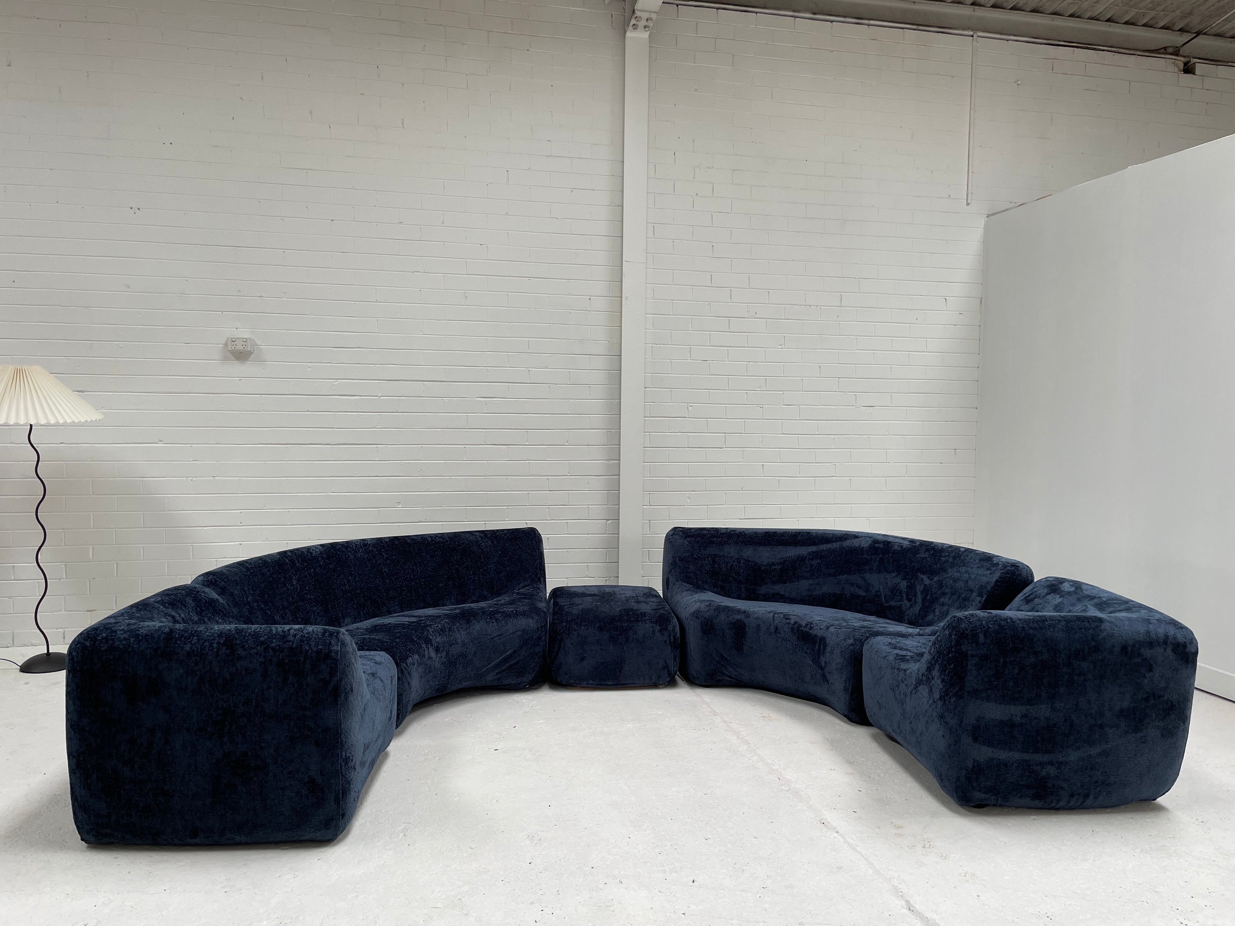 Highly collectable Featherston numero VII modular sofa, newly reupholstered in soft, midnight blue chenille velvet.