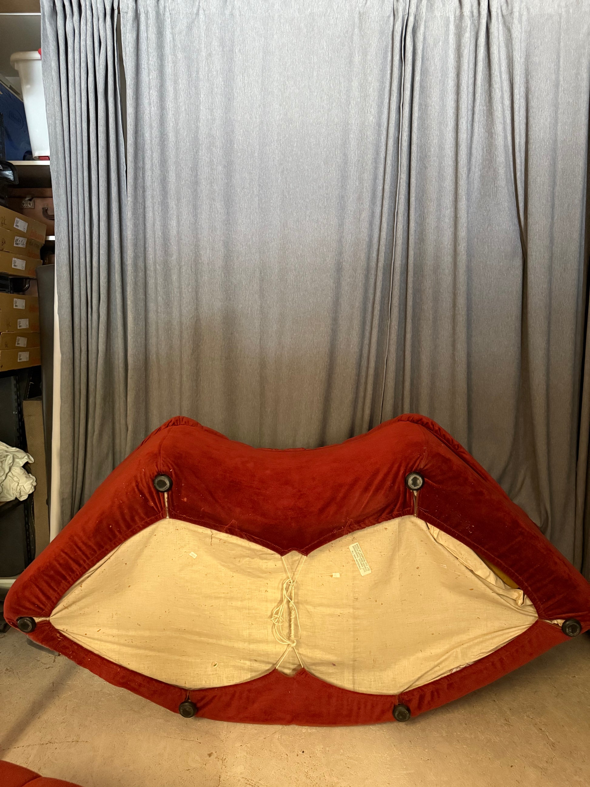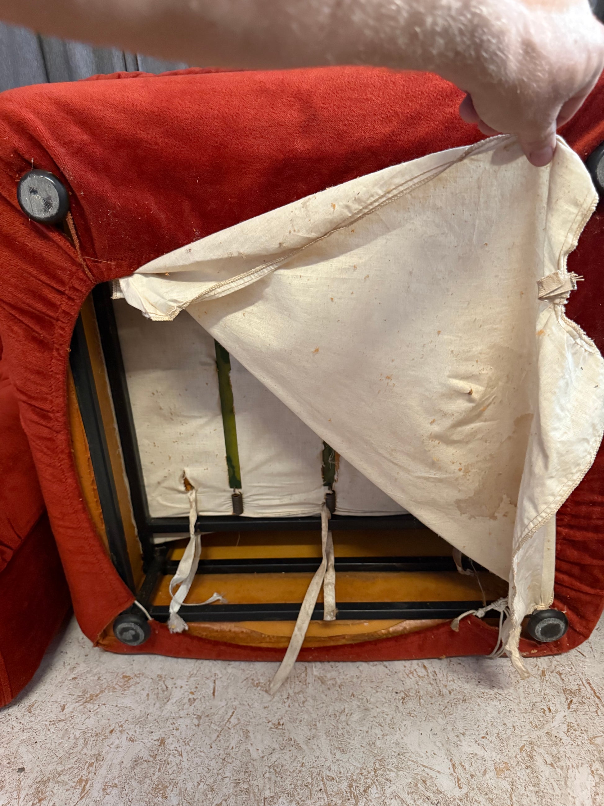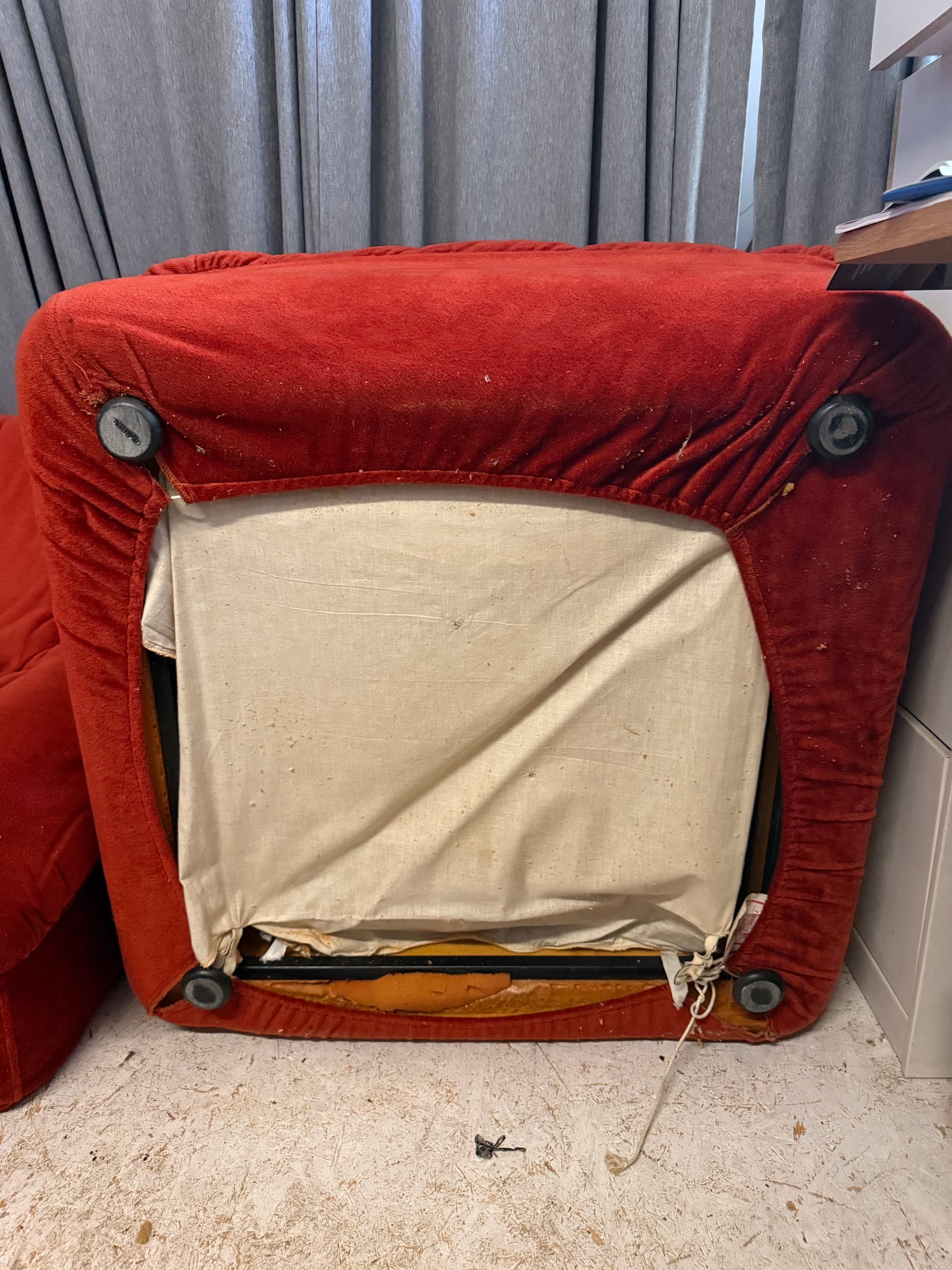 There is minor foam degradation to the underside of certain modules, where original foam has begun to slightly crumble - this is not visible in normal use and does not affect the structural integrity of the sofa. Cushions remain supportive and comfortable overall.