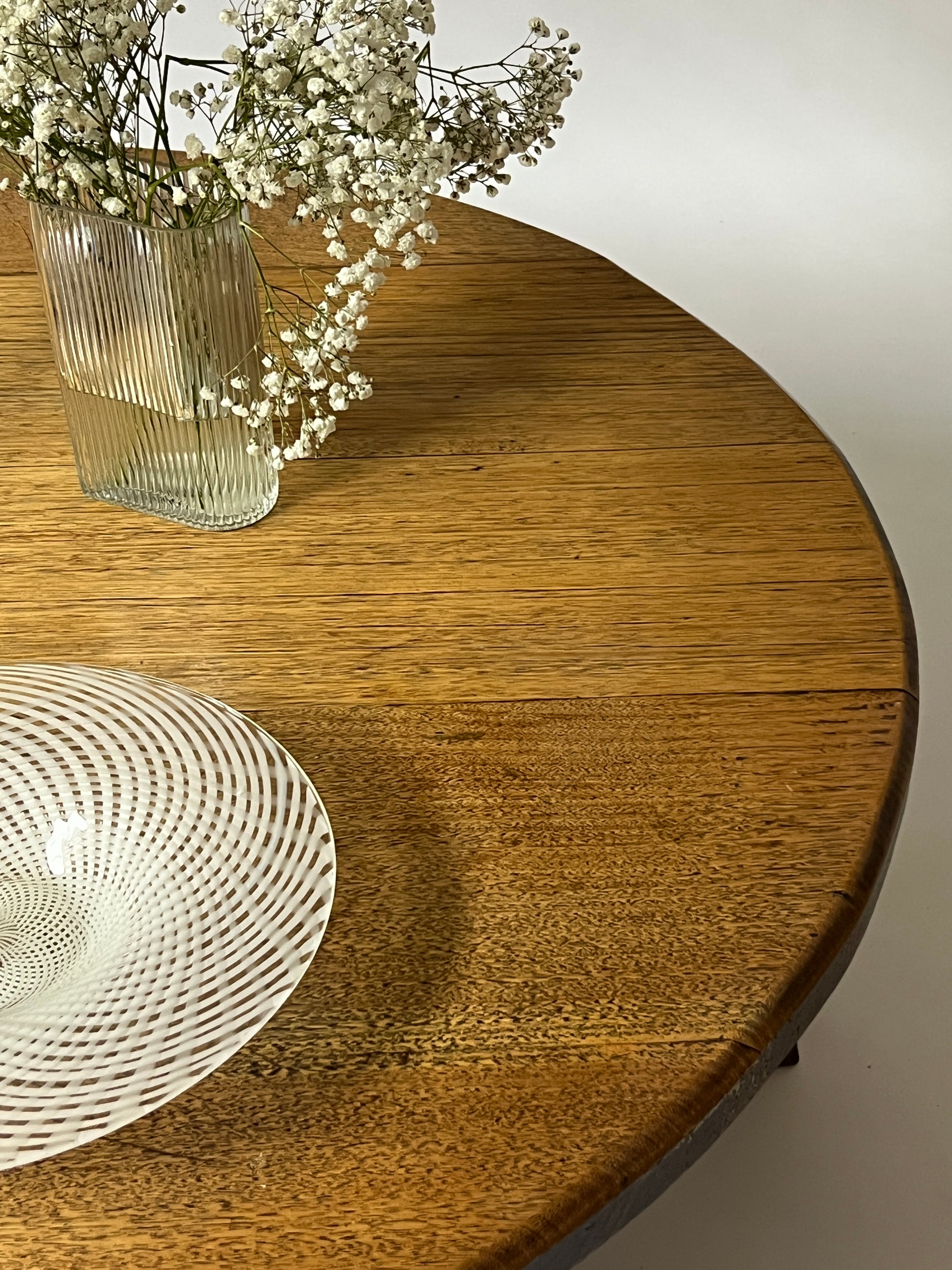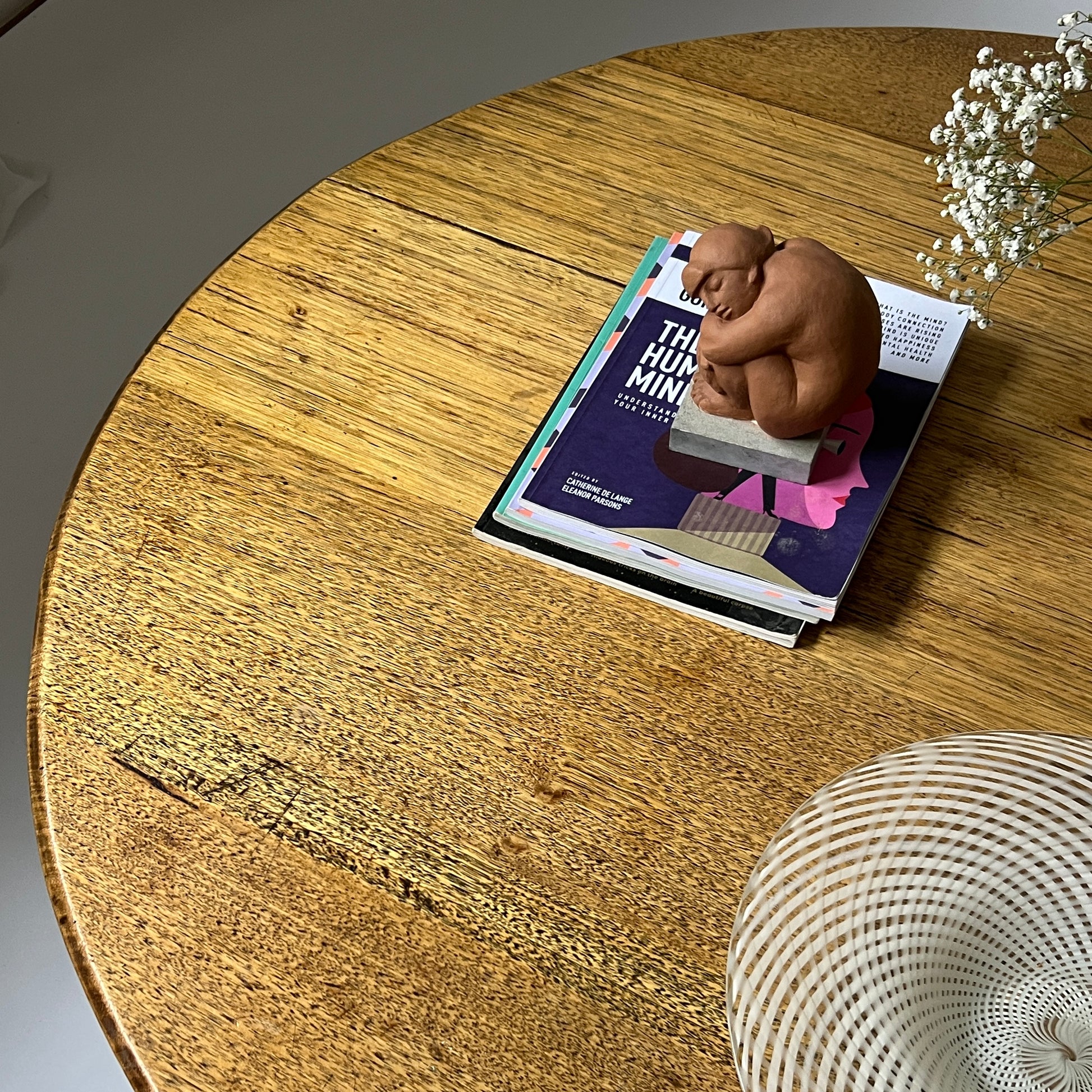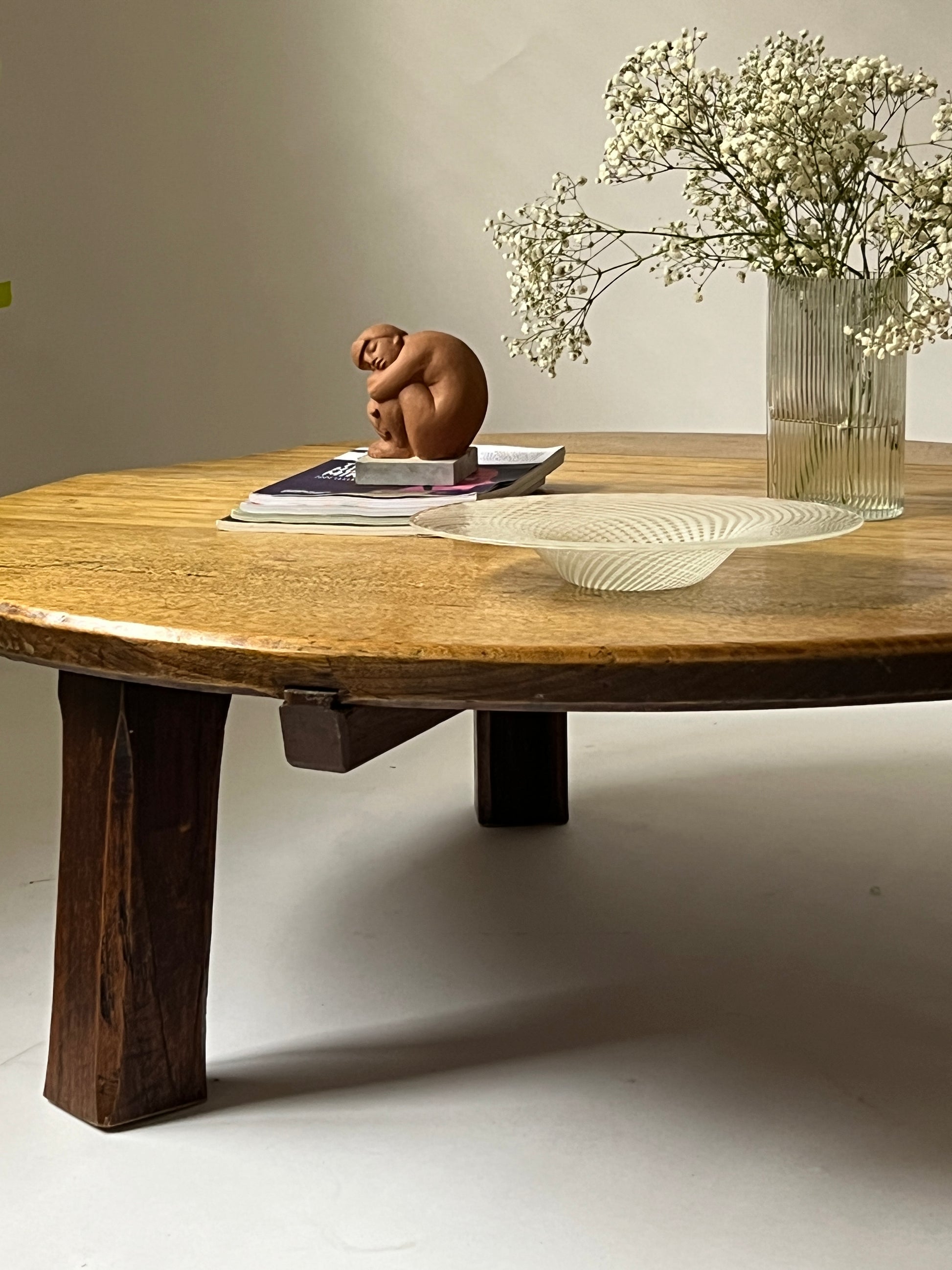 A handmade coffee table c. 1940s. Three legs hold a large circular top crafted from solid timber. The table has a lovely grain and cool hue, likely aged oak. Ample space for books, sculptures and flowers.