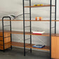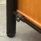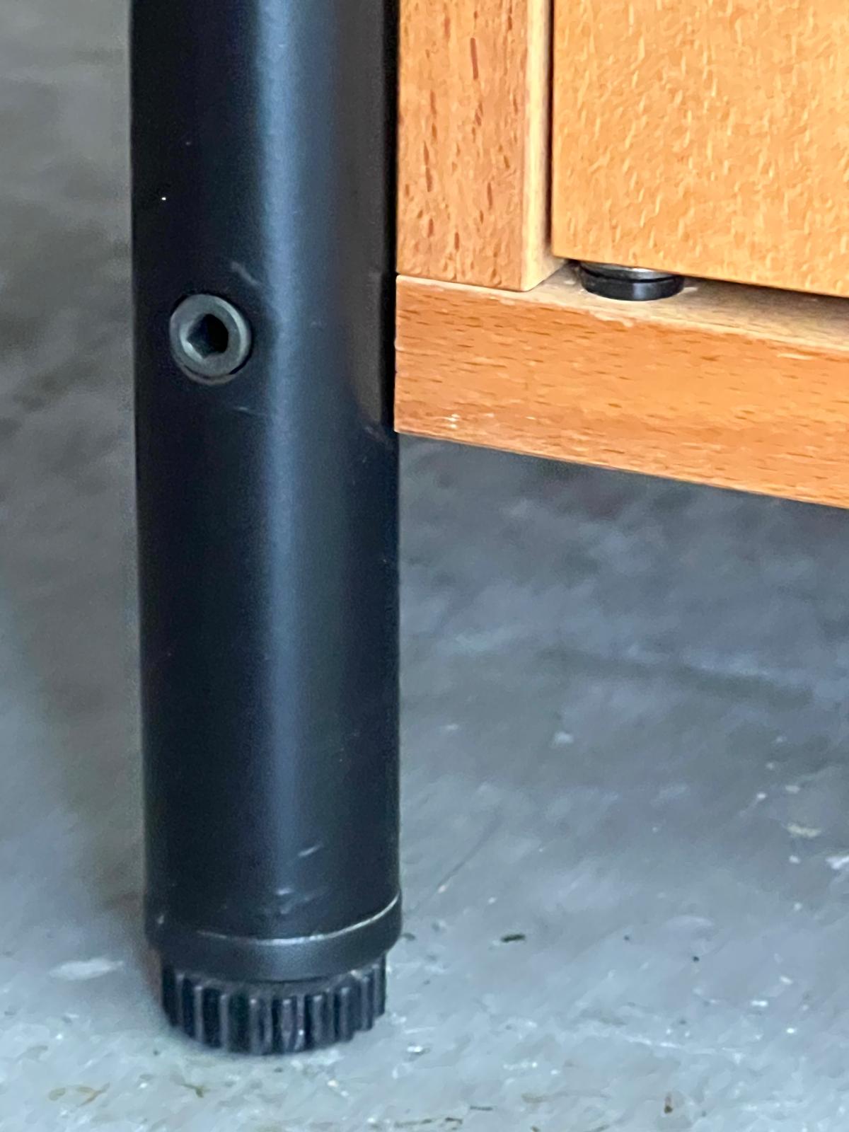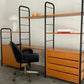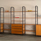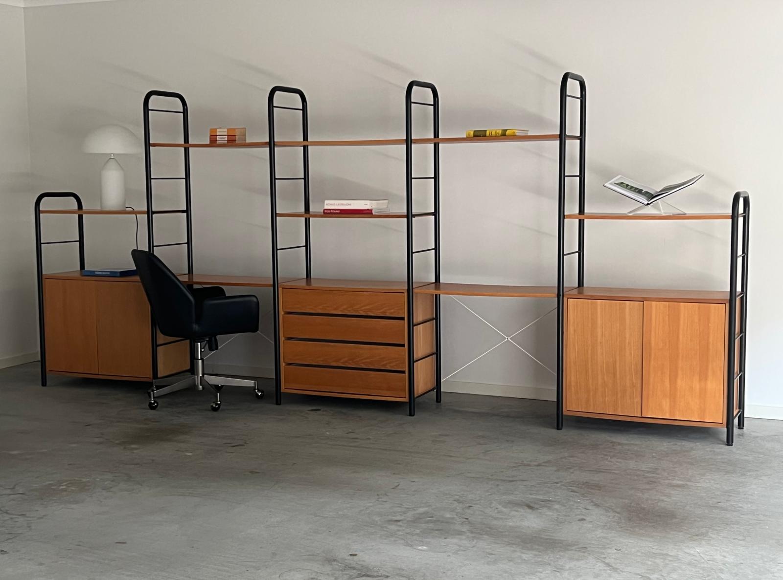 The unit features minimalist black tubular steel ladder supports paired with birch wood veneer shelves and cabinets. The shelves are height-adjustable, while the ladder supports include height-adjustable feet for stability on uneven floors.