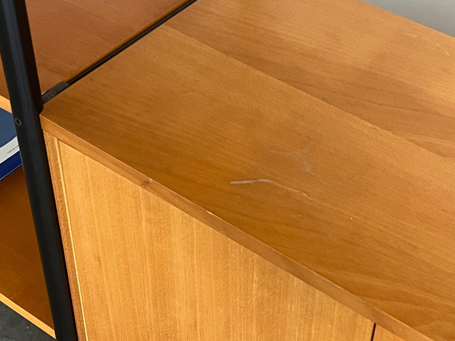Overall in very good vintage condition with light, age-appropriate wear. The wood veneer surfaces are clean and well-presented, with only minor marks and a few surface scratches consistent with gentle use. Some subtle color variations and impressions are visible on several shelves (see photos), but these do not detract from the overall presentation.