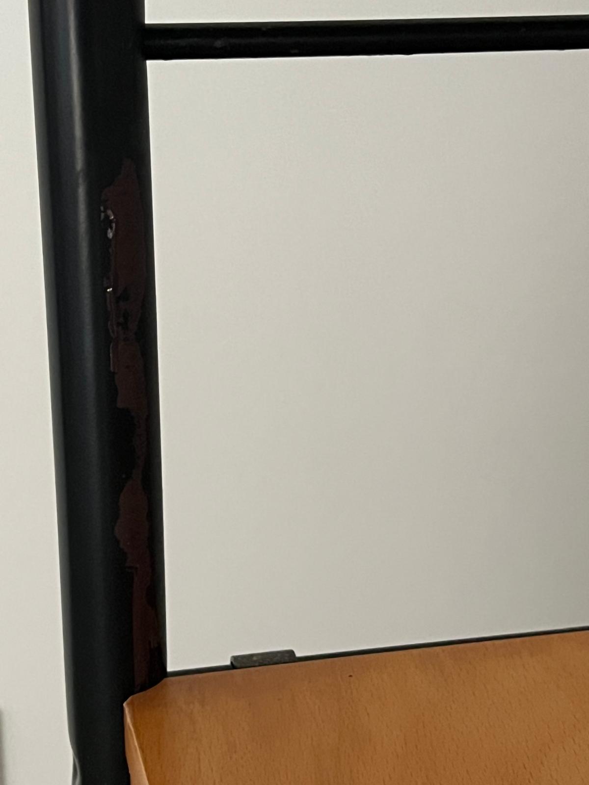 The black tubular steel supports are sturdy and largely show minimal wear, though some rungs display areas of paint flaking.